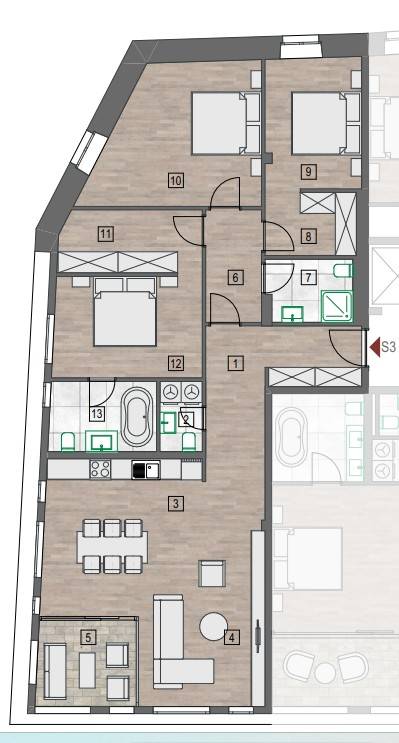 RasporedStan ima ukupnu stambenu površinu od približno 122 m² te izuzetno promišljen i funkcionalan raspored. Ulazni prostor vodi prema zasebnom gostinjskom WC-u, nakon čega se otvara prostrani dnevni dio koji objedinjuje kuhinju, blagovaonicu i veliki dnevni boravak. Daljnjim hodnikom odvojena je noćna zona koja se sastoji od tri spavaće sobe, dvije kupaonice te walk-in ormara. Prostrana loggia prirodni je produžetak dnevnog prostora i mjesto s kojeg se pruža jedan od najljepših panoramskih pogleda u cijelom Šibeniku.