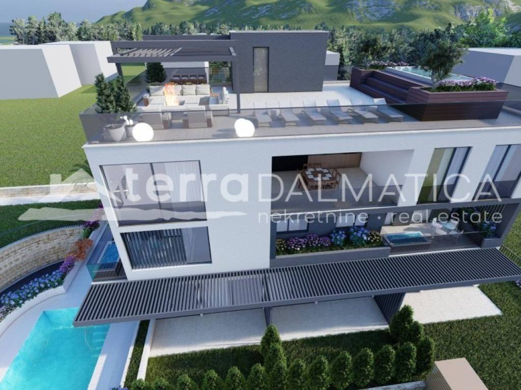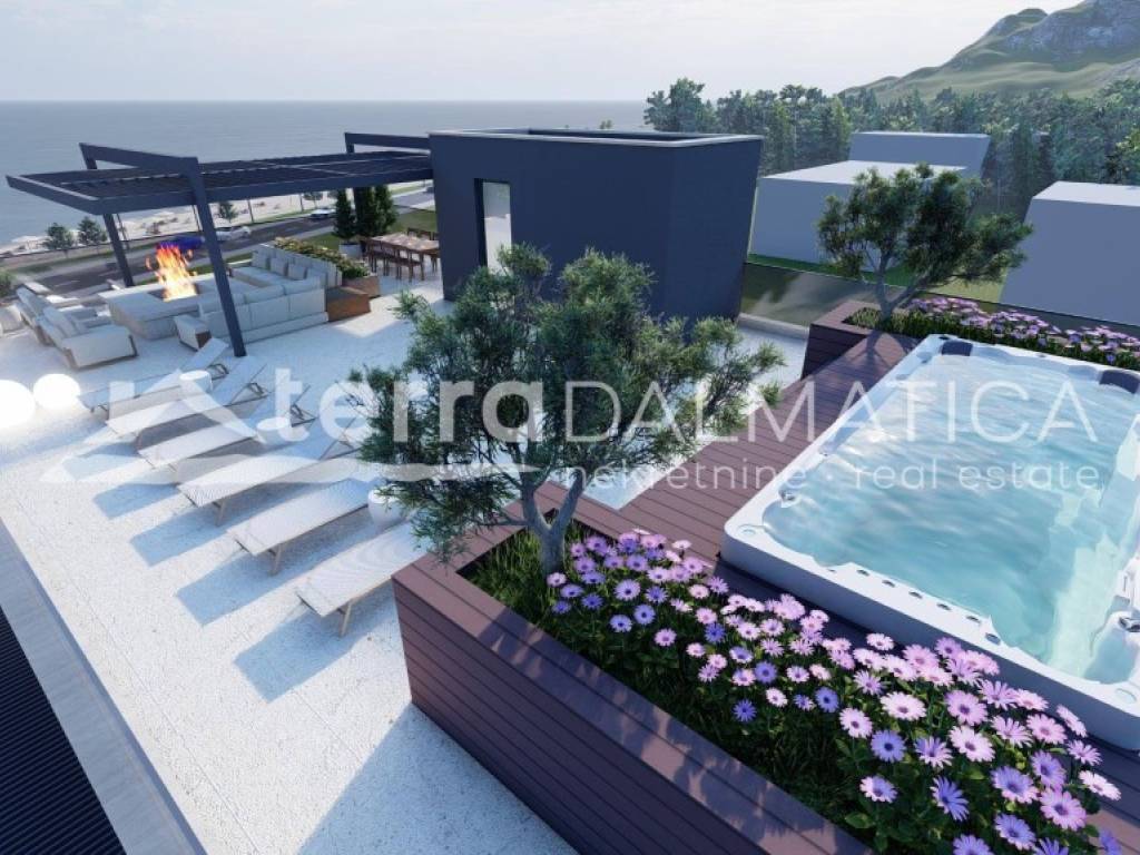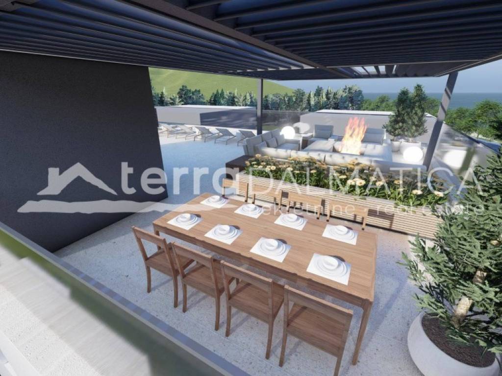 Posebna vrijednost ovog apartmana je impresivna krovna terasa površine 197,45 m², koja nudi brojne mogućnosti uređenja prema osobnim željama – od privatnog sunčališta, lounge zone i prostora za roštilj, do ekskluzivne zone za opuštanje i druženje s obitelji i prijateljima. S terase se pruža otvoren, panoramski pogled na more, koji dodatno naglašava luksuz i jedinstvenost ove nekretnine.
