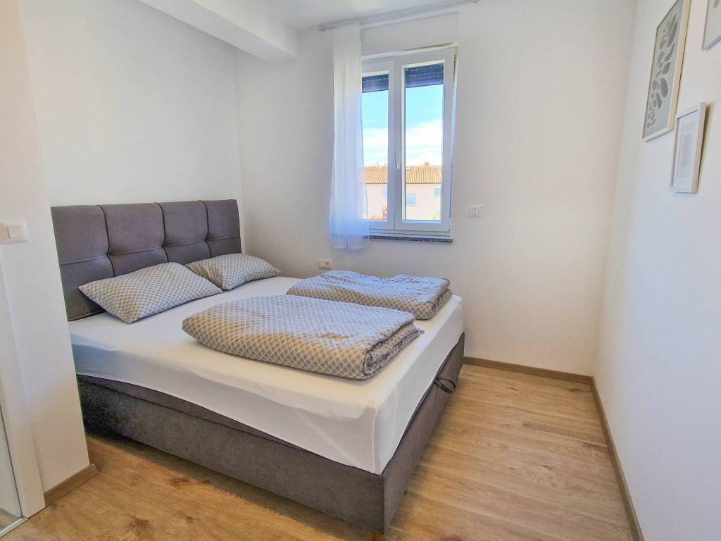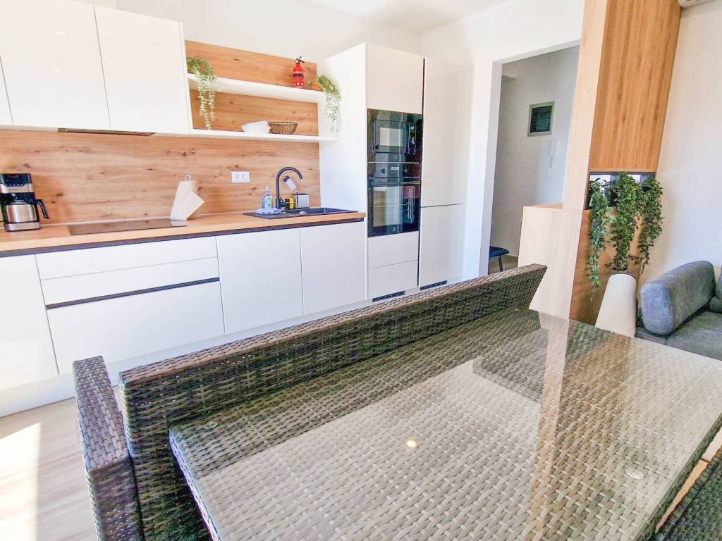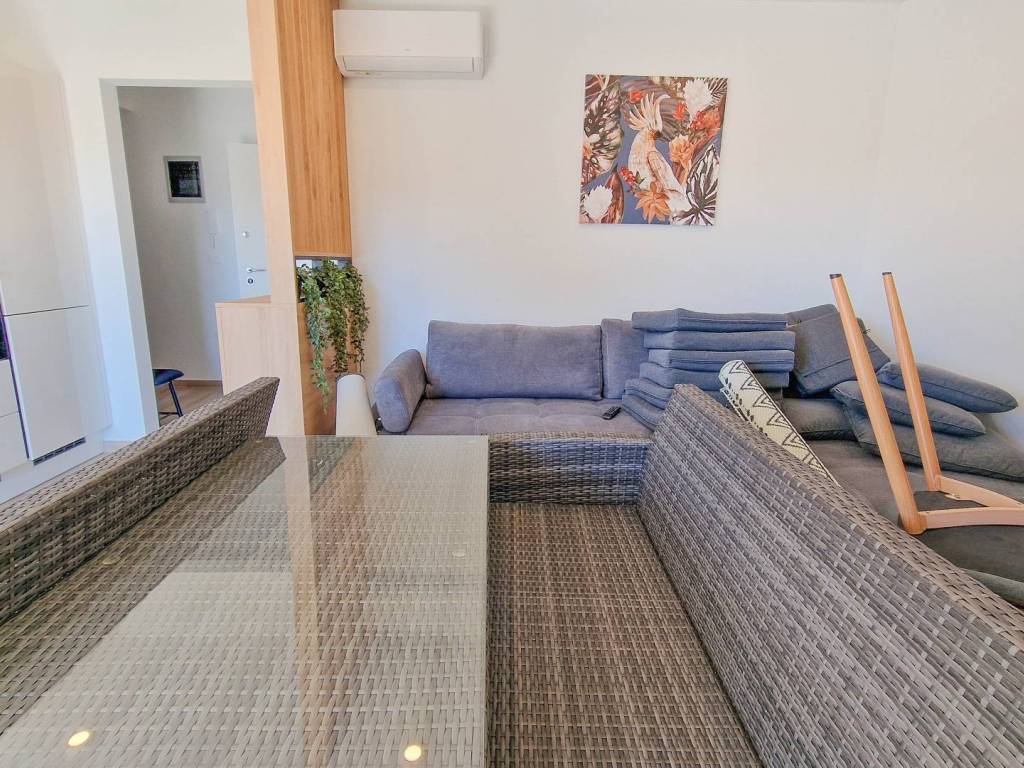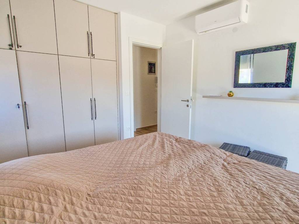 Prekrasan, kvalitetno opremljen dvosobni stan s vrtom i bazenom. Stan se sastoji od prostranog dnevnog boravka s kuhinjom i blagovaonicom, velike terase s pogledom na more, dvije spavaće sobe, kupaonice i hodnika. U vlasništvu su i dva parkirna mjesta. Stan se prodaje potpuno namješten te je opremljen s tri klima jedinice i podnim grijanjem, što osigurava udobnost tijekom cijele godine.