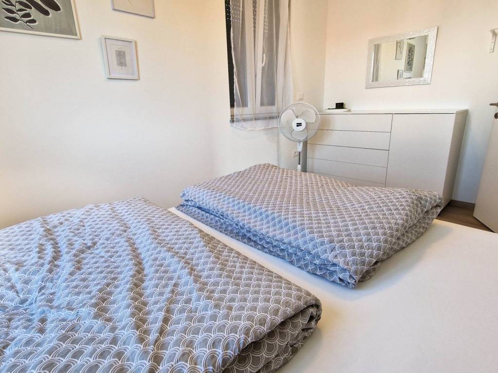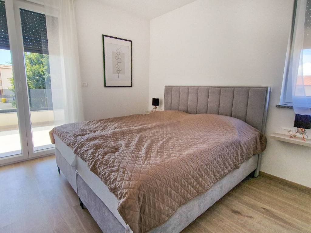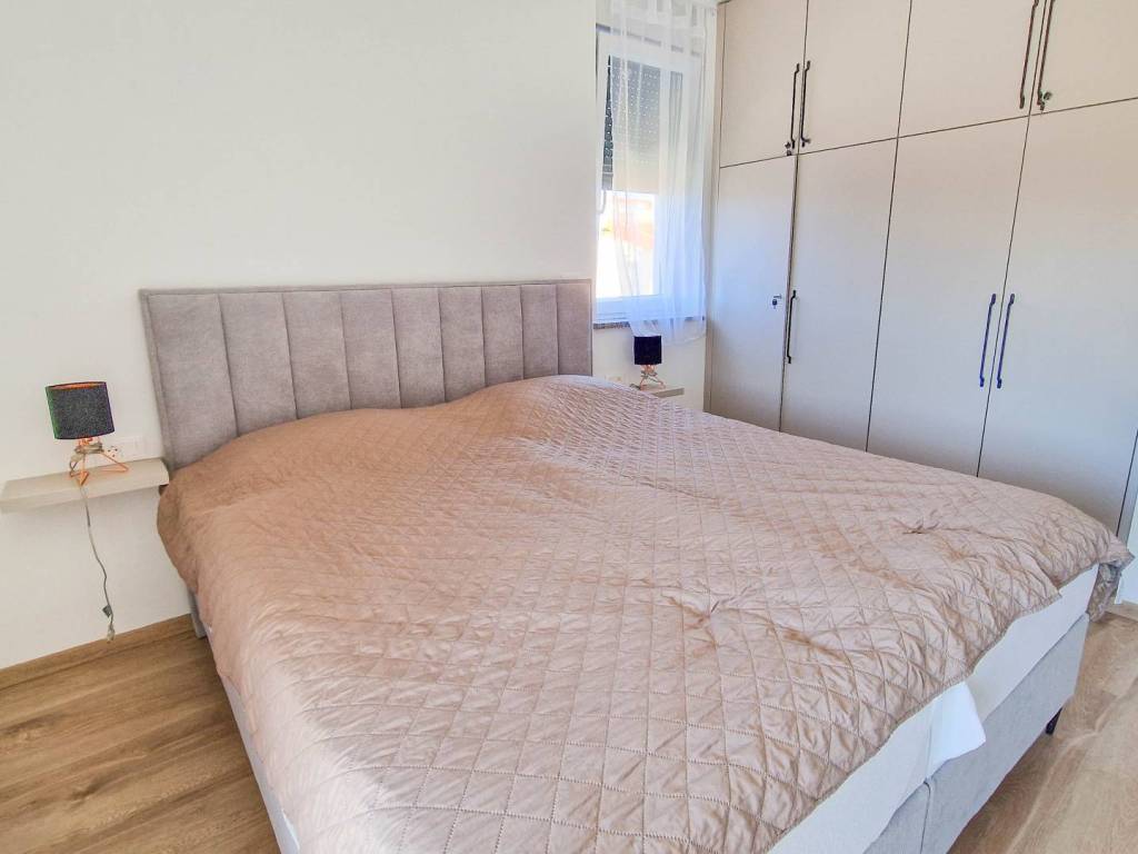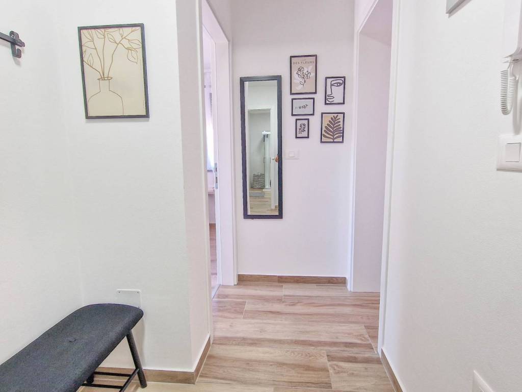 Prekrasan, kvalitetno opremljen dvosobni stan s vrtom i bazenom. Stan se sastoji od prostranog dnevnog boravka s kuhinjom i blagovaonicom, velike terase s pogledom na more, dvije spavaće sobe, kupaonice i hodnika. U vlasništvu su i dva parkirna mjesta. Stan se prodaje potpuno namješten te je opremljen s tri klima jedinice i podnim grijanjem, što osigurava udobnost tijekom cijele godine.
