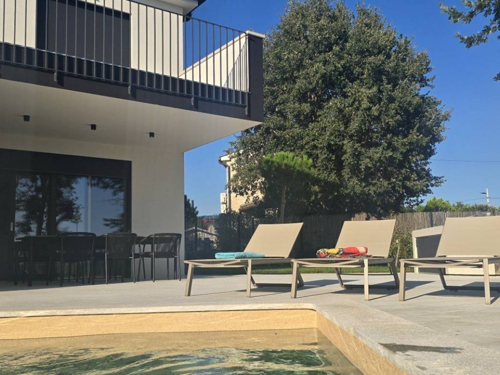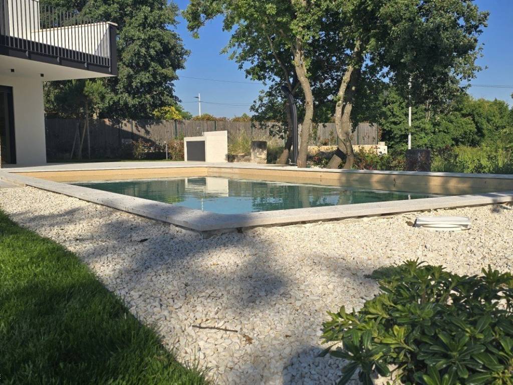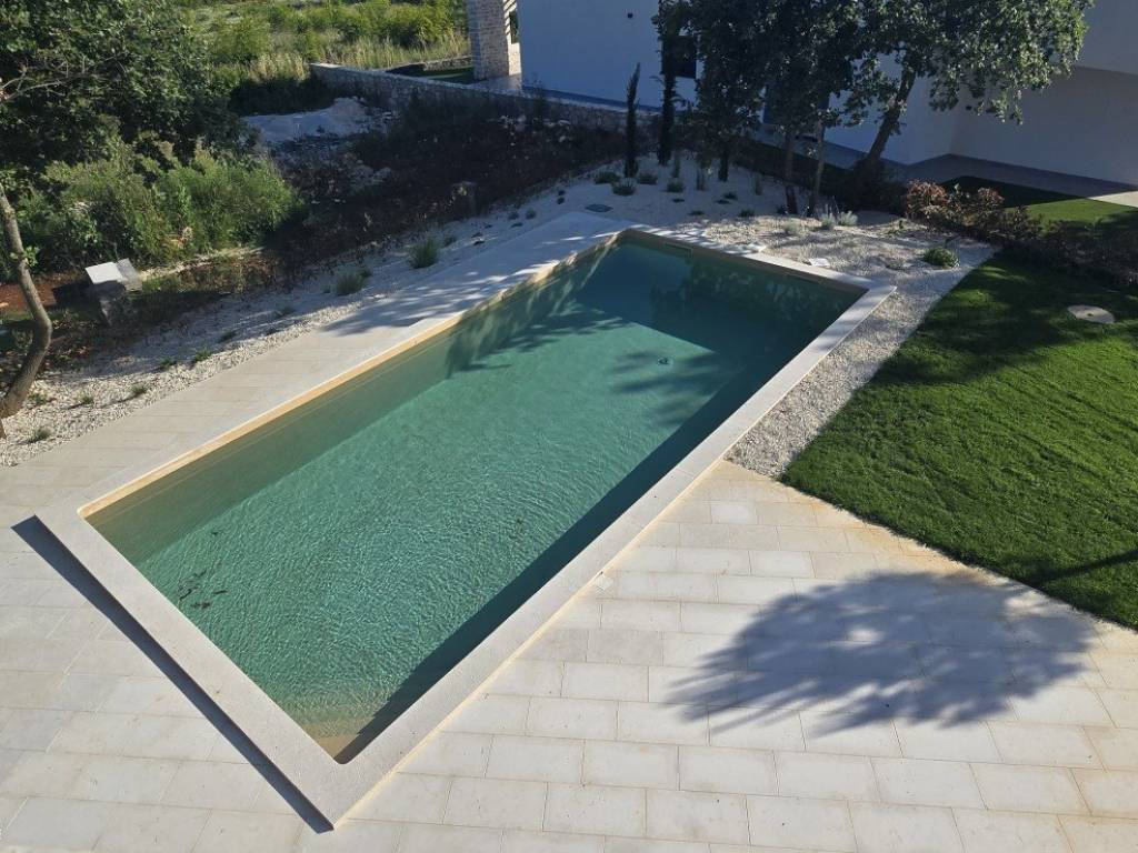 Vila ima svoj privatni bazen, obložen modernom folijom RENOLIT ALKORPLAN TOUCH u boji Relax, koja vodi daje prirodnu i osvježavajuću nijansu. Sve strojarnice bazena smještene su unutar kuće, čime je olakšano održavanje i spriječeni problemi s vlagom. Po želji je moguće ugraditi i dodatnu dizalicu topline za grijanje vode u bazenu.