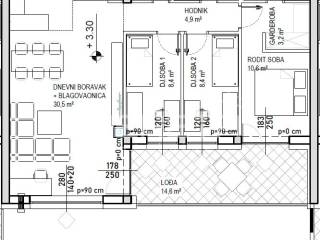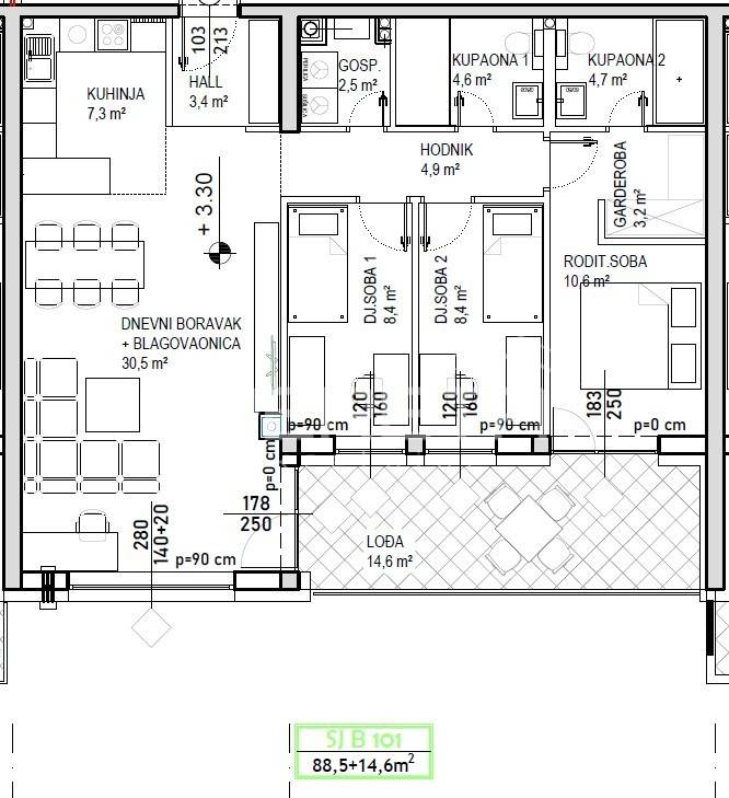 Prodaje se stan površine 88,5 m2 s lođom površine 14,6 m2 na 1. katu niskoenergetske stambeno poslovne zgrade na odličnoj lokaciji. Zgrada se sastoji od podruma, visokog prizemlja, prvog, drugog i trećeg kata te sadrži ukupno 74 stambene jedinice i 7 poslovnih prostora. Završetak gradnje predviđen je krajem 2025./početak 2026. Energetski razred je A+. Moguć je odabir podnih obloga (keramika, parket ili laminat) te odabir unutarnje stolarije. Uz stan moguća je kupovina vanjskog parkirnog mjesta, garažnog mjesta bez spremišta ili garažnog mjesta sa spremištem.