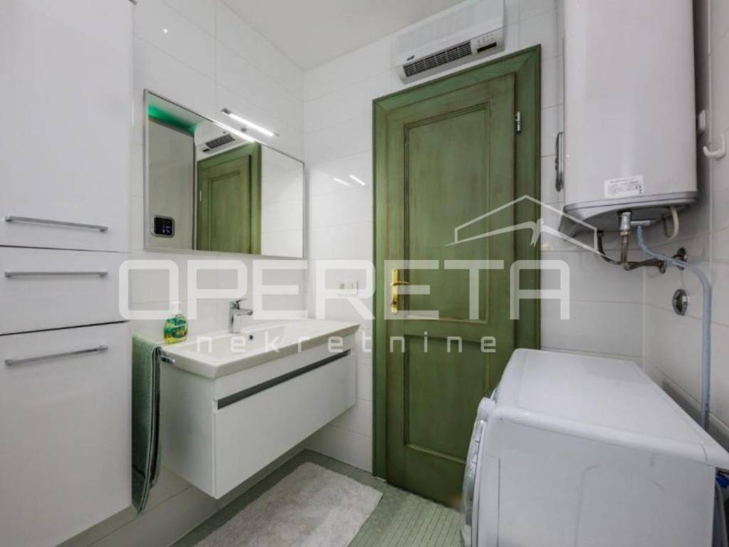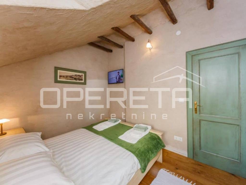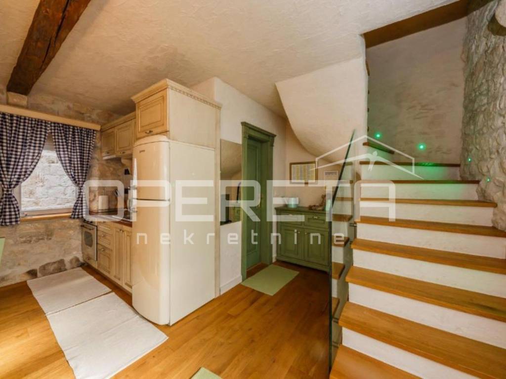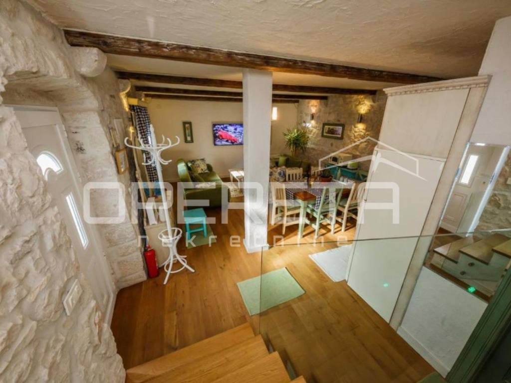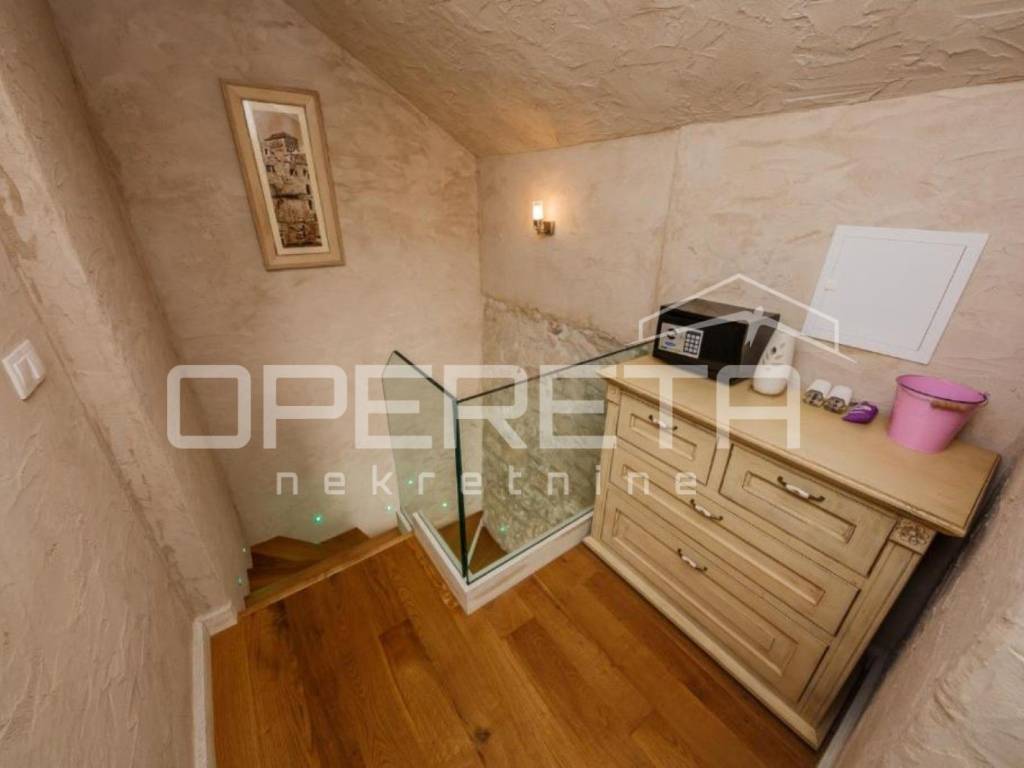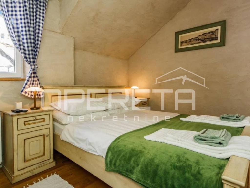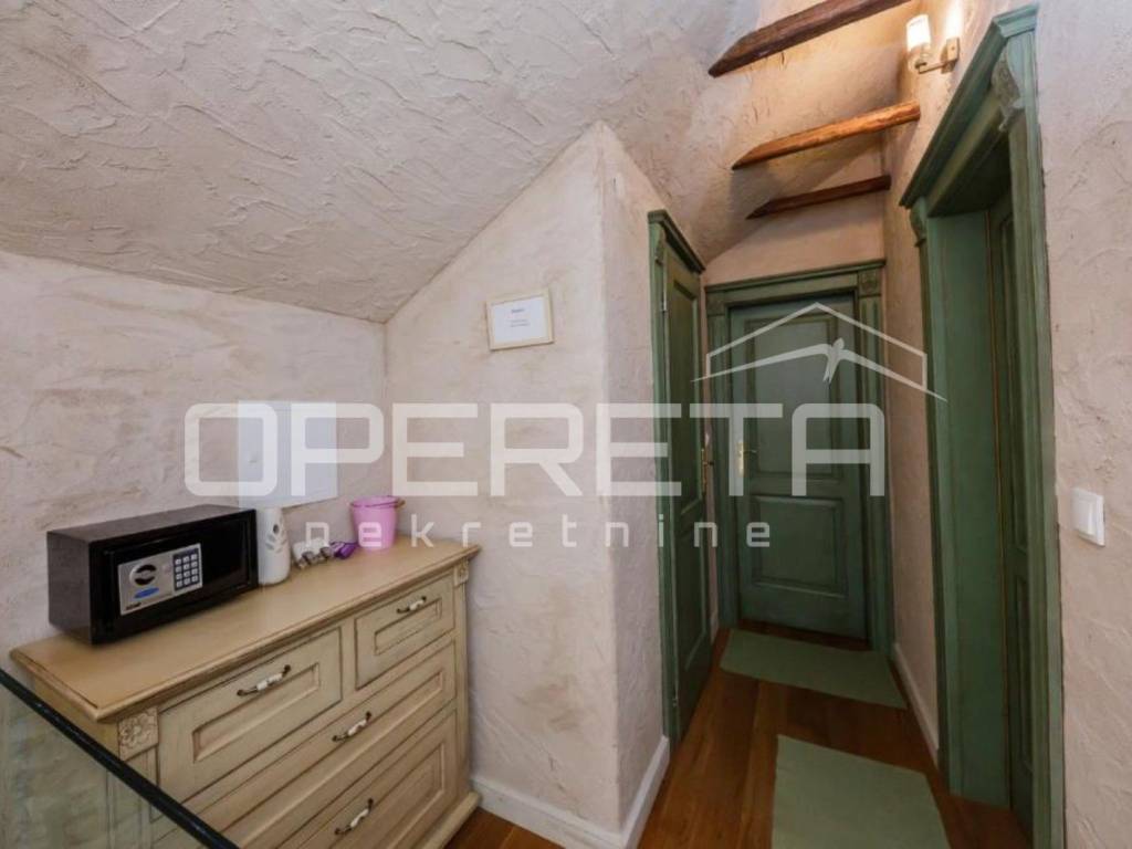 U visokom potkrovlju smještene su dvije spavaće sobe, hodnik i dodatni toalet, što osigurava mir i privatnost. Kombinacija tradicionalnih materijala i suvremenog dizajna stvara ugodan, harmoničan ambijent. Renovacija je izvedena uz korištenje kvalitetnih materijala hrastovi podovi i vrata izrađena po mjeri te pažljivo birani detalji koji naglašavaju autentičnost prostora.