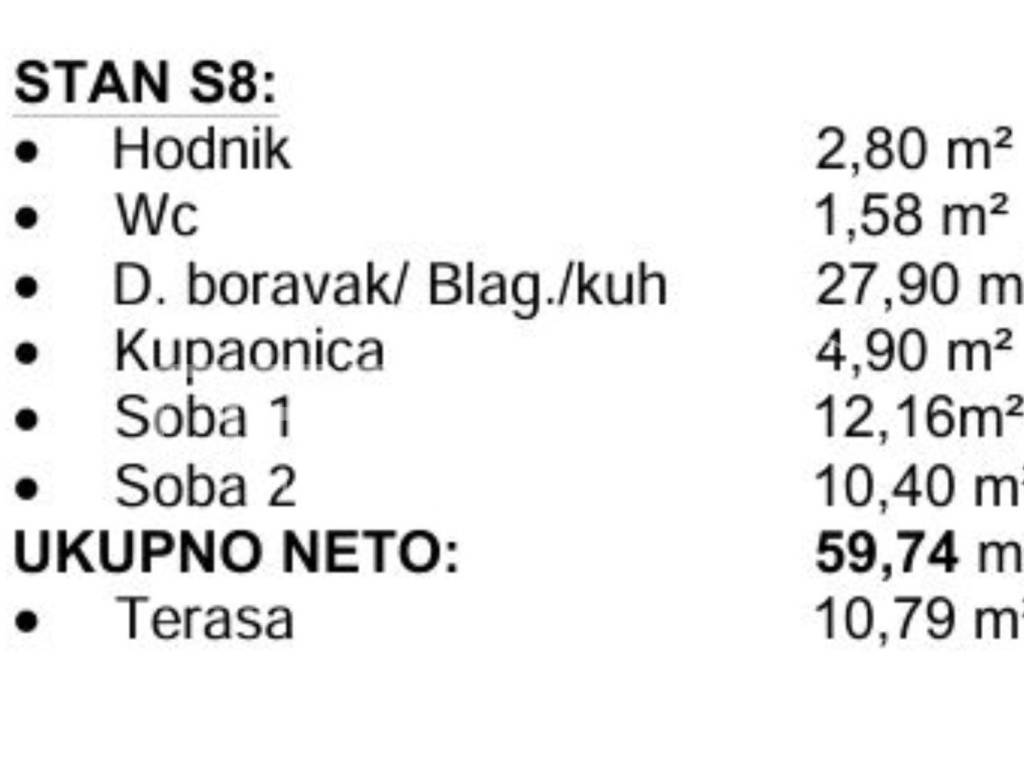 Stan S8 smješten je na 1. katu i prostire se na 59,74m pažljivo osmišljenog prostora koji uključuje: hodnik, wc, kupaonicu, prostran dnevni boravak povezan s kuhinjom, 2 spavaće sobe te terasu površine 10,79m2 (koef. 0,50=5,39m2) za opuštanje.