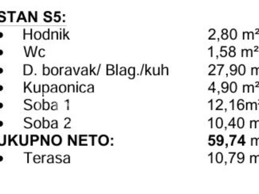 Stan S5 smješten je u prizemlju i prostire se na 59,74m pažljivo osmišljenog prostora koji uključuje: hodnik, wc, kupaonicu, prostran dnevni boravak povezan s kuhinjom, 2 spavaće sobe te terasu površine 10,79m2 (koef. 0,50=5,39m2) za opuštanje.