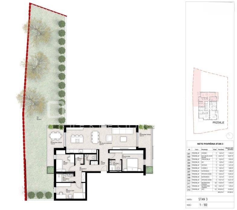 stan S3 u prizemlju, neto površine 135,99 m, s pažljivo osmišljenim rasporedom: tri prostrane spavaće sobe, prostrani dnevni boravak, kuhinja s blagovaonicom, 2 kupaonice, Wc, hodnik, predosoblje, ostava, 2 natkrivene terase od 10m2 i 13,67m2 i vrt od 163,89m2 za uživanje u pogledu i miru.