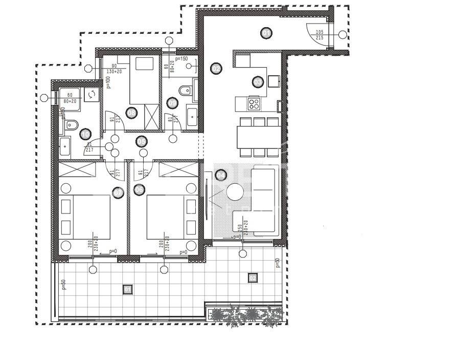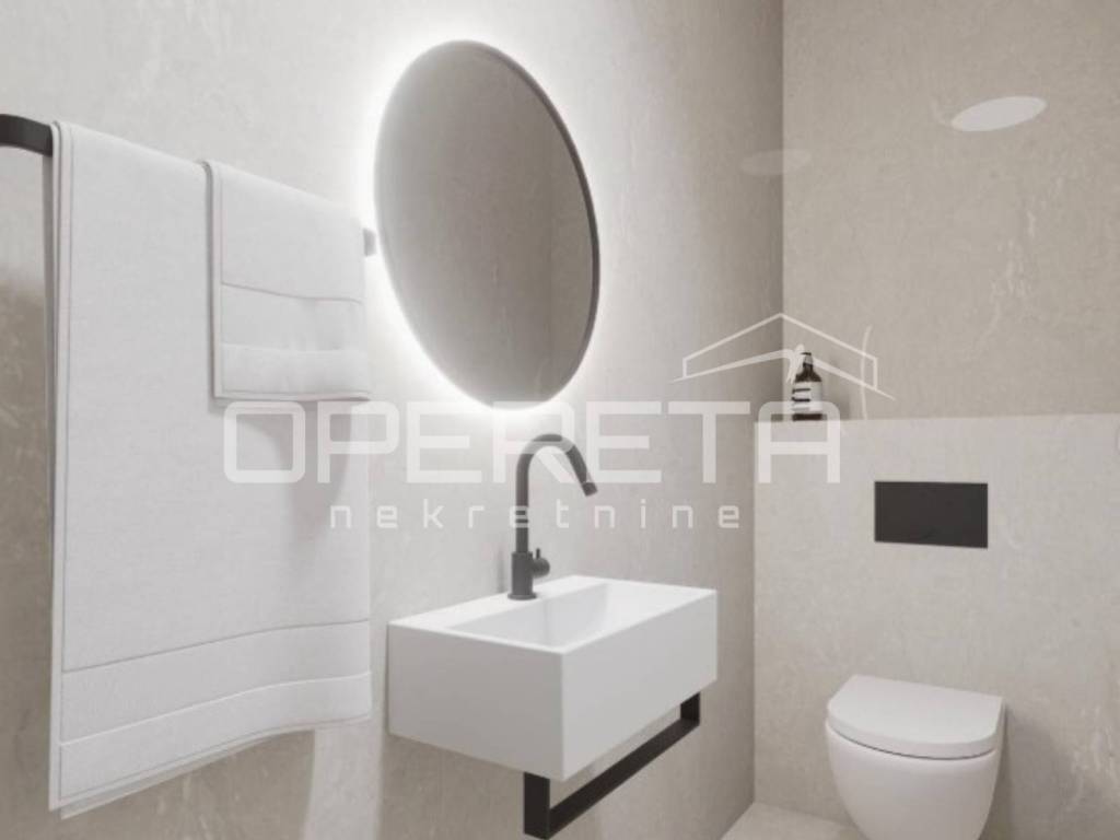 Tlocrt je promišljen i funkcionalan. Neto korisna površina stana iznosi 83,53 m, čineći ga najvećim stanom na katu s tri stana. Ulaz vodi u svijetlu dnevnu zonu otvorenog koncepta u kojoj se kuhinja, blagovaonica i dnevni boravak logično nadovezuju i orijentirani su prema zapadu i jugu, što osigurava obilje prirodnog svjetla. Dvije komforne spavaće sobe smještene su u mirnijem dijelu stana, dok raspored kupaonica (stan ima dvije kupaonice s WC-om) podiže svakodnevnu funkcionalnost i privatnost.