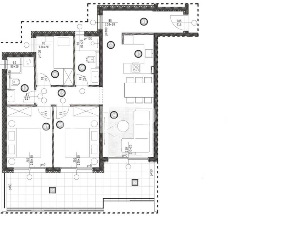 Tlocrt je promišljen i funkcionalan. Neto korisna površina stana iznosi 83,53 m, čineći ga najvećim stanom na katu s tri stana. Ulaz vodi u svijetlu dnevnu zonu otvorenog koncepta u kojoj se kuhinja, blagovaonica i dnevni boravak logično nadovezuju i orijentirani su prema zapadu i jugu, što osigurava obilje prirodnog svjetla. Dvije komforne spavaće sobe smještene su u mirnijem dijelu stana, dok raspored kupaonica (stan ima dvije kupaonice s WC-om) podiže svakodnevnu funkcionalnost i privatnost.