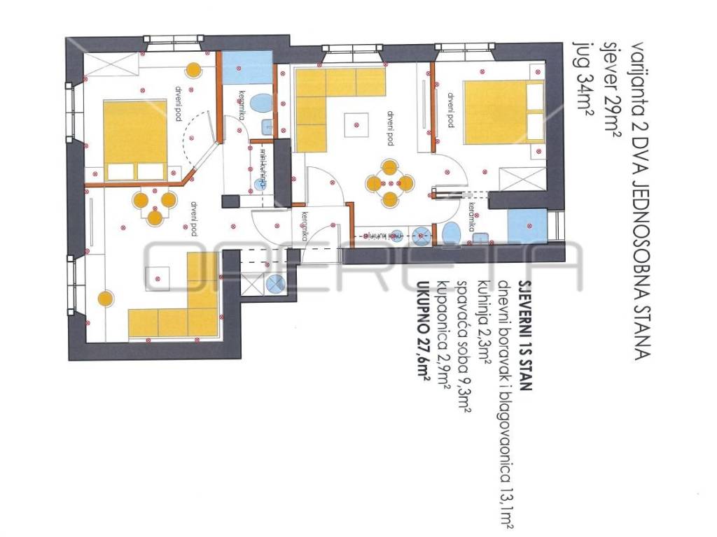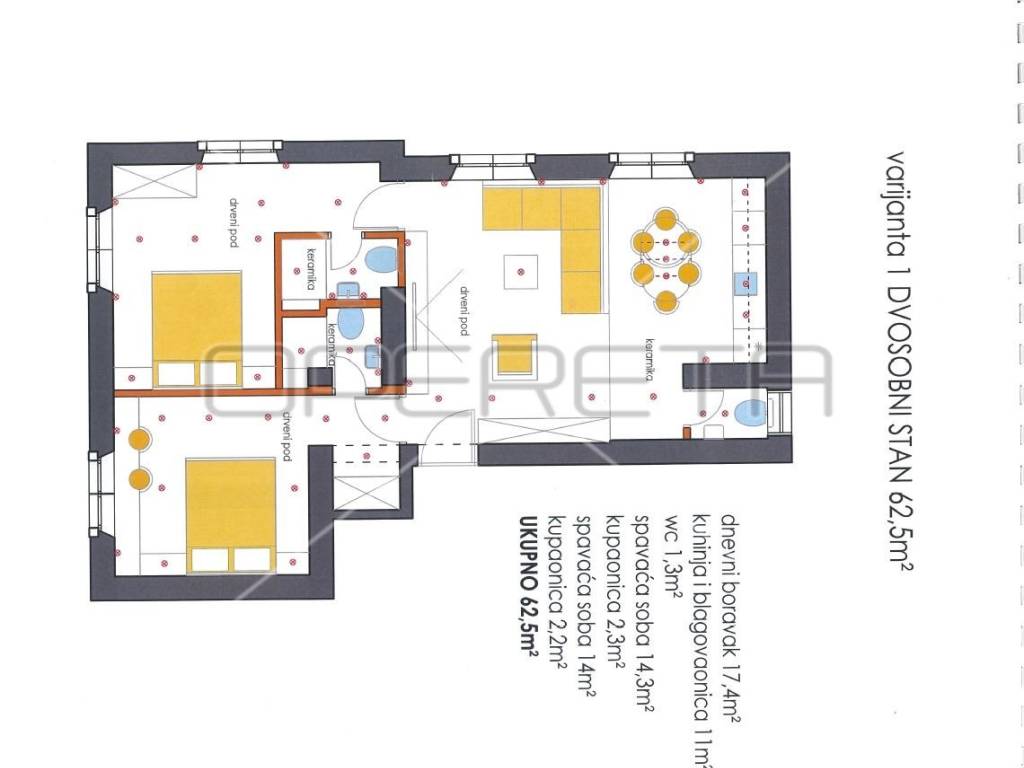 Ukupna površina stana iznosi 66,38 m i sastoji se od tri spavaće sobe, kuhinje i blagovaonice s pripadajućom random spremom, izbe, kupaonice s toaletom te velikog i prostranog predsoblja. Stanu pripada i odvojena drvarnica površine 2,5 m.