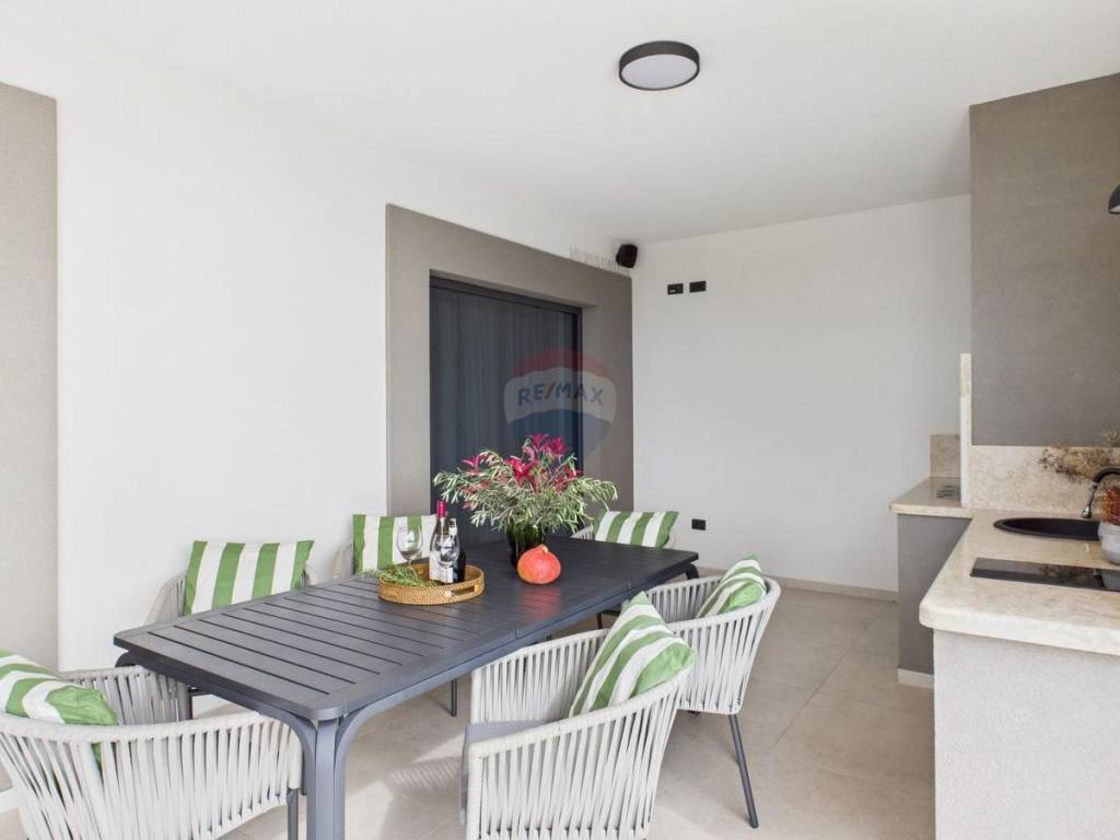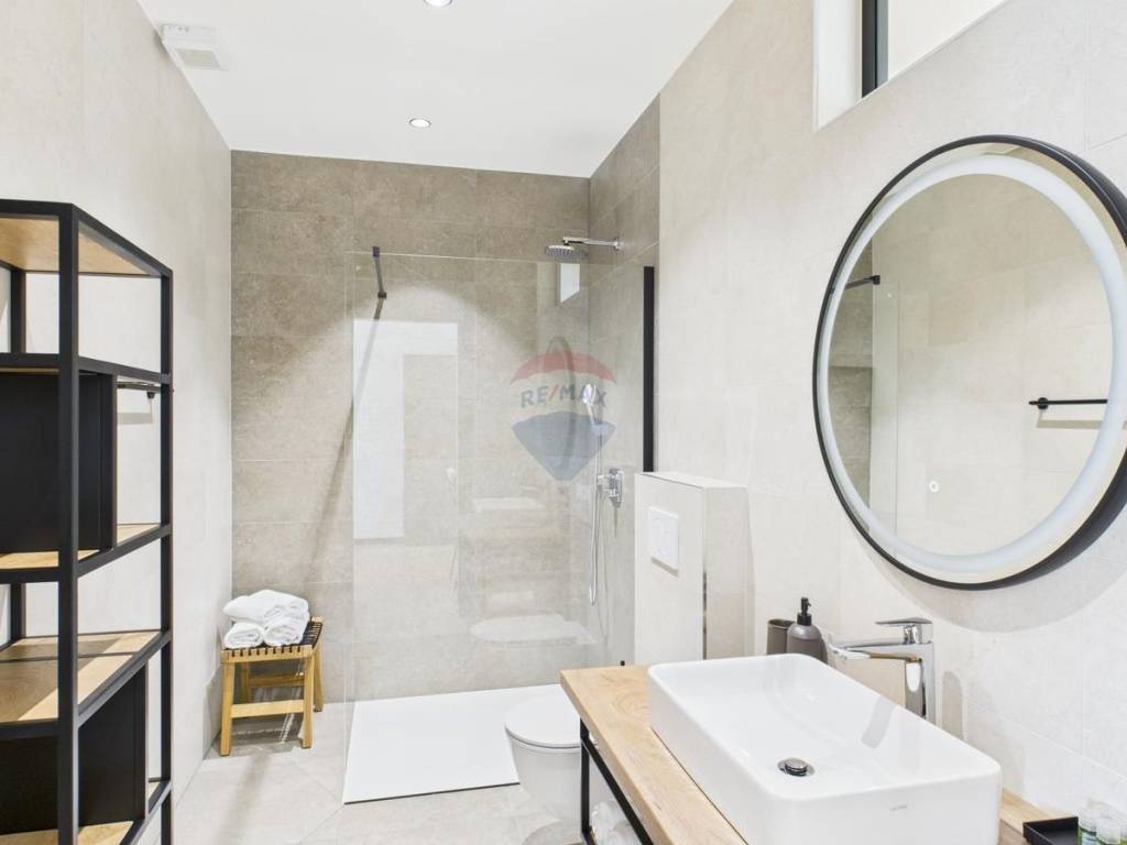 Kuća je koncipirana od svjetle, moderne dnevne sobe spojene u open space konceptu s potpuno opremljenom kuhinjom i blagovaonicom. Prostor je uređen ormarima i namještajem rađenim po mjeri. Iz dnevnog boravka se kroz staklenu stijenu izlazi do vanjske terase, sunčališta i bazena. Kuća posjeduje tri prostrane spavaće sobe, svaka sa svojom kupaonicom. Cijela kuća ima podno grijanje na dizalicu topline.