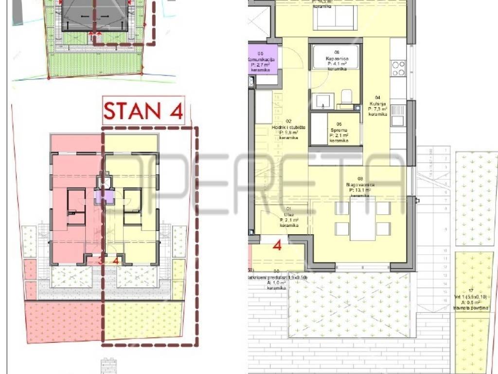 U zgradi se nalazi dvoetažni stan na katu od 138,87 m2. Prva etaža sastoji se od ulaznog hodnika koji vodi do svih prostorija, velike dnevne sobe s blagovaonicom koja ima izlaz na balkon, kuhinje smještene uz dnevnu sobu, kupaonice i spreme. Na drugoj etaži nalazi se spavaća soba, kupaonica, prostrana terasa te dodatni balkon.