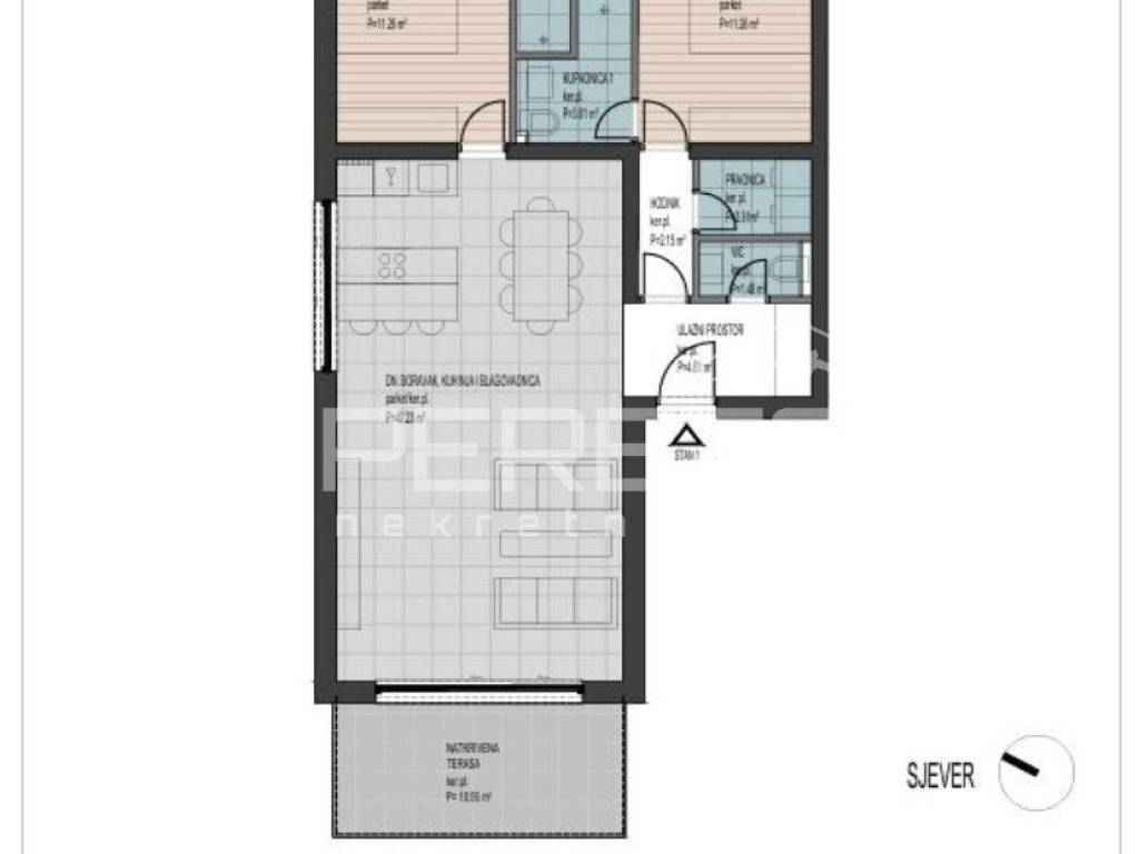 Stan S1D smješten je u prizemlju, stambene površine 80,62 m, s pažljivo osmišljenim rasporedom: hodnik, praonica, WC, 2 kupaonice, prostrani dnevni boravak i blagavaonica, kuhinja, 2 dvije spavaće sobe i natkrivena terasa od 10,56 m (koef. 0,50).