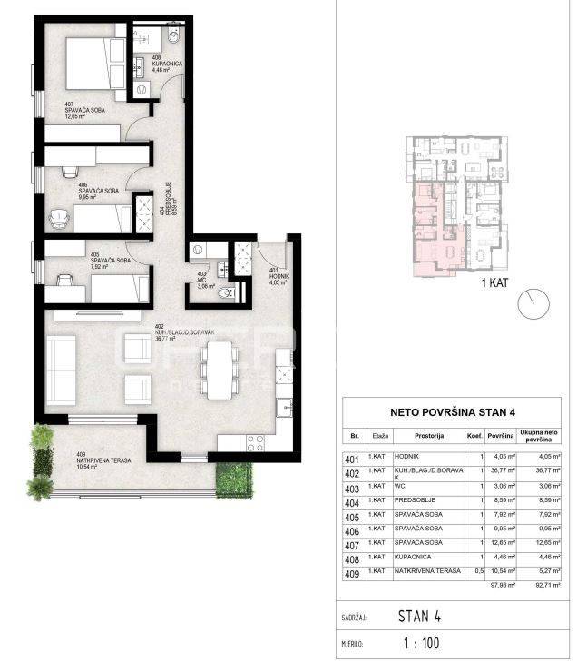 stan S4 na 1. katu, neto površine 92,71m, s pažljivo osmišljenim rasporedom: tri prostrane spavaće sobe, prostrani dnevni boravak, kuhinja s blagovaonicom, kupaonica, hodnik, predsoblje i natkrivena terasa za uživanje u pogledu i miru.