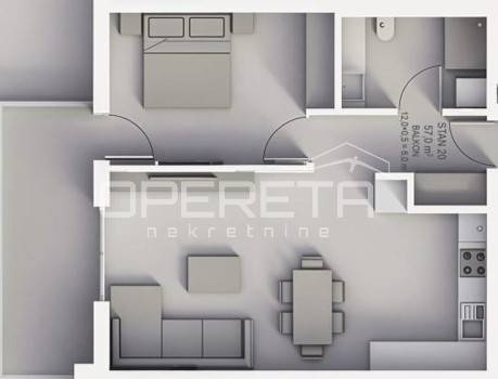Stan oznake S20 nalazi se na drugom katu stambene zgrade u izgradnji od ukupno 3 kata. Sastoji se od velikog "open space" dnevnog boravka s kuhinjom i blagovaonicom te izlazom na balkon, spavaće/radne sobe, kupaonice s wc-om, spremišta i ulaznog prostora.