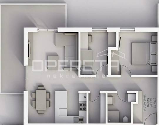 Stan oznake S12 nalazi se na 1. katu stambene zgrade u izgradnji od ukupno 3 kata. Sastoji se od velikog "open space" dnevnog boravka s kuhinjom i blagovaonicom te izlazom na balkon, 2 spavaće/radne sobe, kupaonice s wc-om, spremišta, ulaznog prostora i hodnika.