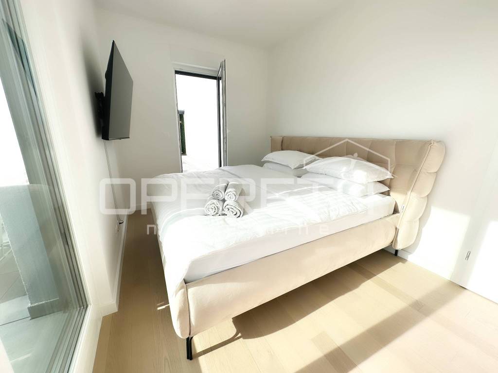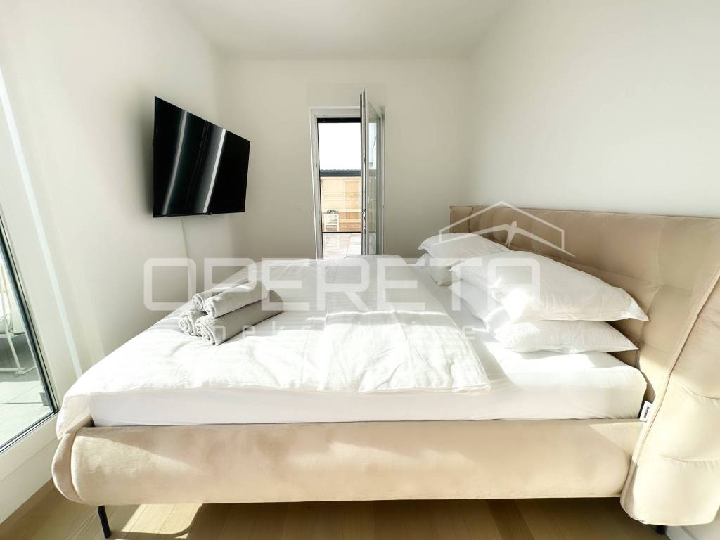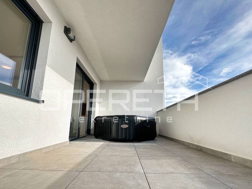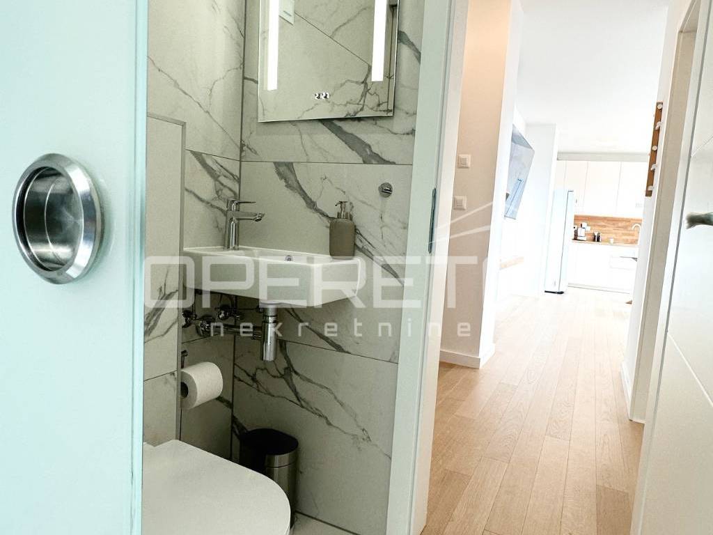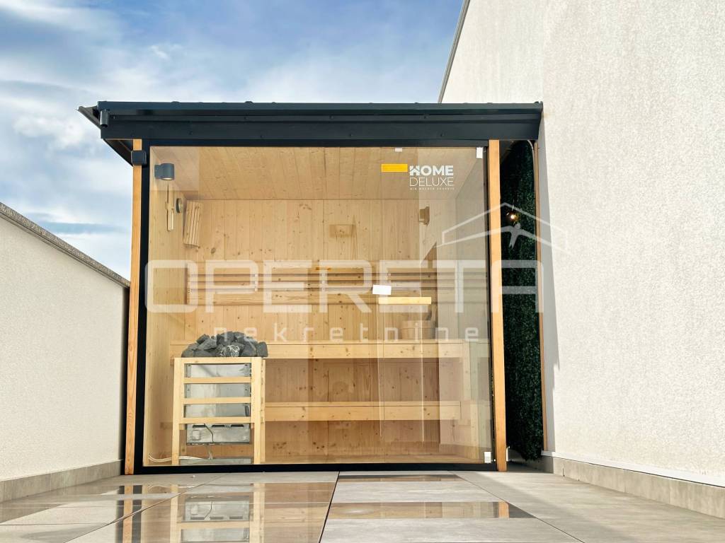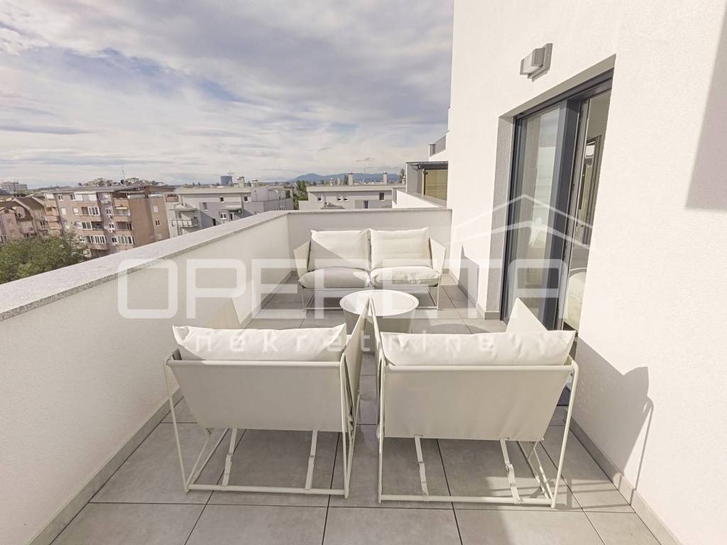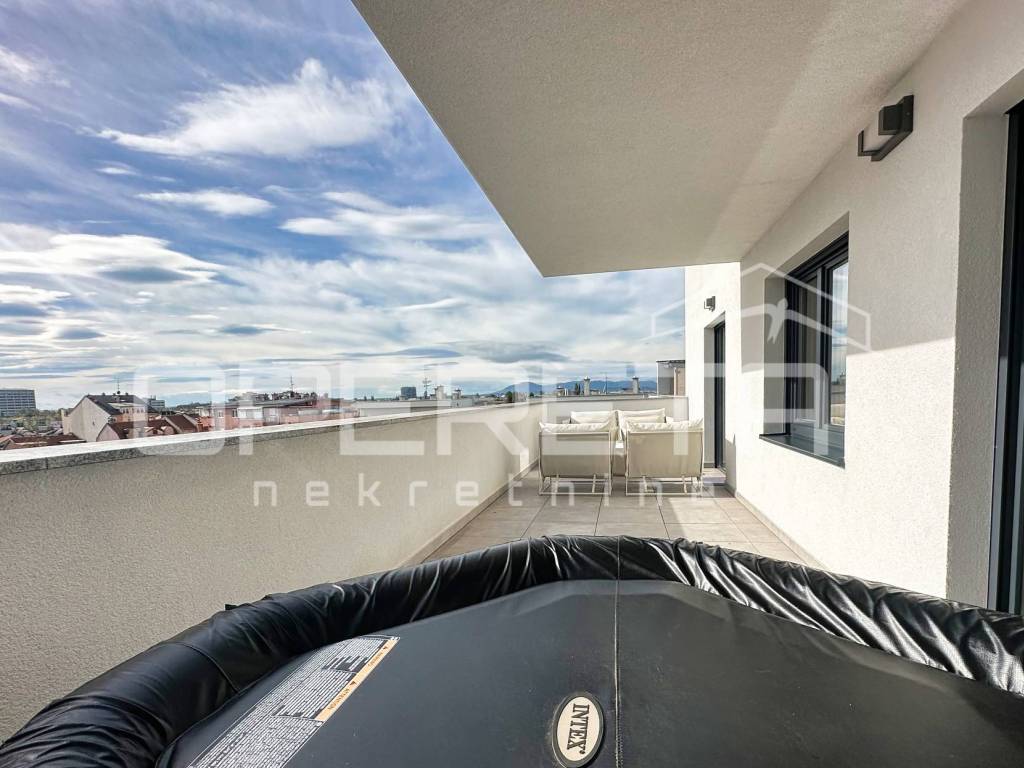 Iznajmljuje se stan na izvanrednoj lokaciji, u srcu Trešnjevke, u blizini svih bitnih sadržaja za svakodnevni život. Stan ima 63 kvadratna metra stambenog prostora sa 100 kvadrata terase na kojoj se nalaze sauna i jacuzzi. Luksuzno i moderno opremljen, a pripada mu i parkirno mjesto u garaži koja je pod 24-satnim video nadzorom i spremište od 5 m2.