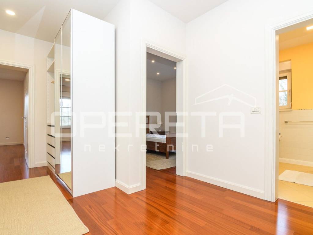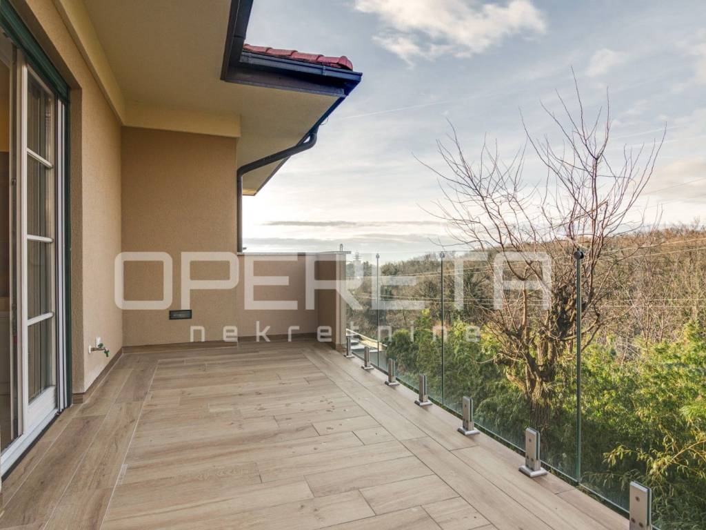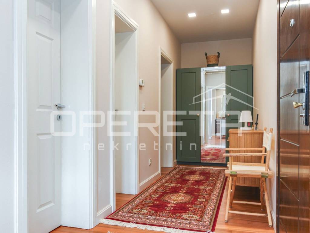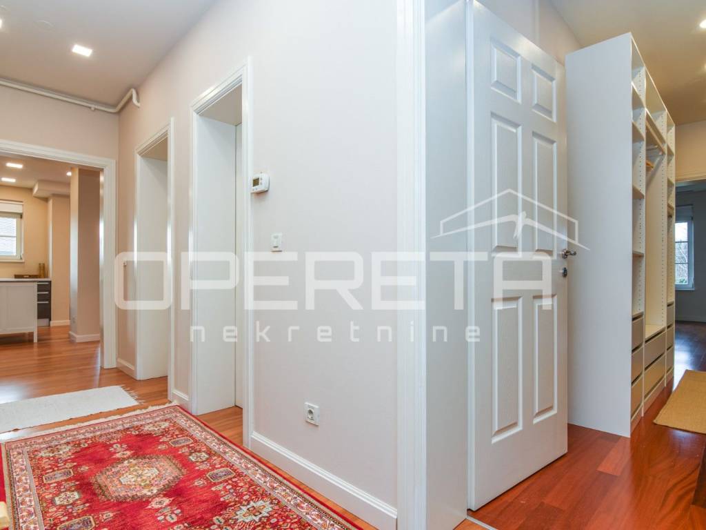 Na mirnoj lokaciji na Medveščaku iznajmljuje se prostran, novo uređen stan s otvorenim pogledom na grad. Ulazni prostor vodi u dnevni boravak povezan s modernom kuhinjom, iz kojeg se izlazi na veliku terasu, dok su gostinjski WC i kotlovnica smješteni diskretno uz ulaz. Desni dio stana čini jasno odvojen i funkcionalno organiziran privatni dio koji obuhvaća tri spavaće sobe, walk-in garderobu i dvije kupaonice, pri čemu master spavaća soba ima vlastitu kupaonicu i izlaz na balkon. Stanu pripada ostava u prizemlju te dva parkirna mjesta. Stambeni dio ima površinu 148,93 m, dok dvije terase iznose 21,35 m i 20,04 m, što čini ukupnu obračunsku površinu stana ( 190,32m2). Nekretnina se nalazi u mirnom i zelenom okruženju, idealna za kvalitetan obiteljski život ili reprezentativno stanovanje.