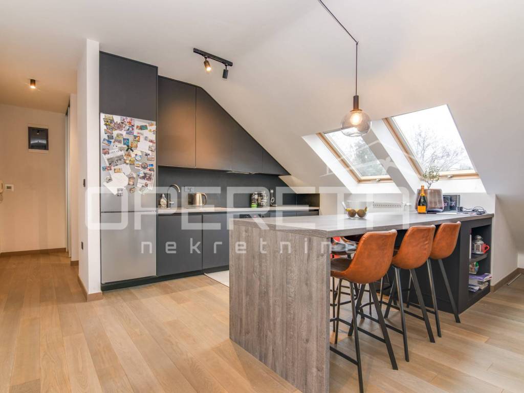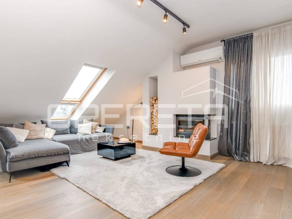 Stan se sastoji od dnevnog boravka s kuhinjom, dvije spavaće sobe, dodatne manje spavaće/radne sobe, dvije kupaonice i spremišta. Kompletno je preuređen vrhunskim materijalima, drvenom stolarijom, hrastovim parketom, opremljen modernim namještajem, kaminom na drva, klimatiziran.
