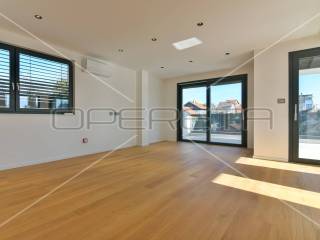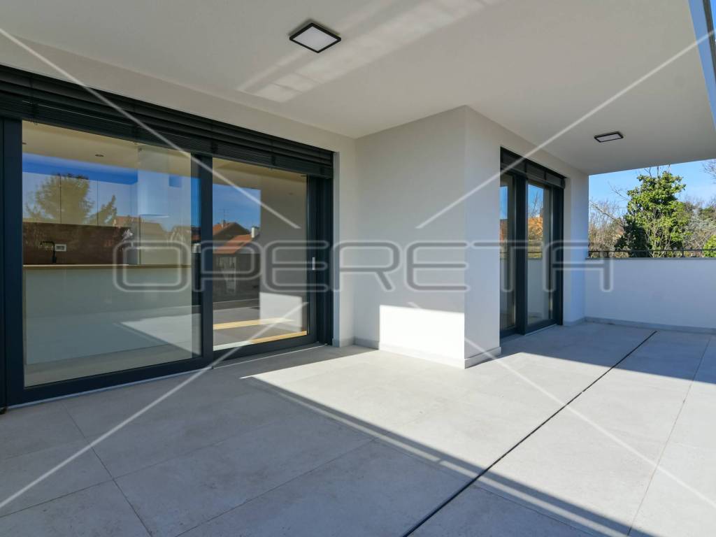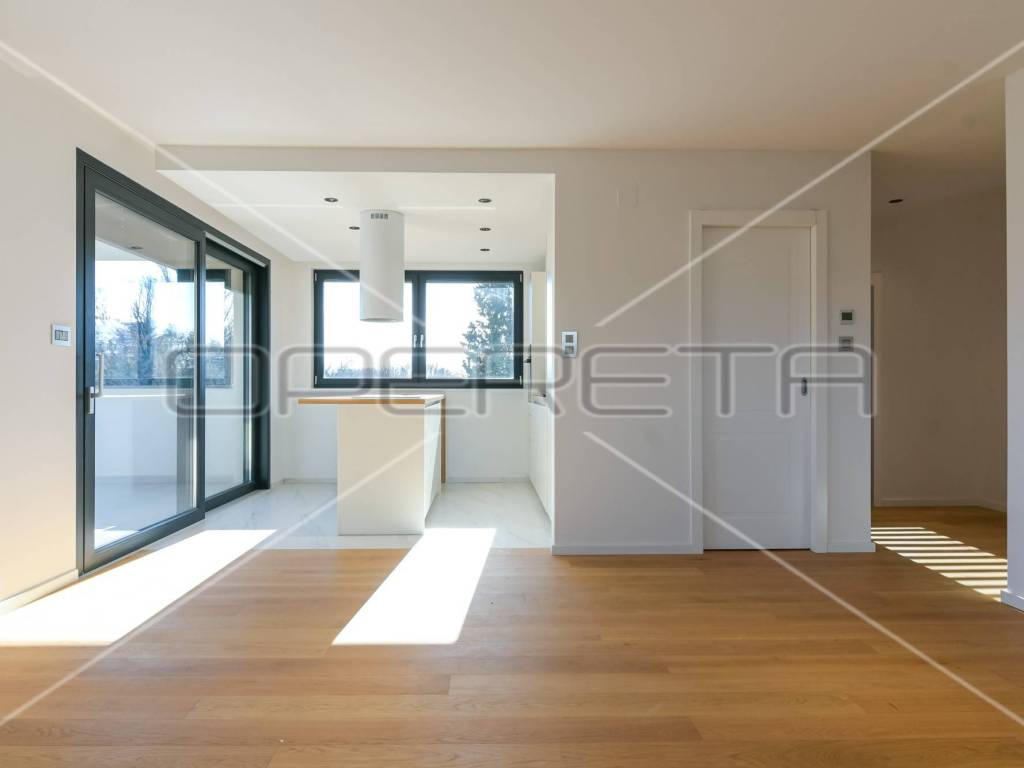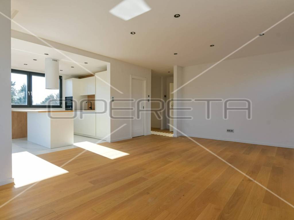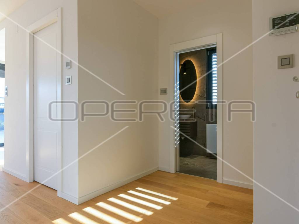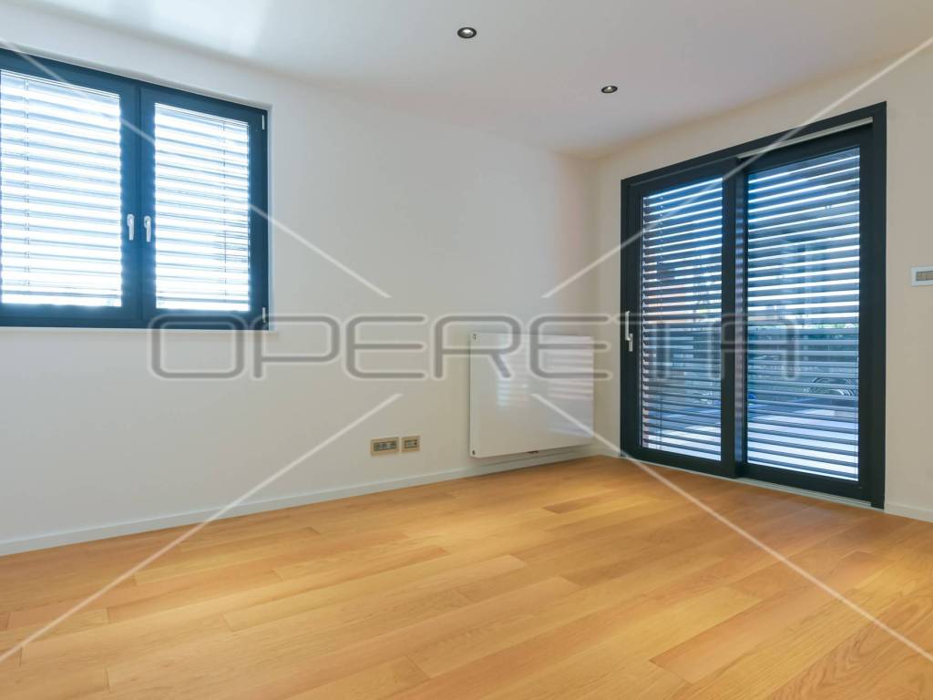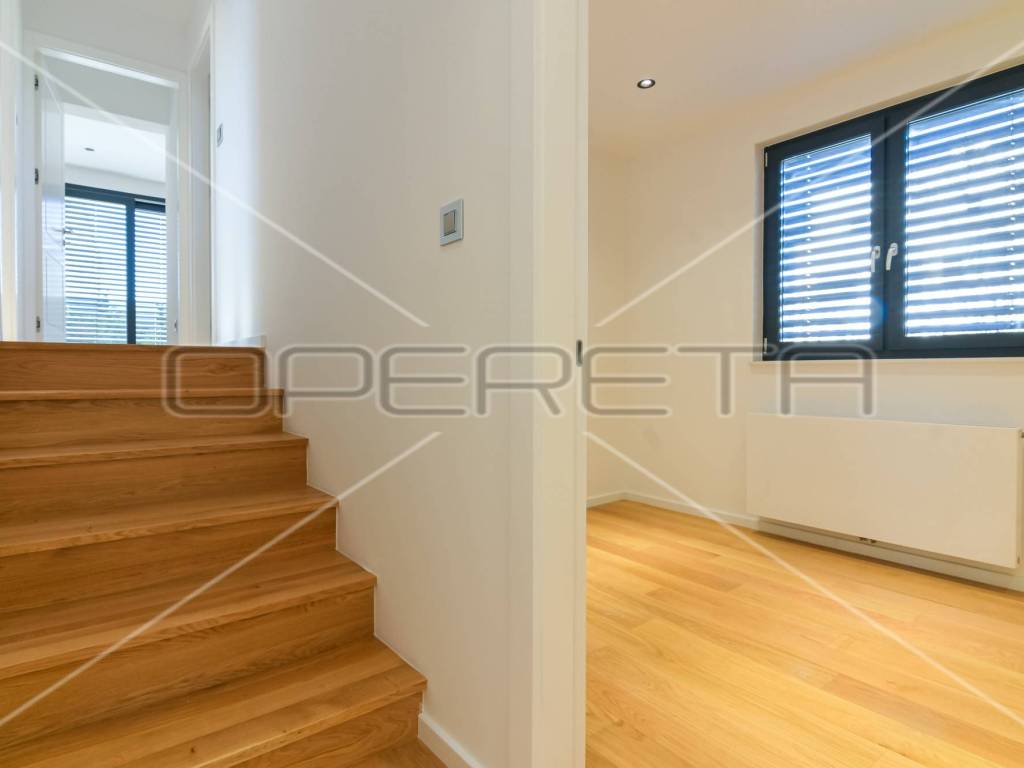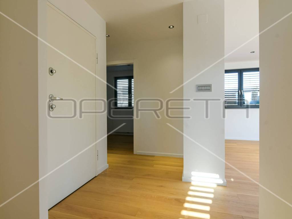 Stan se nalazi u prizemlju zgrade, a sastoji se od ulaznog hodnika, tri spavaće sobe, dvije kupaonice, dnevne sobe s kuhinjom i blagovaonicom te izlazom na veliku terasu s pristupom vrtu. Vrhunska gradnja, keramika i parket prve klase, visokokvalitetna kuhinja.