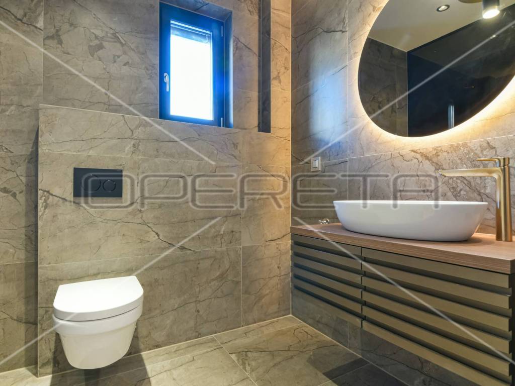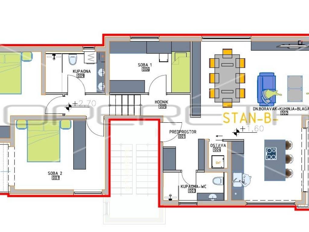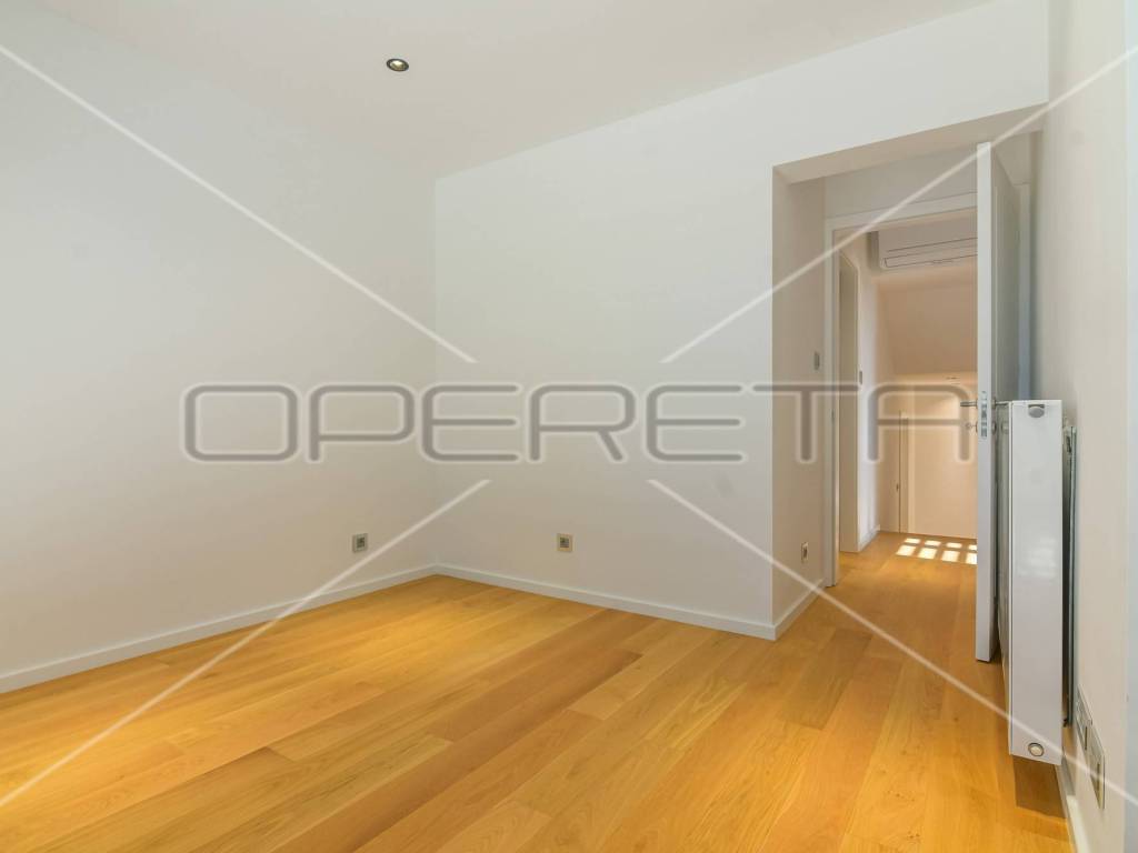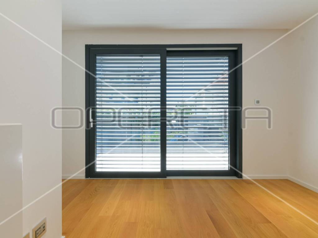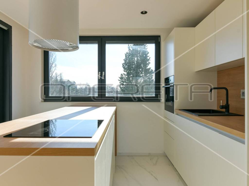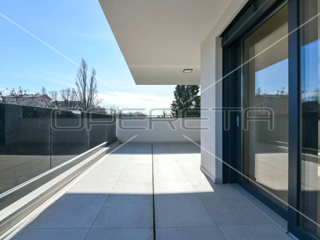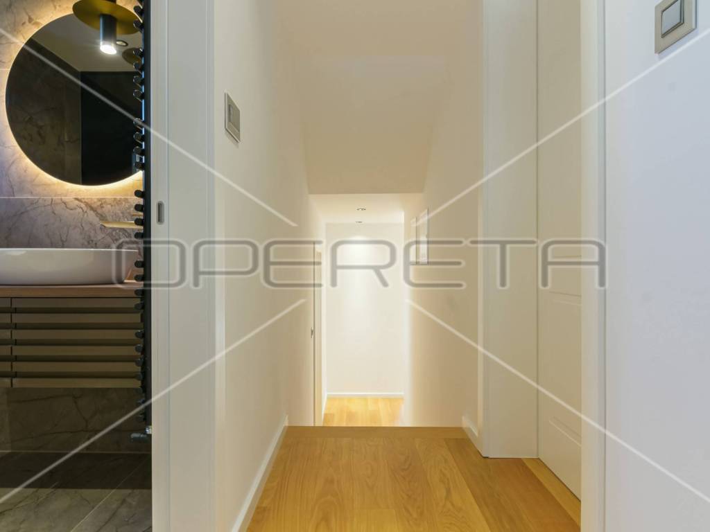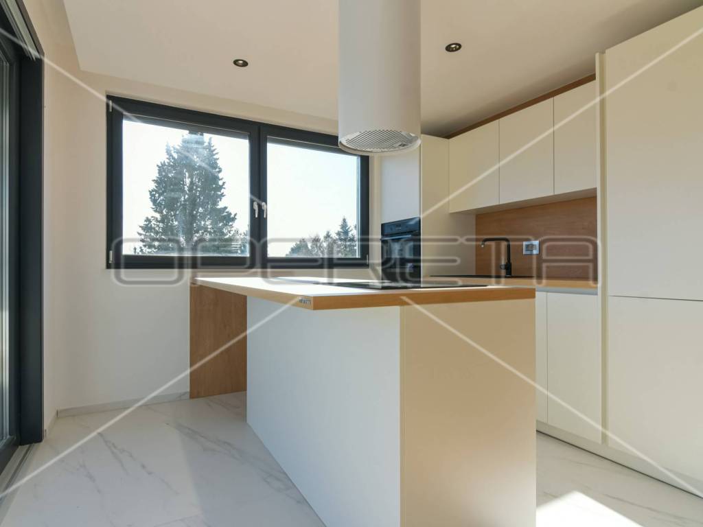 Stan se nalazi u prizemlju zgrade, a sastoji se od ulaznog hodnika, tri spavaće sobe, dvije kupaonice, dnevne sobe s kuhinjom i blagovaonicom te izlazom na veliku terasu s pristupom vrtu. Vrhunska gradnja, keramika i parket prve klase, visokokvalitetna kuhinja.
