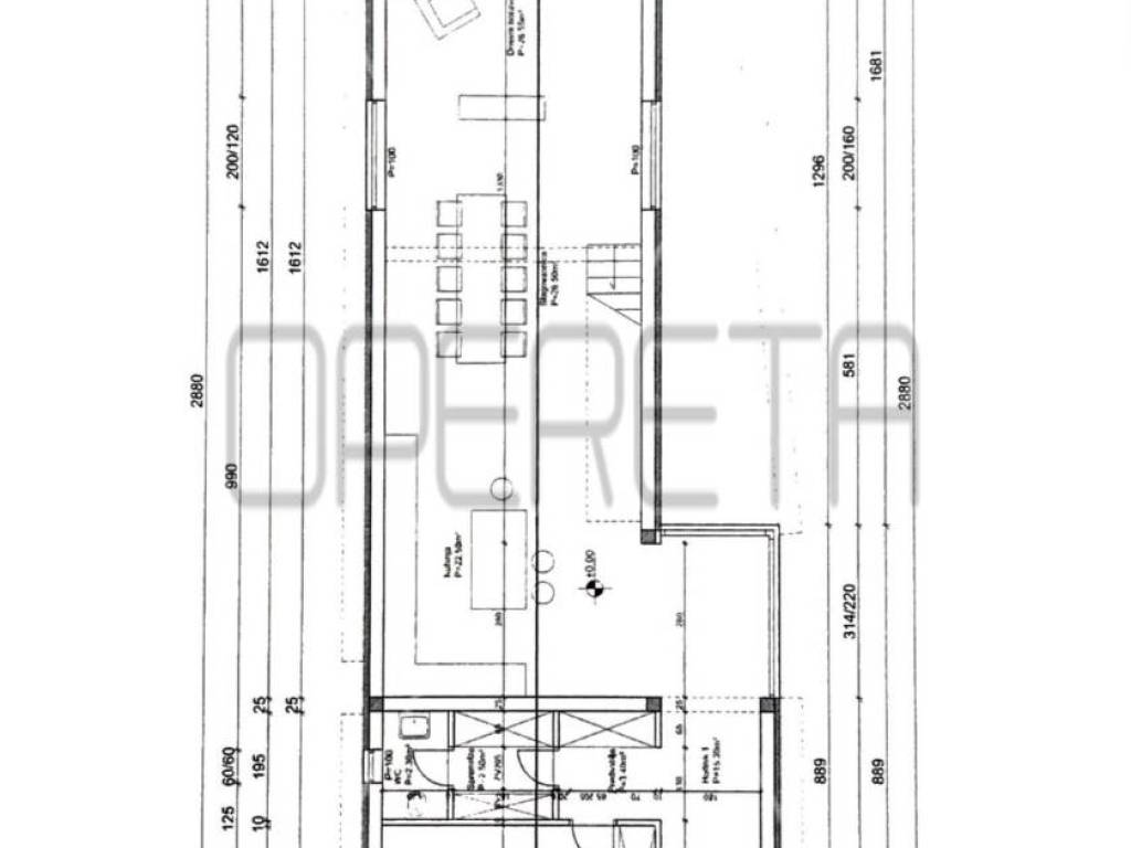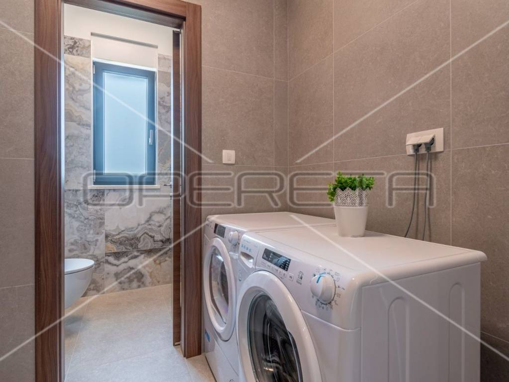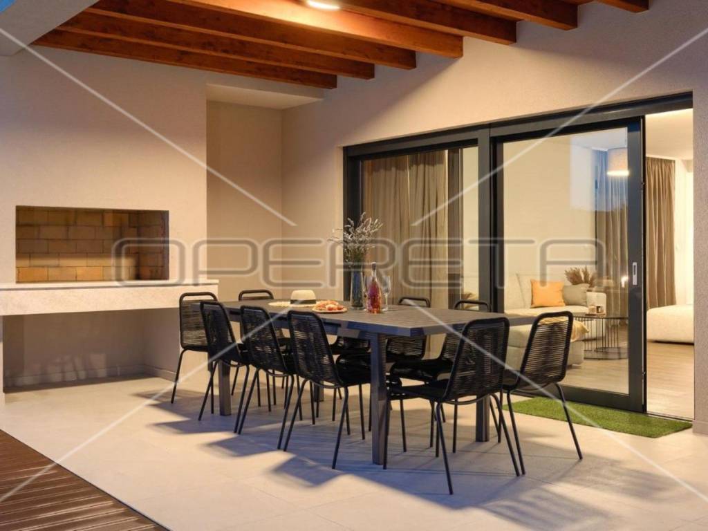 u prizemlju se smjestio hodnik, potpuno opremljena kuhinja, blagovaonica, dnevni boravak s izlazom na terasu i ljetnu kuhinju, spavaća soba s vlastitom kupaonicom, toalet i ostava.