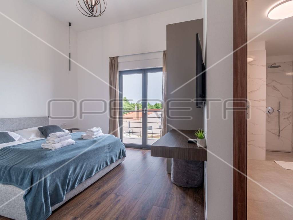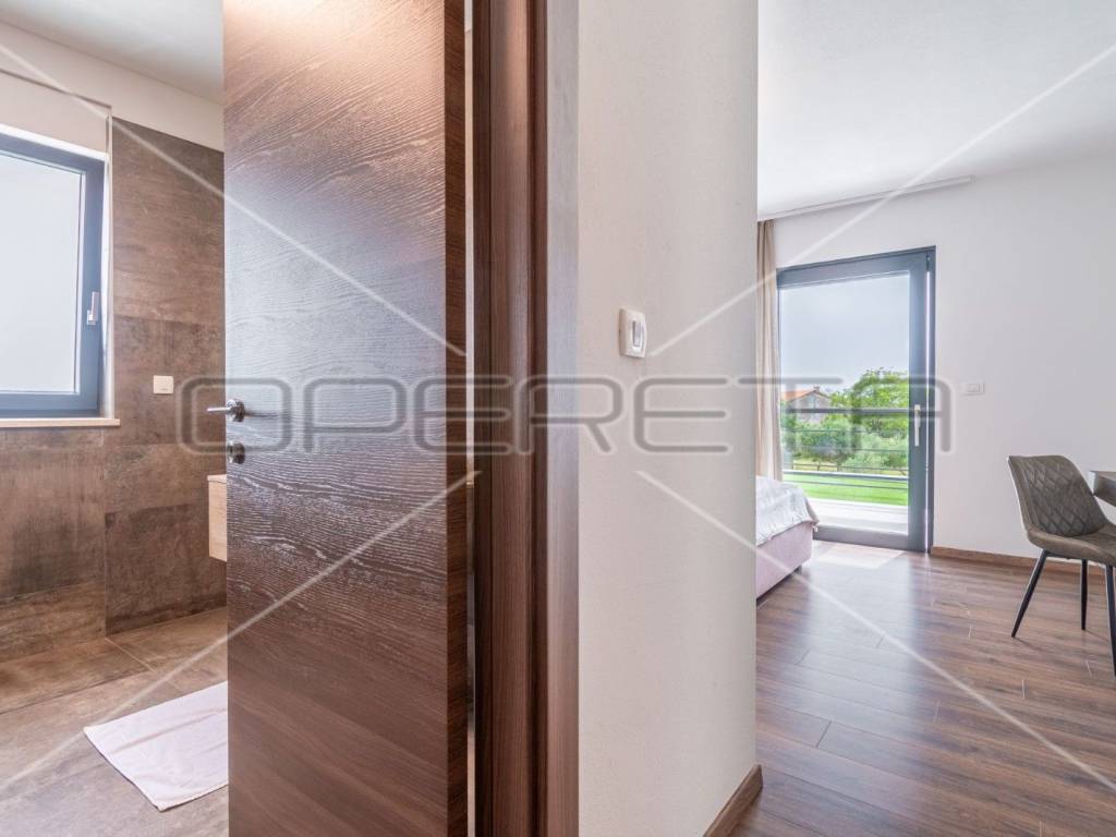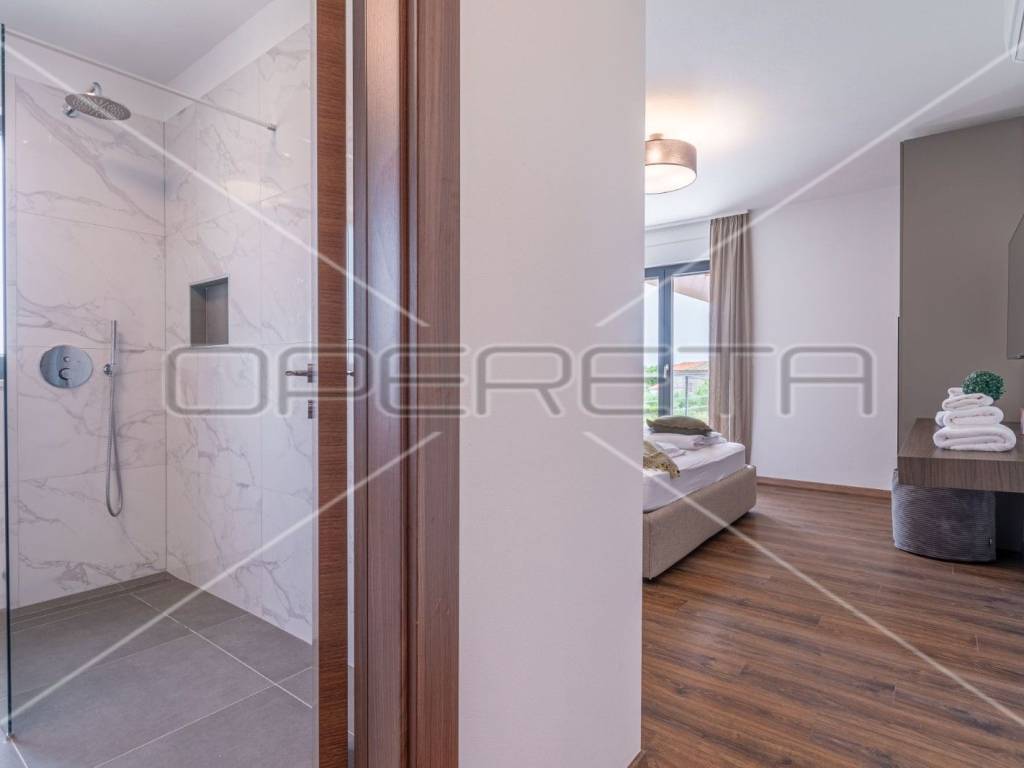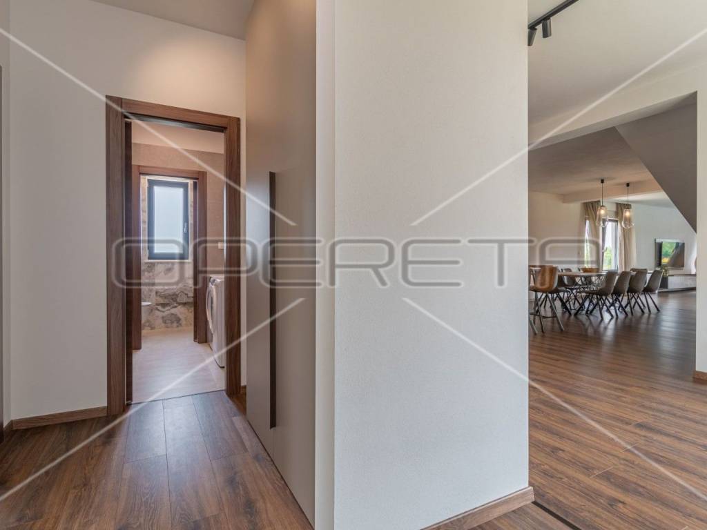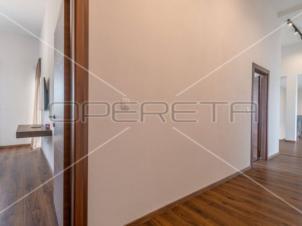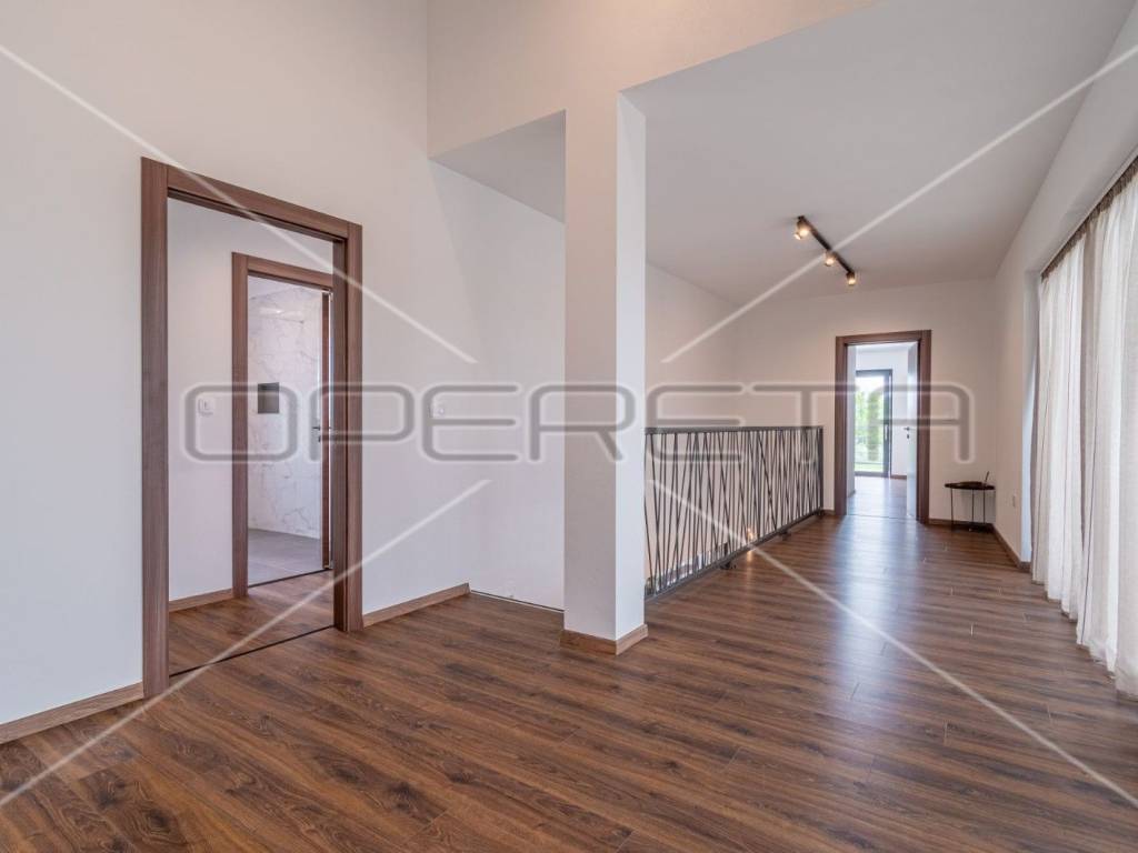 Moderne stepenice vode na kat gdje su četiri prostrane spavaće sobe, svaka s kupaonicom, klima uređajem i tv - om. Svaka soba ima izlaz na terasu s koje se pruža predivan panoramski pogled na zelenilo.