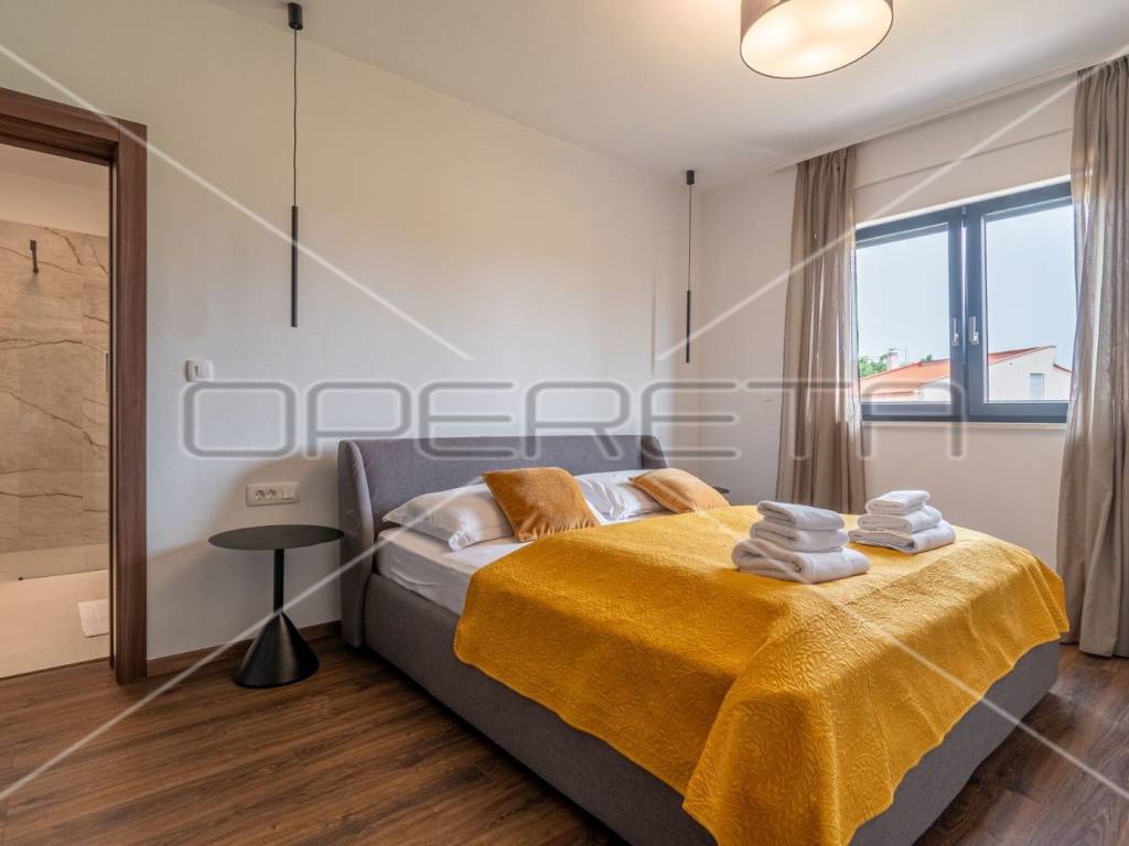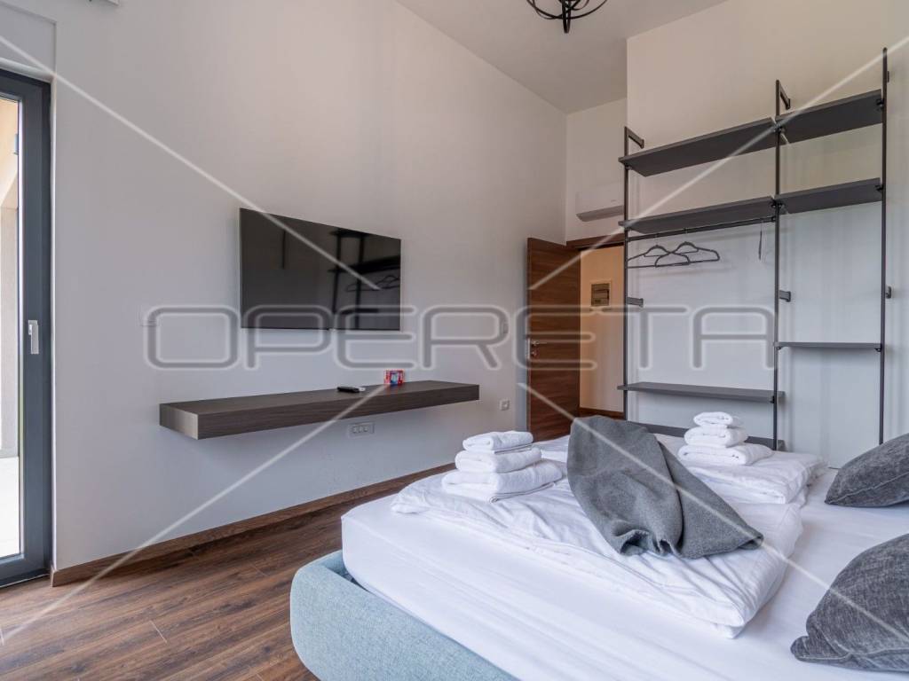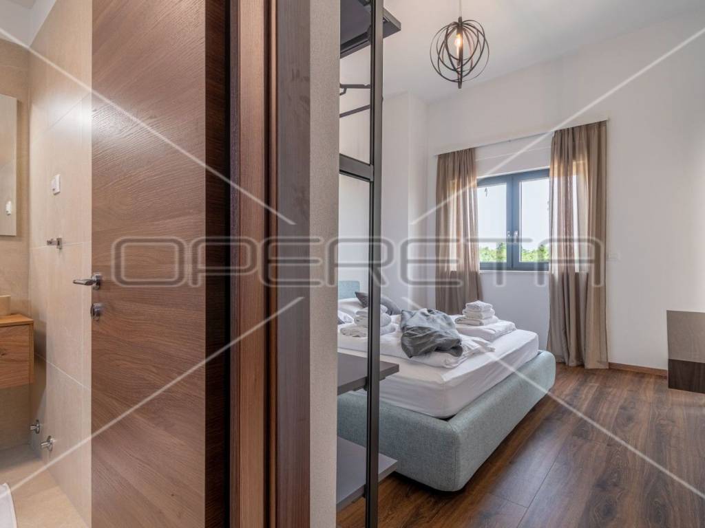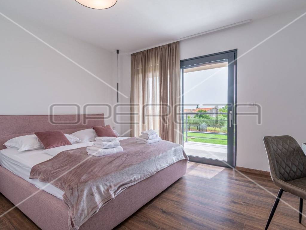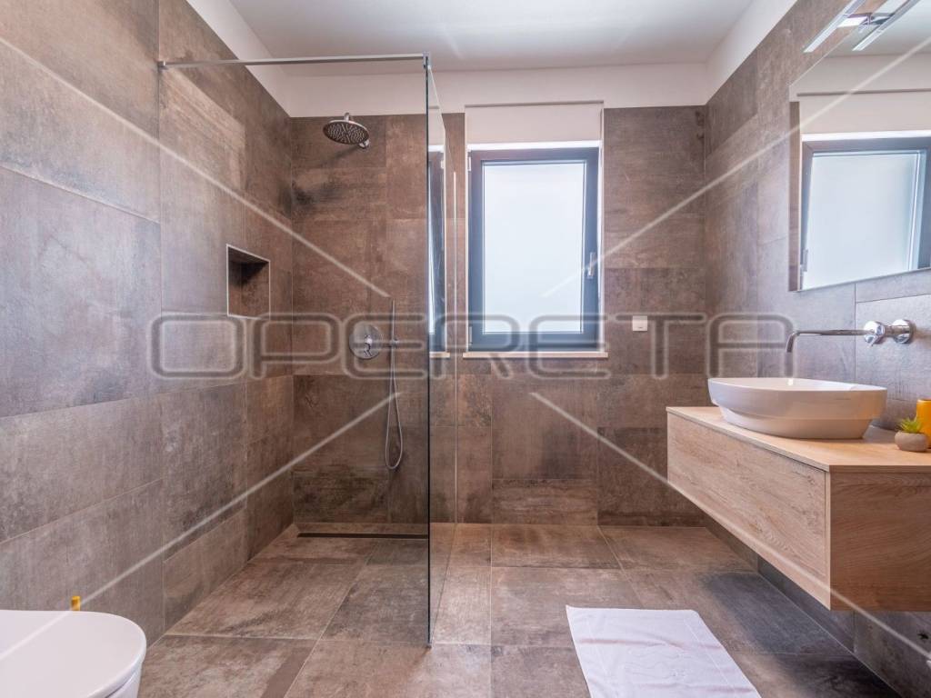 Moderne stepenice vode na kat gdje su četiri prostrane spavaće sobe, svaka s kupaonicom, klima uređajem i tv - om. Svaka soba ima izlaz na terasu s koje se pruža predivan panoramski pogled na zelenilo.