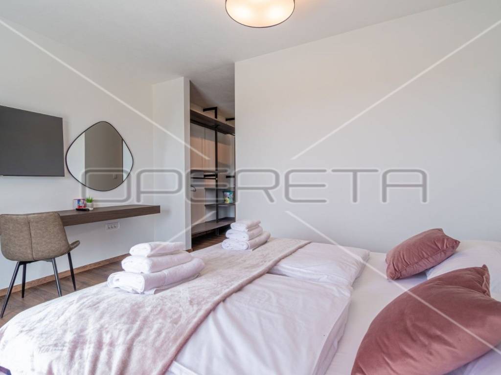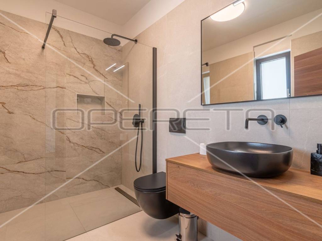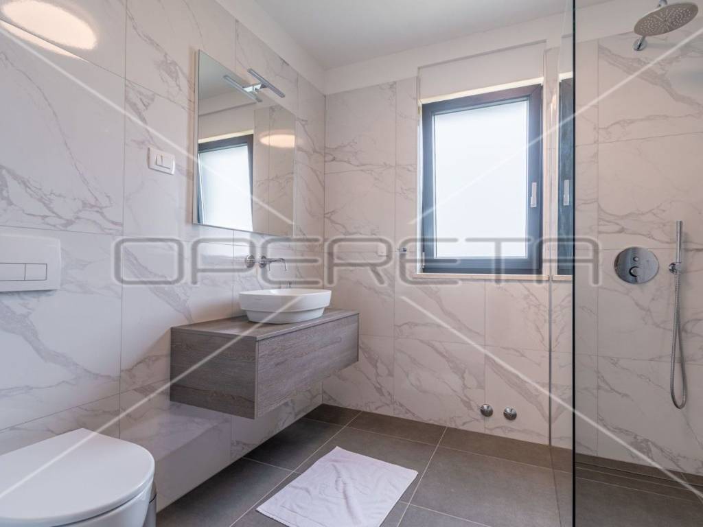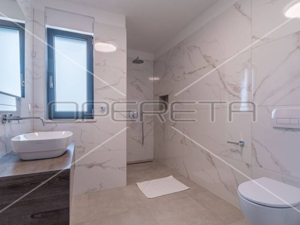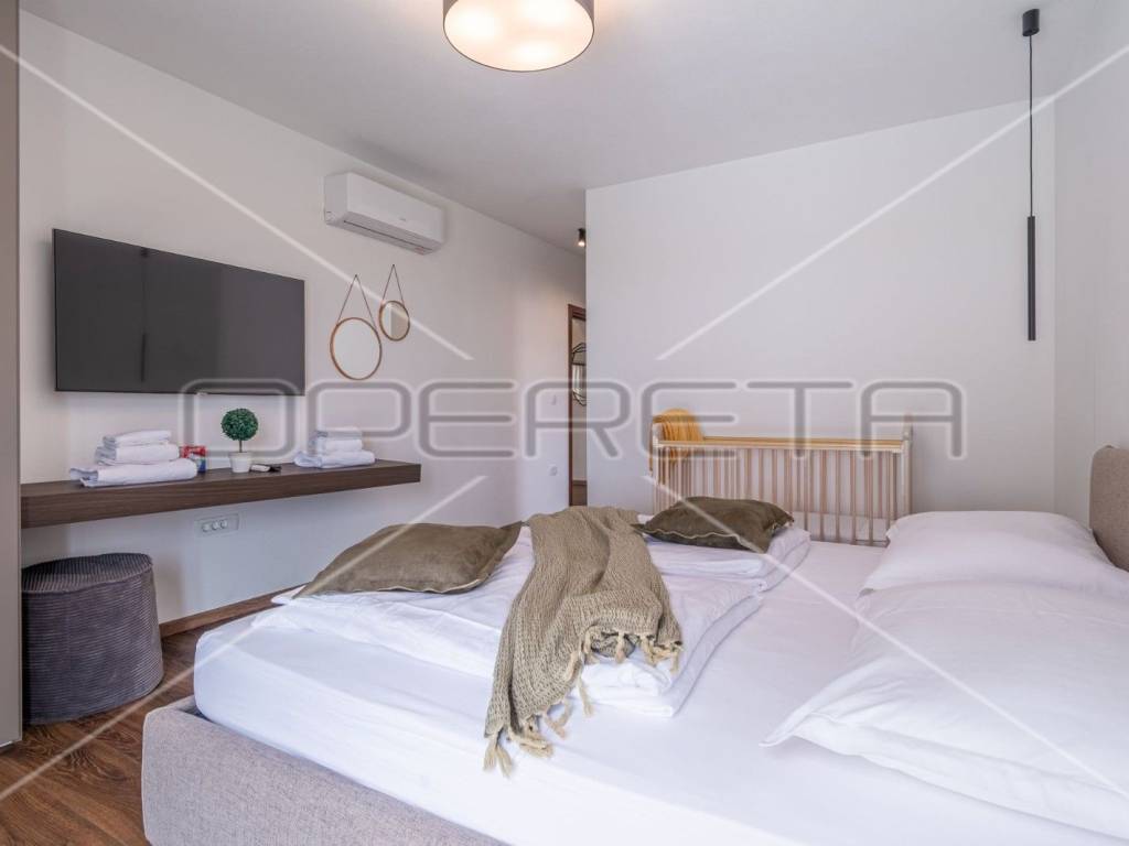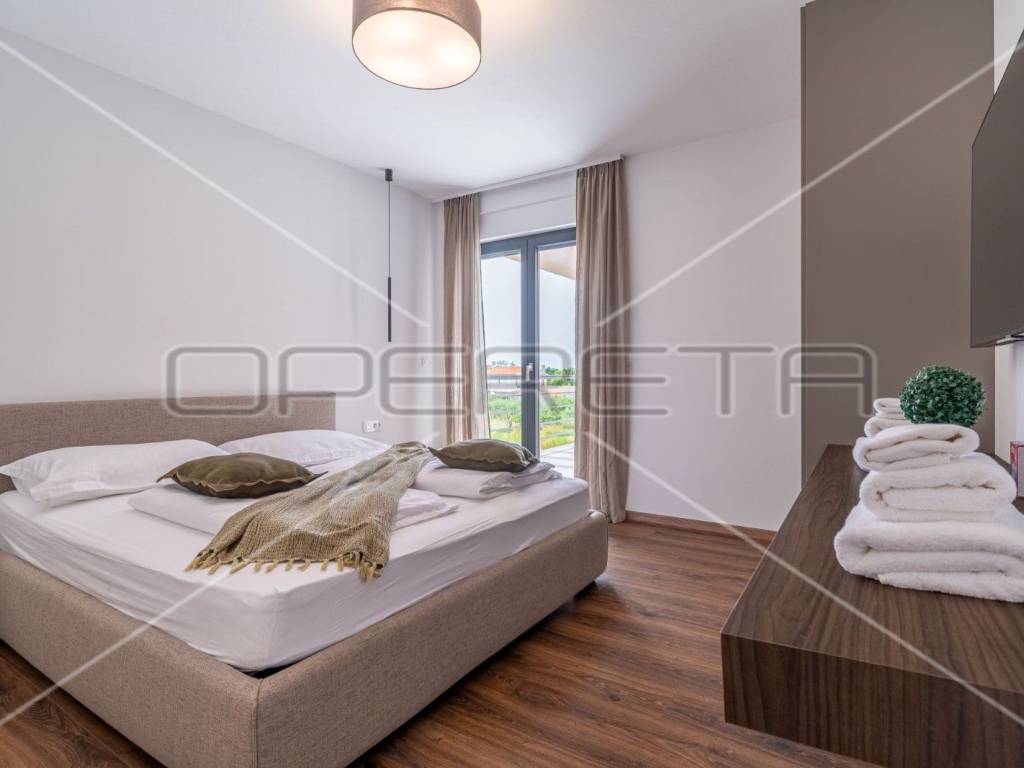 Moderne stepenice vode na kat gdje su četiri prostrane spavaće sobe, svaka s kupaonicom, klima uređajem i tv - om. Svaka soba ima izlaz na terasu s koje se pruža predivan panoramski pogled na zelenilo.