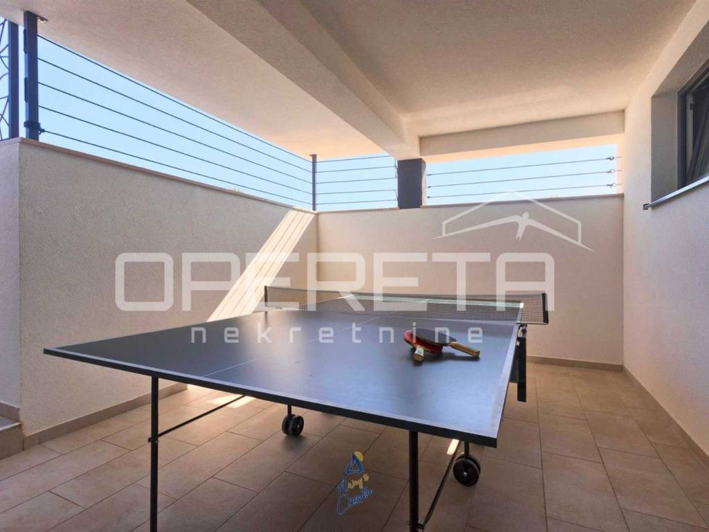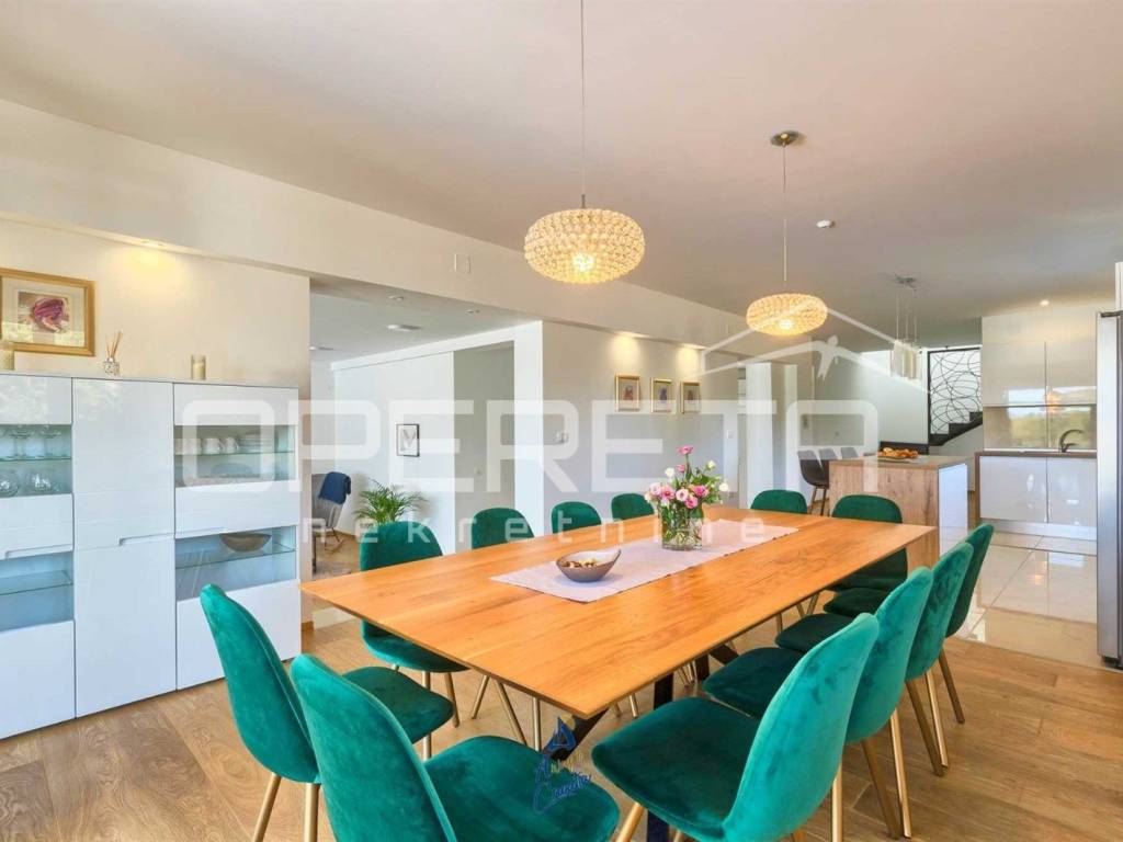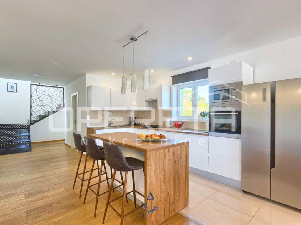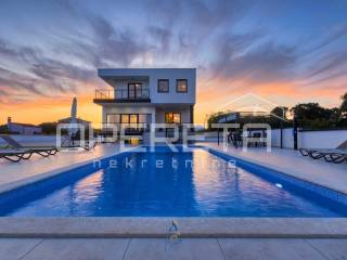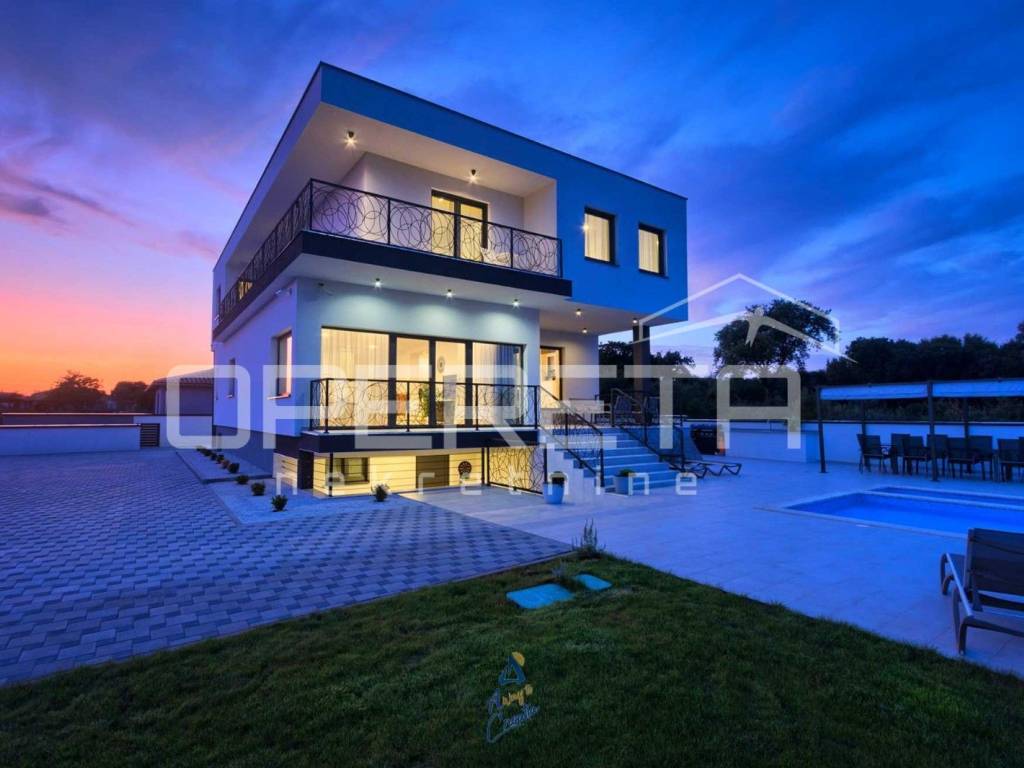 Na predivnoj okućnici nalazi se travnjak sa sistemom automatskog navodnjavanja, 10 maslina, bazen površine 64 m, prostrano sunčalište s vanjskim tušem, prostor za druženje i objed sa kaminom.