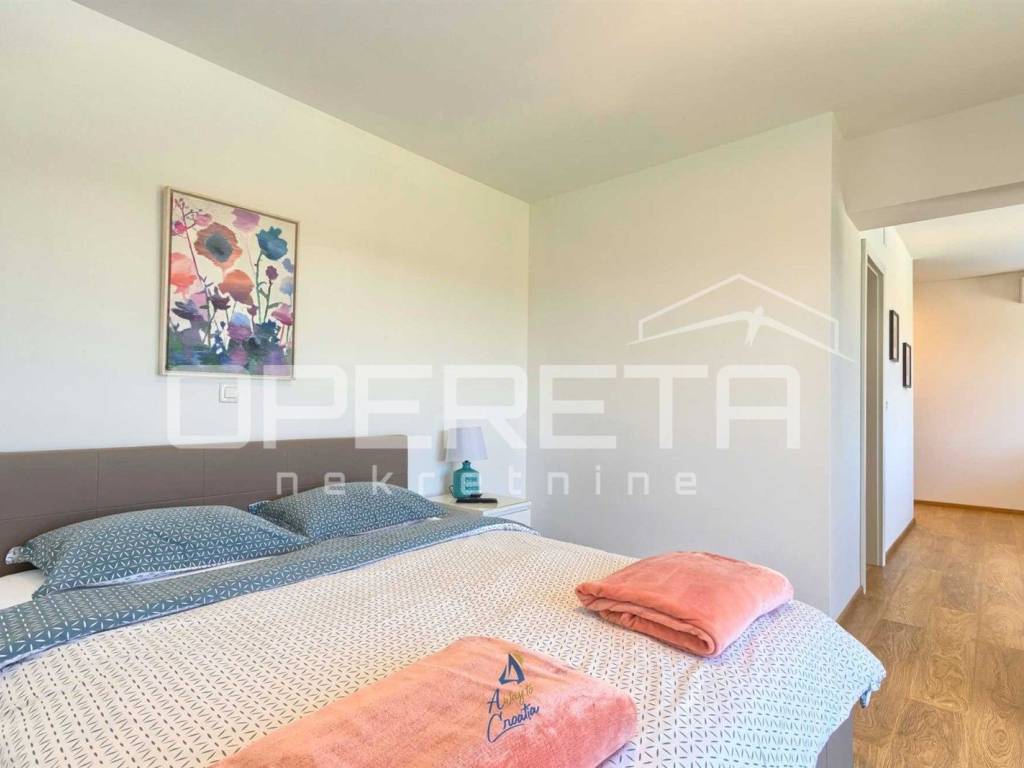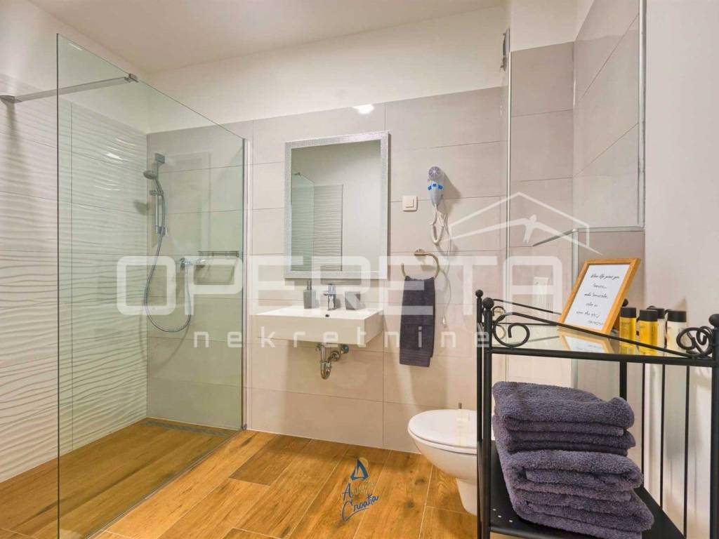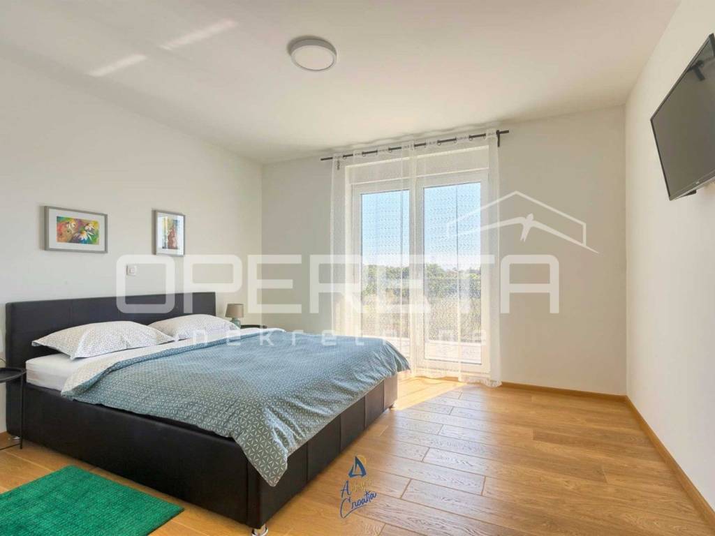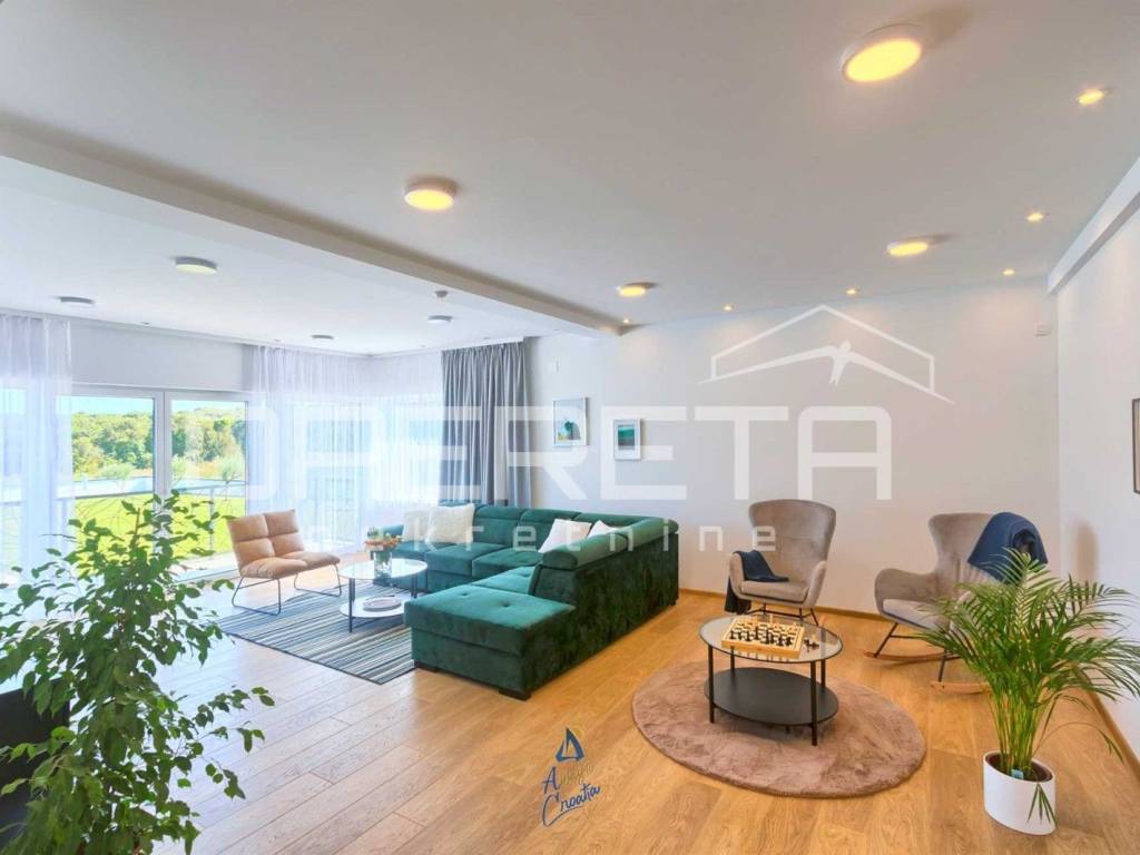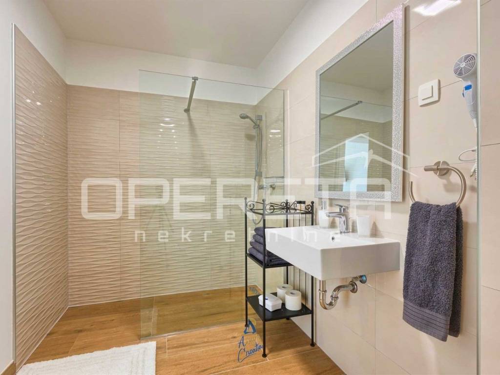 Na predivnoj okućnici nalazi se travnjak sa sistemom automatskog navodnjavanja, 10 maslina, bazen površine 64 m, prostrano sunčalište s vanjskim tušem, prostor za druženje i objed sa kaminom.