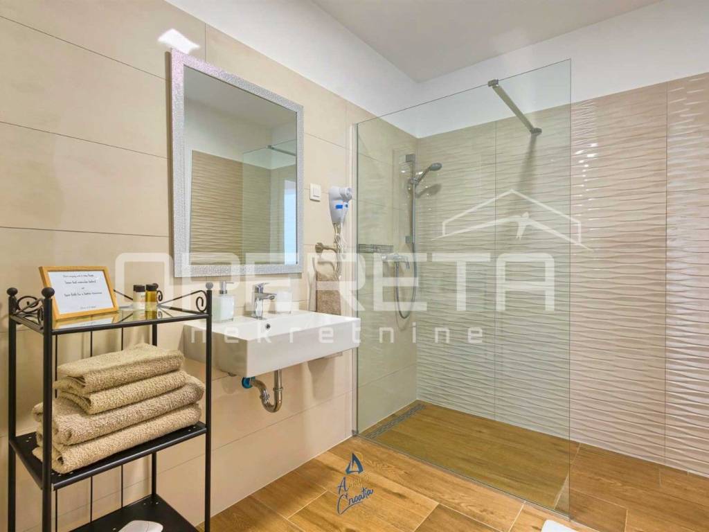 Na prvom katu nalazi se pet spavaćih soba, od kojih su dvije spojene u jednu. Svaka soba ima vlastitu kupaonicu, tv i klima uređaj, te izlaz na zajedničku terasu sa panoramskim pogledom.