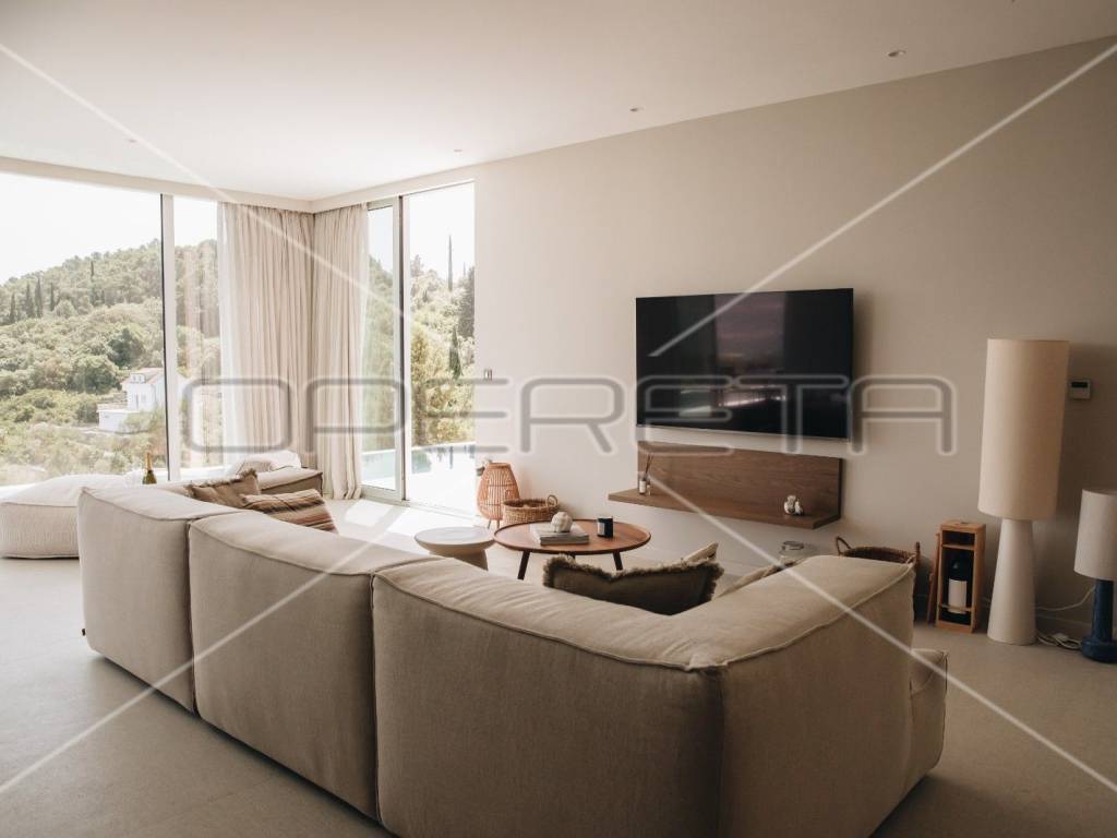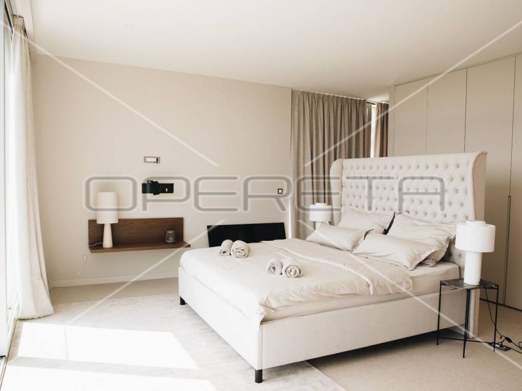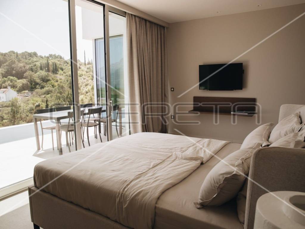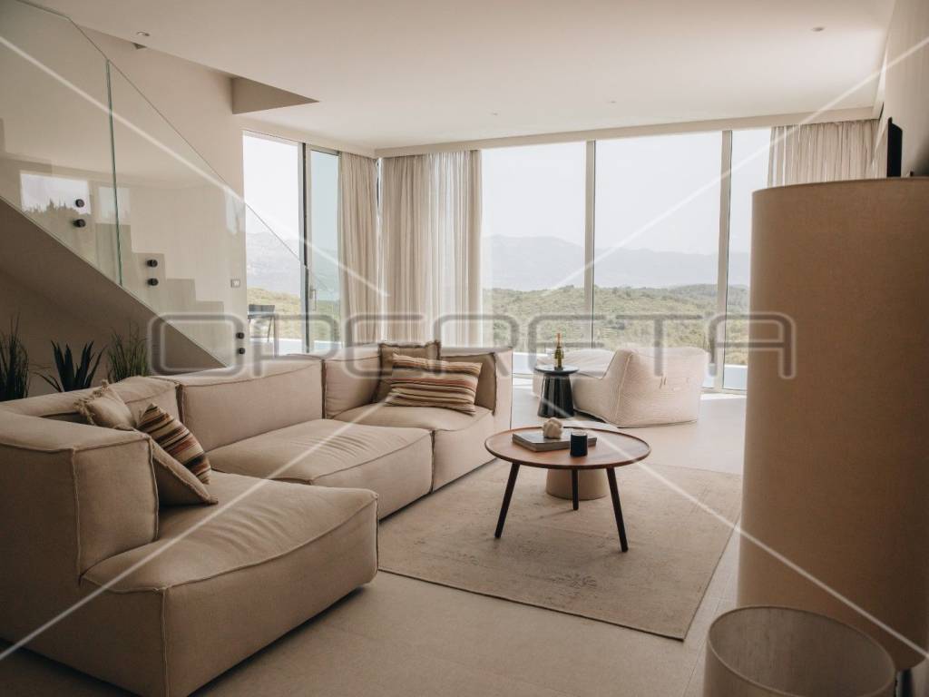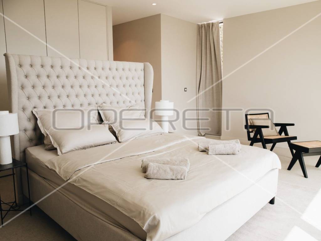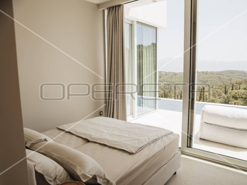 Na prizemlju, prostrani dnevni boravak spojen je s modernom kuhinjom opremljenom Miele aparatima i blagovaonicom, odakle se izlazi na prostranu terasu s infinity bazenom. Tri elegantne spavaće sobe, svaka s vlastitom kupaonicom, smještene su na istoj razini, osiguravajući intimu i udobnost. Posebna pažnja posvećena je gornjoj etaži, gdje se nalazi četvrta raskošna glavna spavaća soba s privatnom kupaonicom i terasom, koja je opremljena jacuzzijem, idealnim za opuštanje uz predivan pogled na more i okolnu prirodu. Iz sve četiri sobe, kao i iz većine prostorija u vili, pruža se panoramski pogled na prirodu i more.