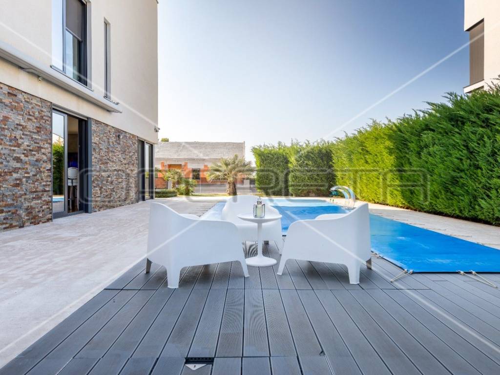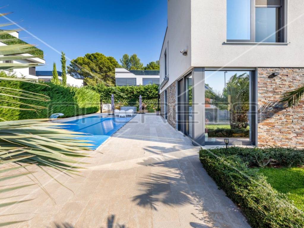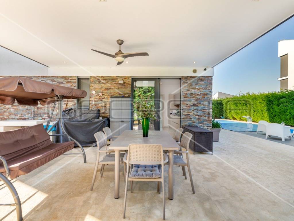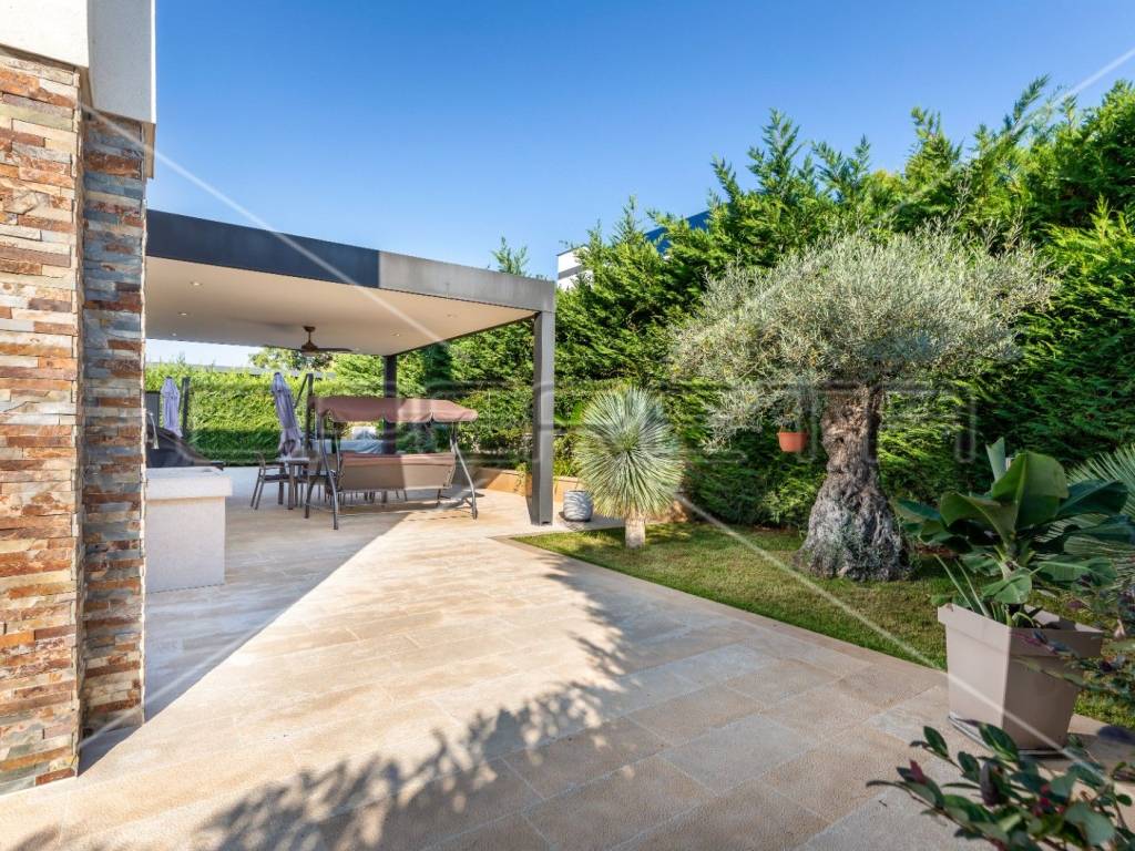 Bazen veličine 36 m2 sa hidromasažom i slapom u raznim LED bojama. Pored bazena se smjestio jacuzzi, strojarnica i prekrasna natkrivena terasa.