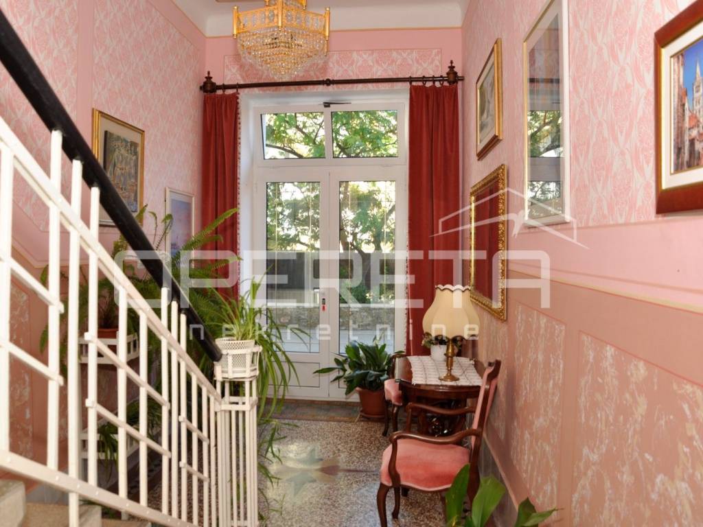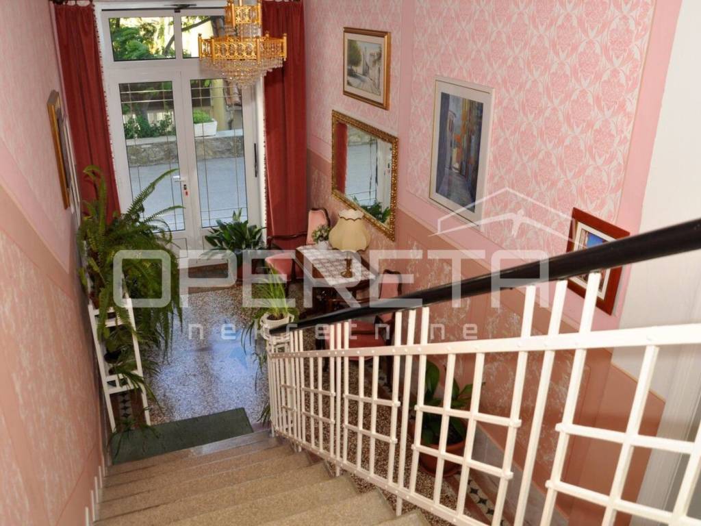 Stubište vodi do polukata, gdje se nalazi kuhinja s izlazom u vrt površine oko 100 m2. Prvi kat sadrži četiri sobe i dvije kupaonice s toaletom. Drugi kat također ima četiri sobe, kupaonicu s toaletom i terasu od 40 m2 s pogledom na gradsku luku, dok druga strana terase gleda prema gradskoj park šumi. Iznad svega nalazi se potkrovlje od dodatnih 120 m2 koje služi kao tavanski prostor.