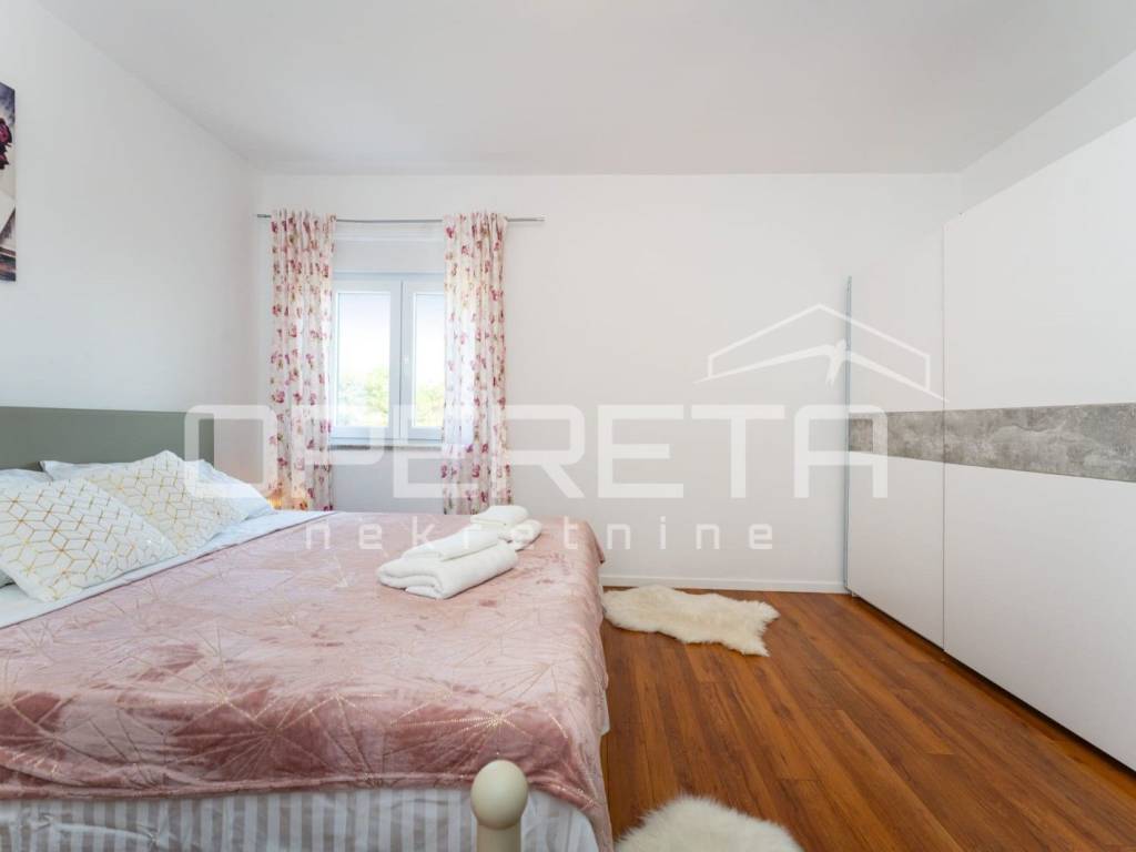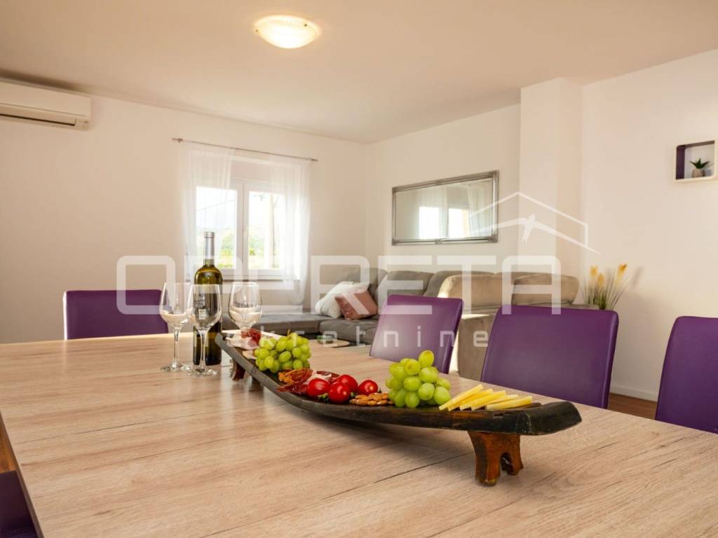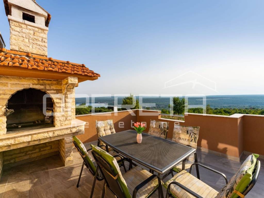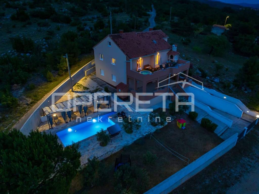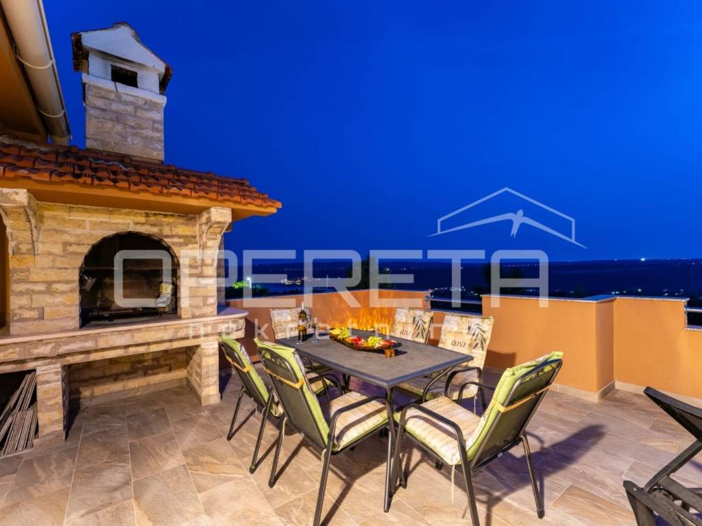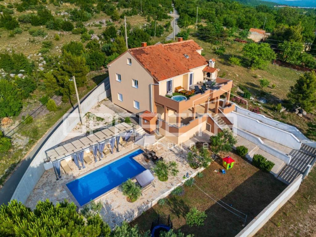 Razvedena je na tri etaže: suteren, prizemlje i kat. Na elegantno i moderno namještenom katu veličine 184 m2 prostire se "open space" dnevni boravak s kuhinjom i blagovaonicom te izlazom na prostranu terasu s grillom i očaravajućim otvorenim pogledom na more, tri spavaće sobe, kupaonice s wc-om, zasebnog wc-a i hodnika. Prizemlje se sastoji od 2 odvojene stambene jedinice u roh bau fazi izgradnje, a na najnižoj etaži nalazi se garažni prostor za 4 automobila te vanjski parking za više automobila.