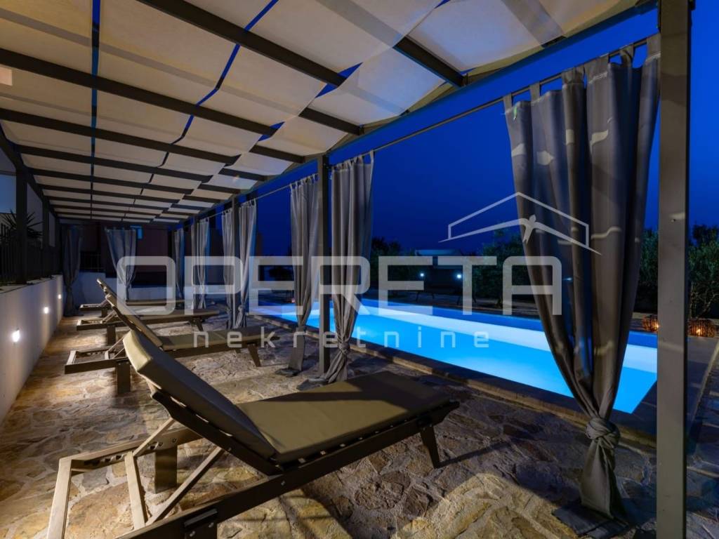 Vanjski prostor je ograđen i pruža intimu, a upotpunjava ga prostrani bazen sa sunčalištem i uređen vrt s mediteranskom hortikulturom: maslinama, smokvama, citrusima i trešnjama.