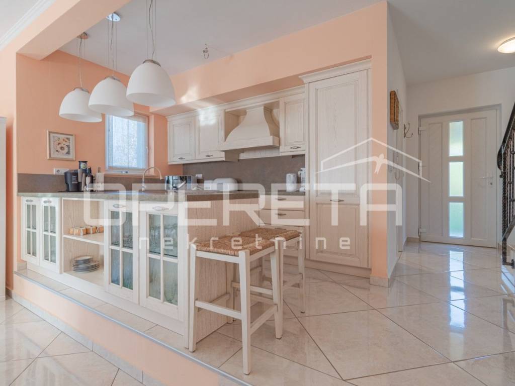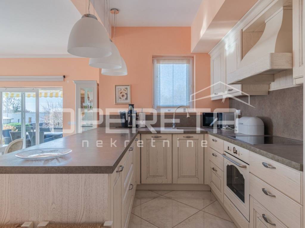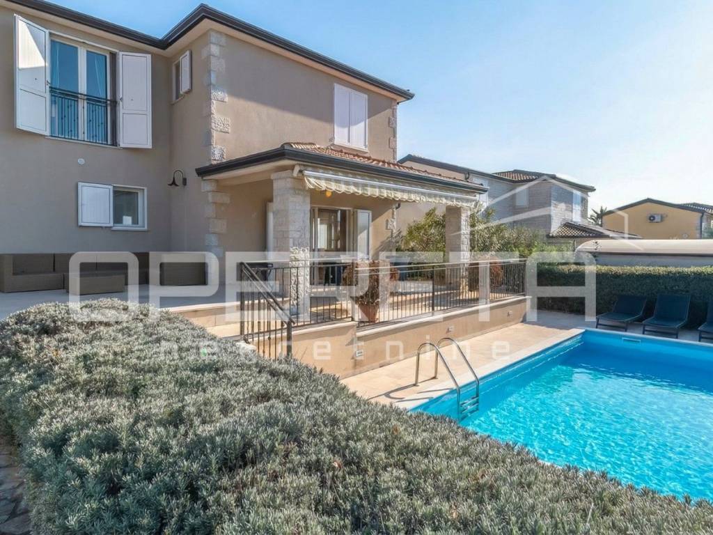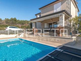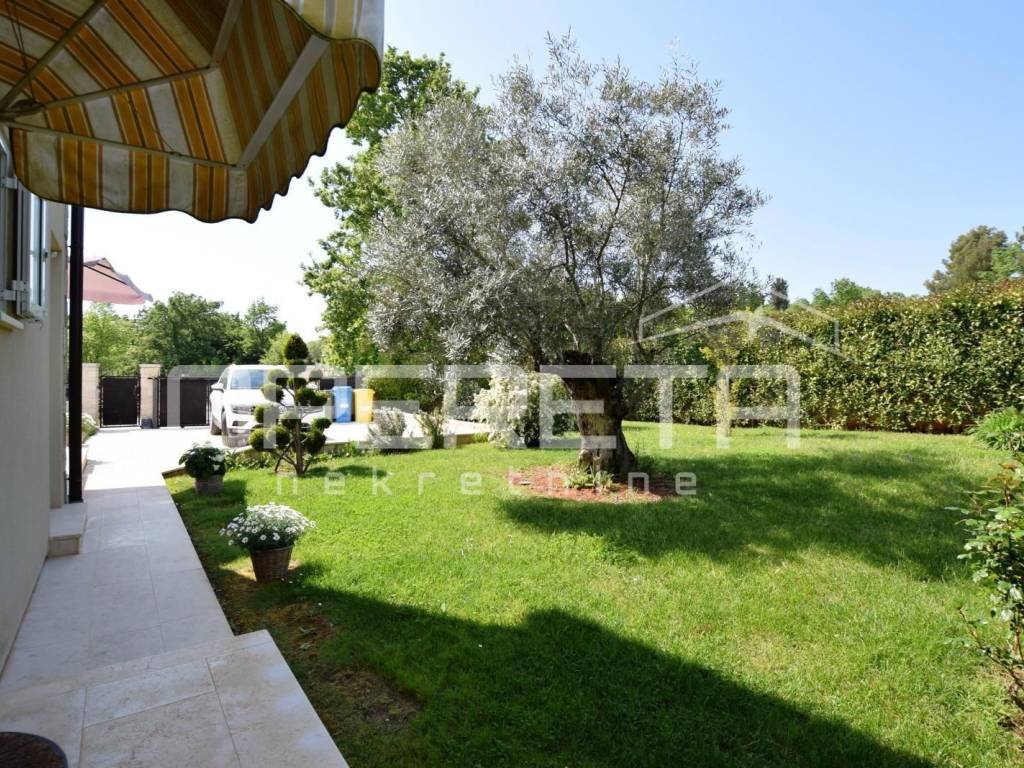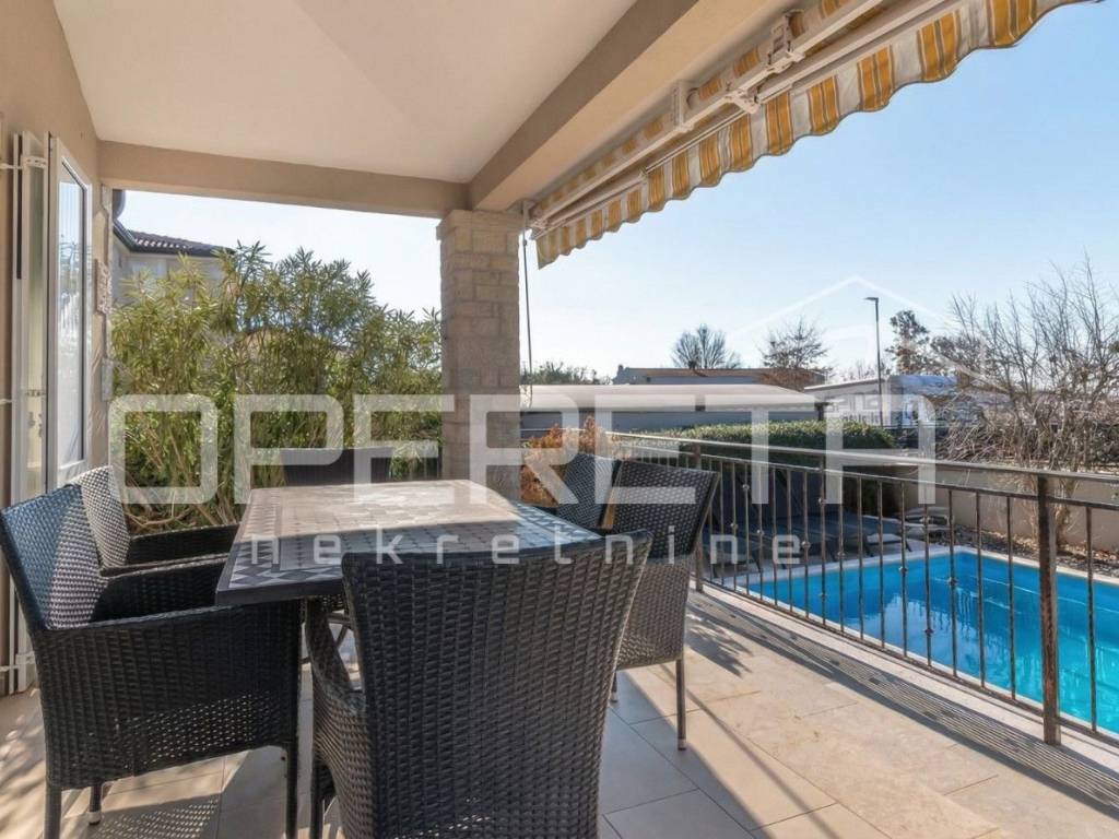 Na prodaju je kuća u mirnom naselju, u okolici Poreča od 145 m2, smještena je na uređenoj parceli od 533 m2. Prizemlje se sastoji od ulaznog hodnika, kuhinje i blagovaonice s izlazom na terasu, dnevnog boravka, male ostave te kupaonice s tušem. Na katu se nalaze tri spavaće sobe i jedna kupaonica s kadom, s kojeg se pruža lijep pogled na more. Za grijanje se koristi podno grijanje na dizalicu topline, uz dodatne klima uređaje za regulaciju temperature. U lijepo uređenom dvorištu nalazi se bazen površine 24 m2 sa sunčalištem i lijepo održavani vrt. Prve plaže udaljene su samo 4-5 km, dok je do centra Poreča potrebno 10-ak minuta vožnje. Nekretnina je idealna za obiteljski život ili turističko iznajmljivanje.
