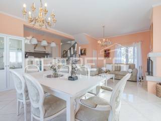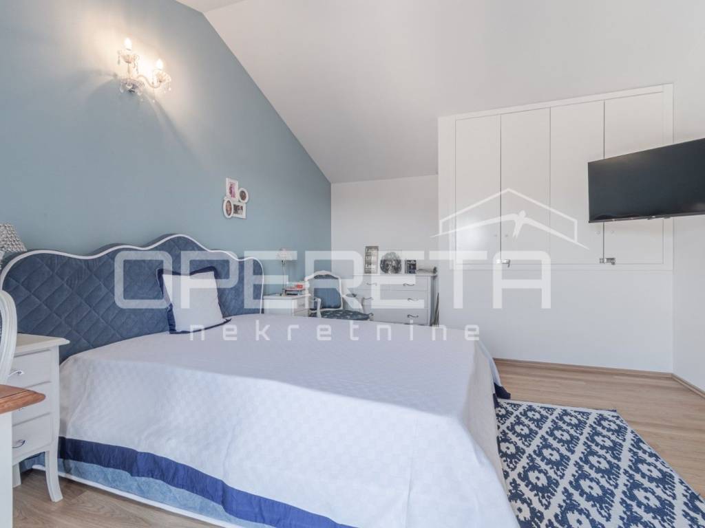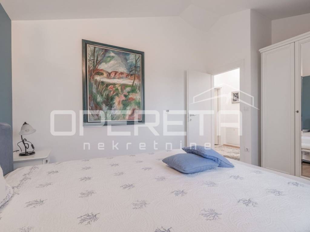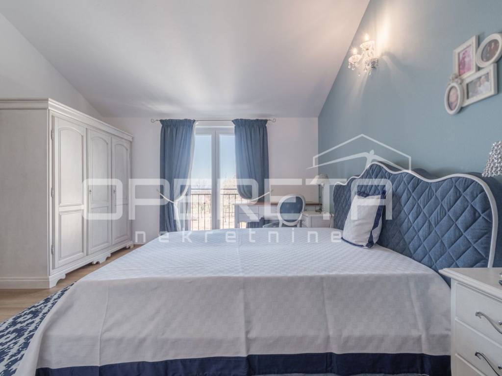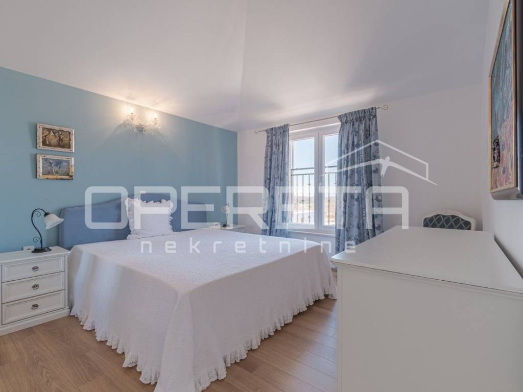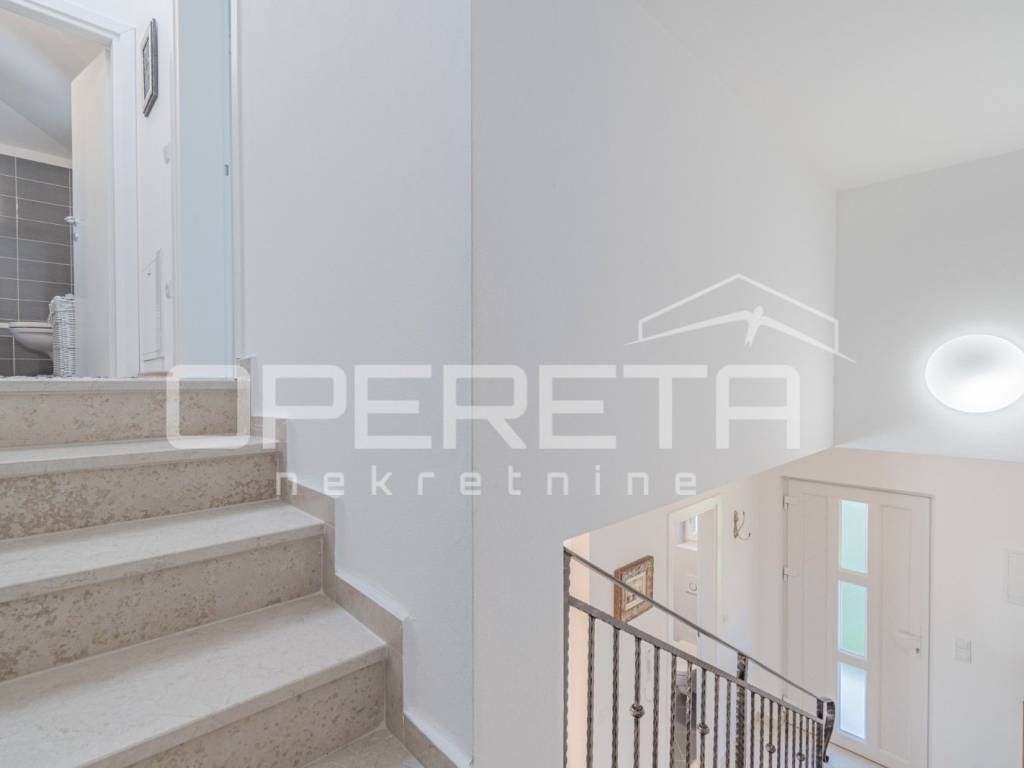 Na prodaju je kuća u mirnom naselju, u okolici Poreča od 145 m2, smještena je na uređenoj parceli od 533 m2. Prizemlje se sastoji od ulaznog hodnika, kuhinje i blagovaonice s izlazom na terasu, dnevnog boravka, male ostave te kupaonice s tušem. Na katu se nalaze tri spavaće sobe i jedna kupaonica s kadom, s kojeg se pruža lijep pogled na more. Za grijanje se koristi podno grijanje na dizalicu topline, uz dodatne klima uređaje za regulaciju temperature. U lijepo uređenom dvorištu nalazi se bazen površine 24 m2 sa sunčalištem i lijepo održavani vrt. Prve plaže udaljene su samo 4-5 km, dok je do centra Poreča potrebno 10-ak minuta vožnje. Nekretnina je idealna za obiteljski život ili turističko iznajmljivanje.