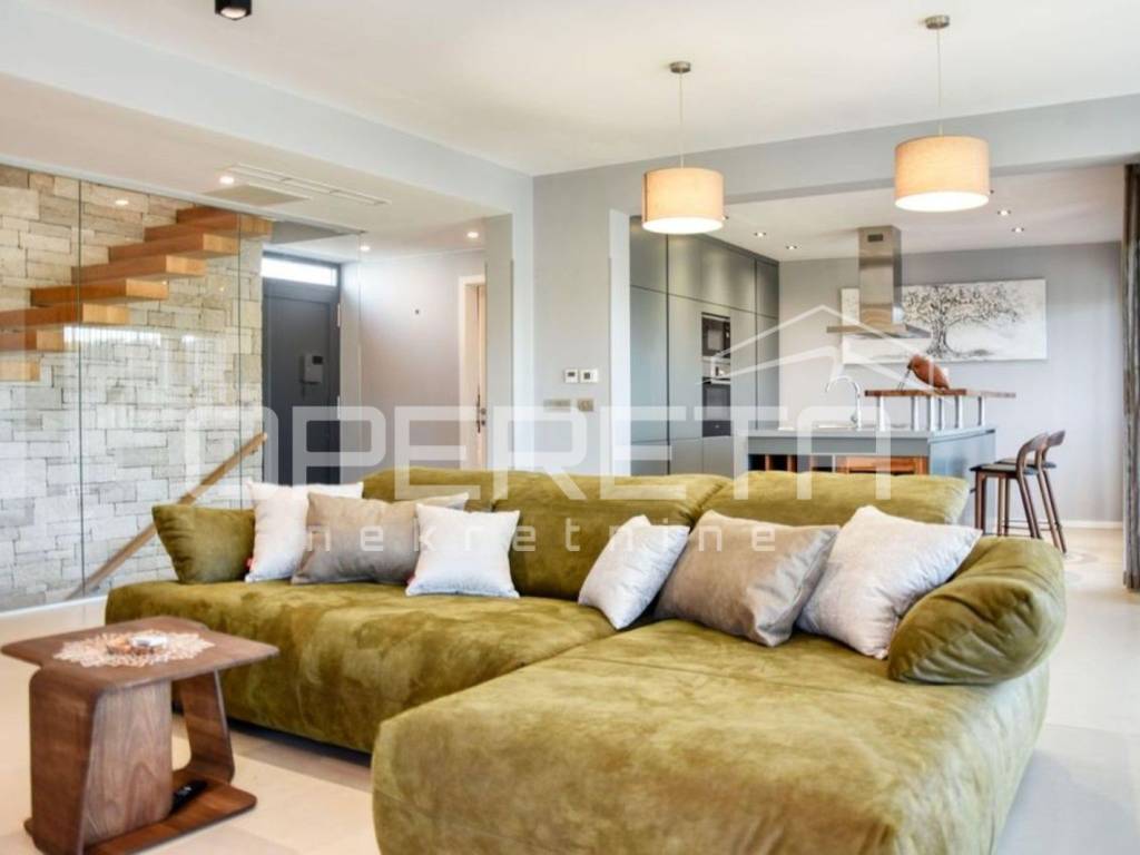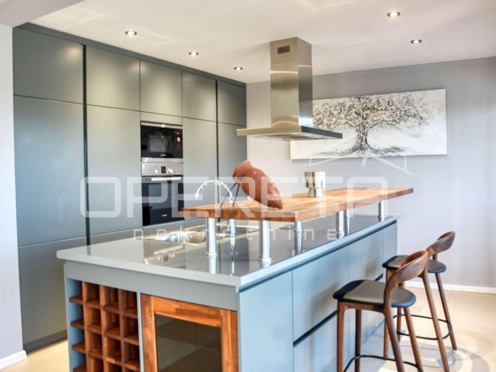 Unutrašnjost vile odiše prostranošću i svjetlošću, a srce prizemlja čini impresivan otvoreni prostor u kojem se isprepliću dnevni boravak, blagovaonica i vrhunska kuhinja s otokom. Cijeli je prostor opremljen pomno biranim dizajnerskim namještajem, dok velike staklene stijene otvaraju pogled prema bazenu i terasi, stvarajući besprijekoran prijelaz između unutarnjeg i vanjskog prostora. Za dodatnu toplinu i ugođaj, u prizemlju se nalazi i kamin na drva, uz praktično riješeno spremište, garderobu i gostinjski toalet.