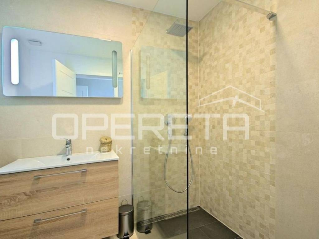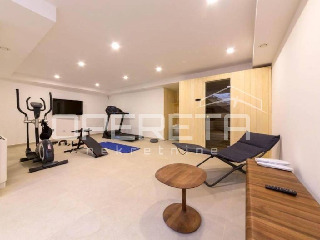 Privatna zona na katu obuhvaća tri luksuzne spavaće sobe, od kojih svaka raspolaže vlastitom kupaonicom, pružajući stanarima maksimalan komfor i privatnost. Dodatnu vrijednost čine dvije terase na katu, idealne za mirne trenutke opuštanja. Za potpuni wellness doživljaj, vila u suterenu krije privatnu oazu opremljenu saunom, tušem i potpuno opremljenim fitness dijelom, dok se na kruni kuće prostranoj krovnoj terasi nalazi jacuzzi s panoramskim pogledom na more i nezaboravne zalaske sunca.