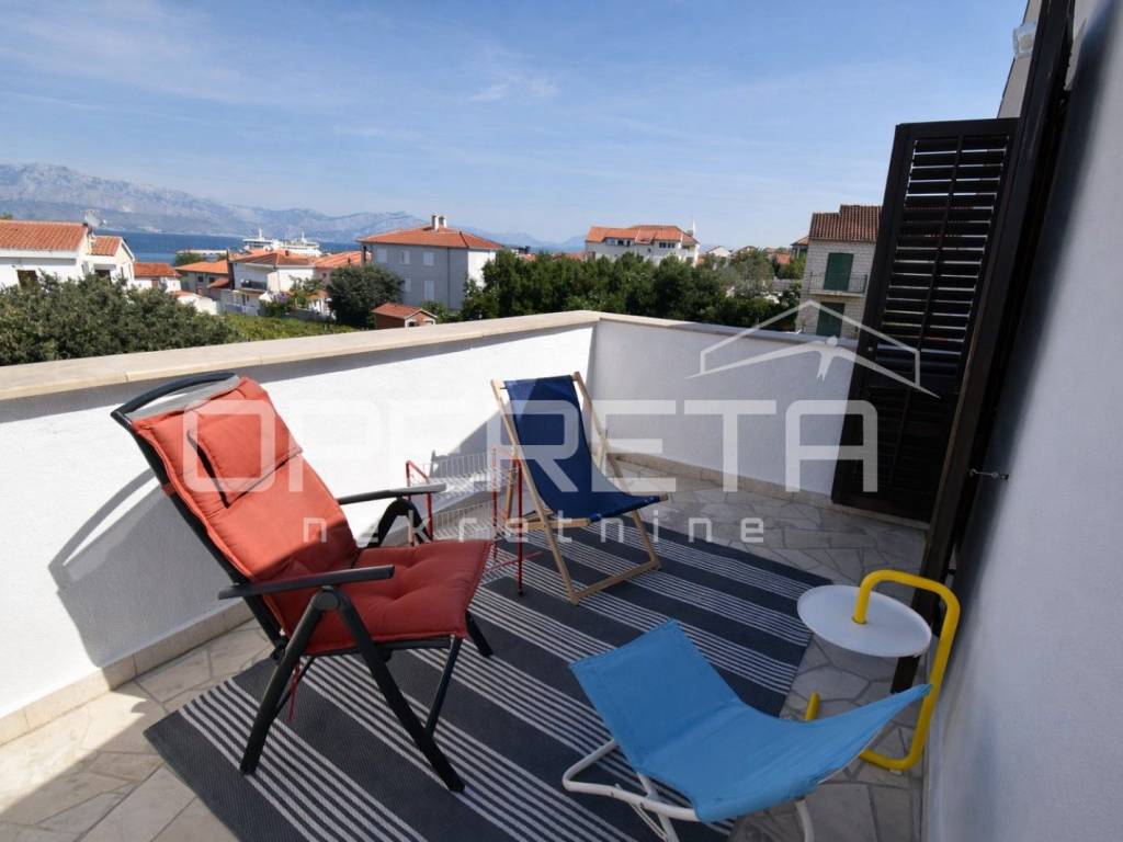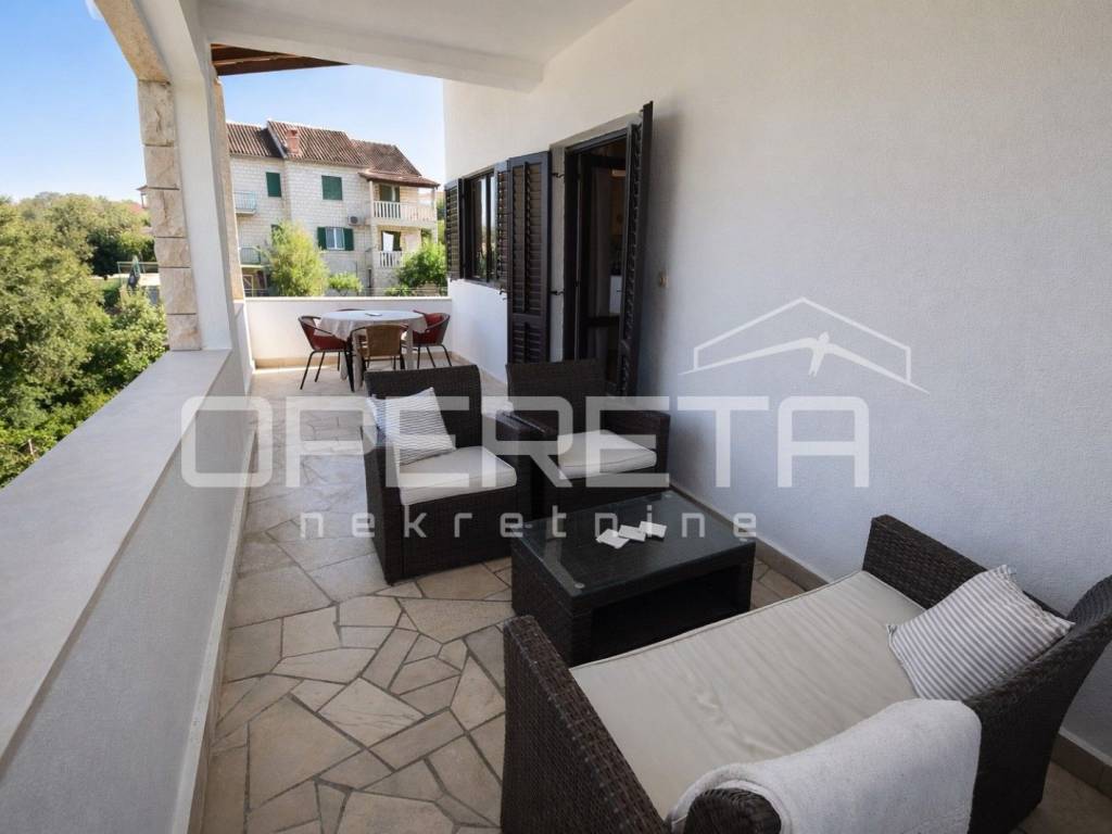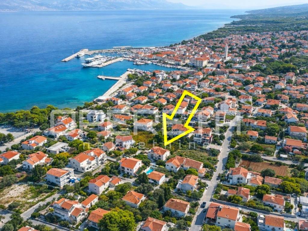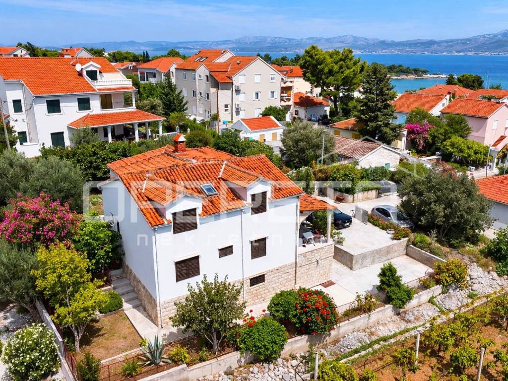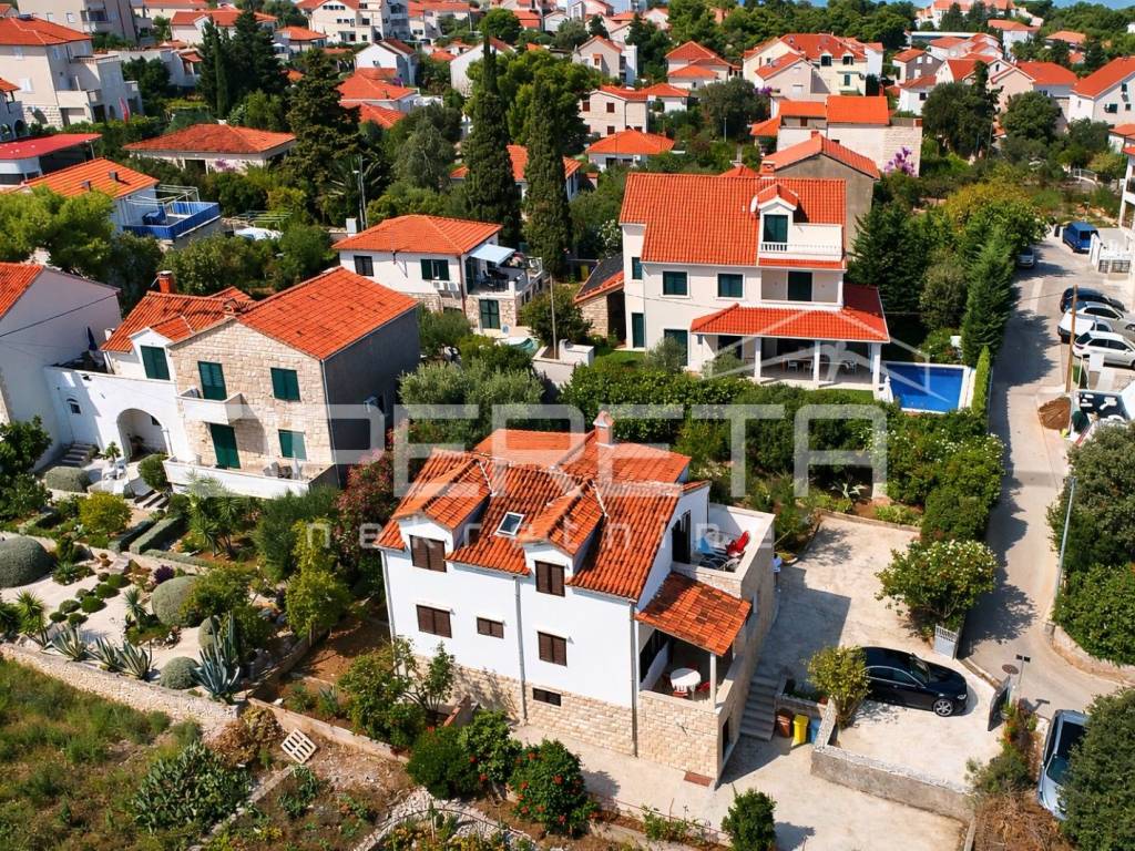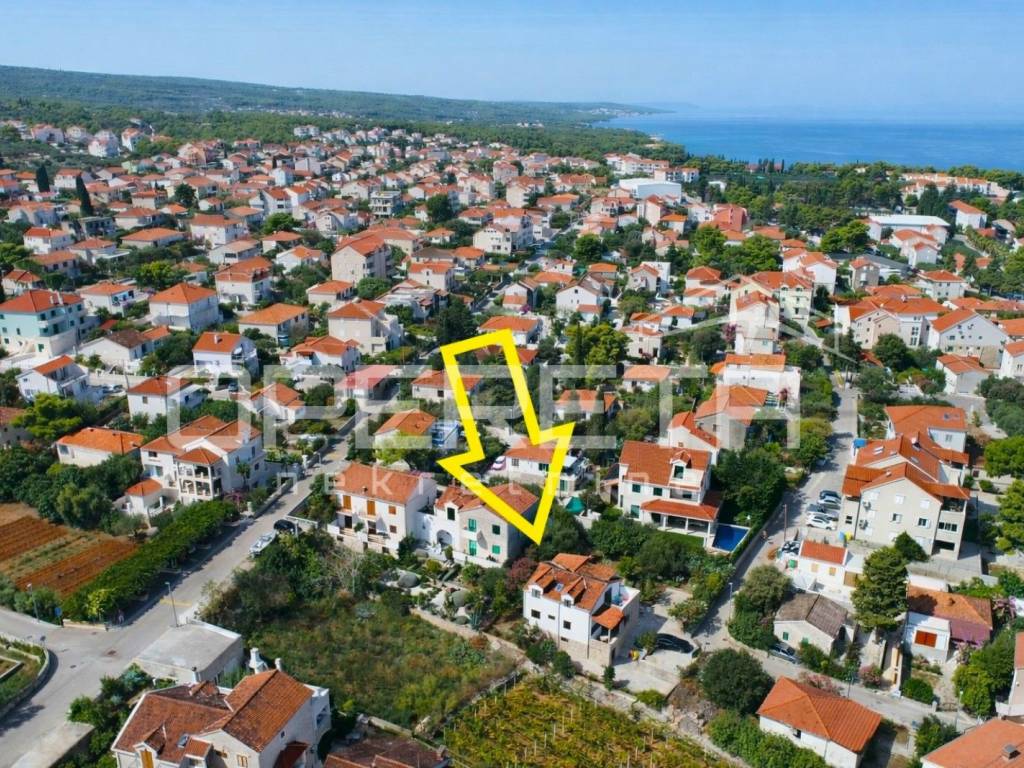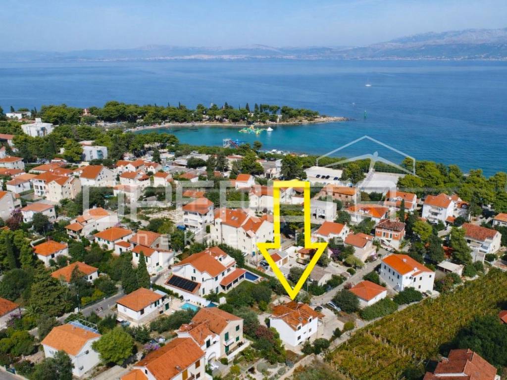 Postojeća zgrada sastoji se od dvije samostalne stambene jedinice (apartmana), svaka s 2 spavaće sobe, kupaonicom i prostranim dnevnim prostorom s kuhinjom i blagovaonicom. Svaka jedinica ima vlastiti ulaz te izlaz na terasu ili balkon s djelomičnim pogledom na more. Gornja terasa pruža neometan i spektakularan pogled koji se proteže od Splita, preko Dugog Rata pa sve do daljine. Prizemlje uključuje i tri dodatne prostorije, uključujući i onu smještenu ispod stubišta, koje se mogu prenamijeniti u pomoćne sadržaje (recepcija, spremište, wellness zona, ured).