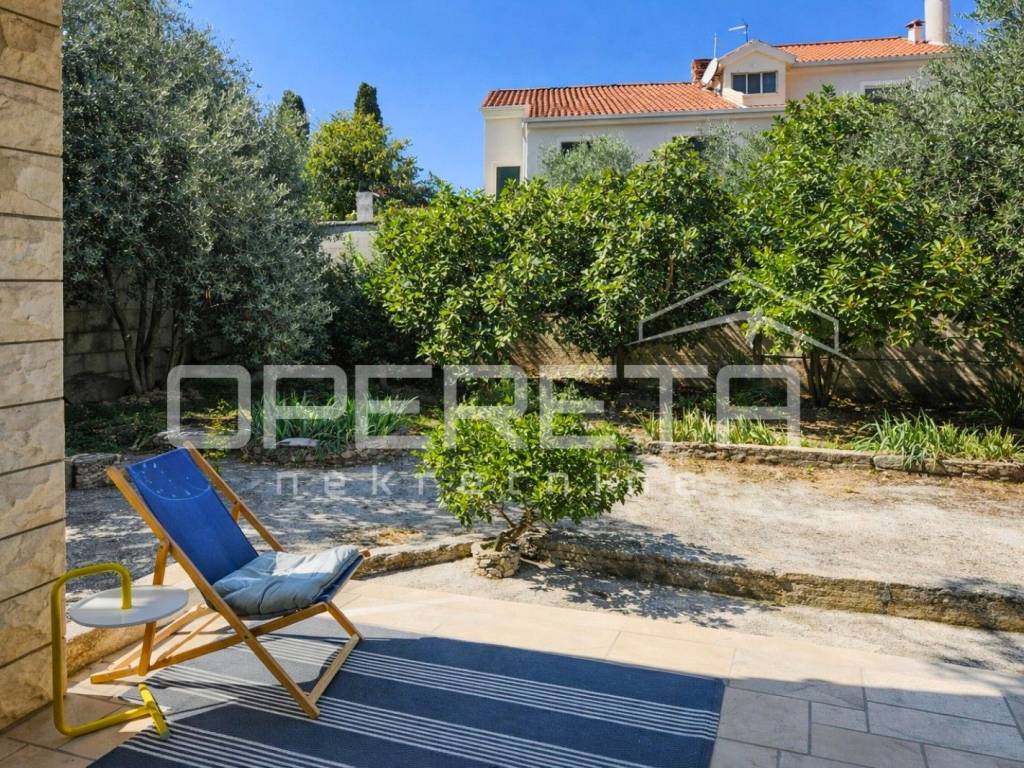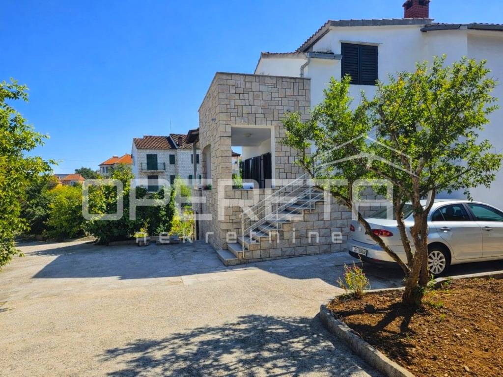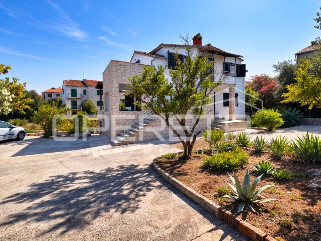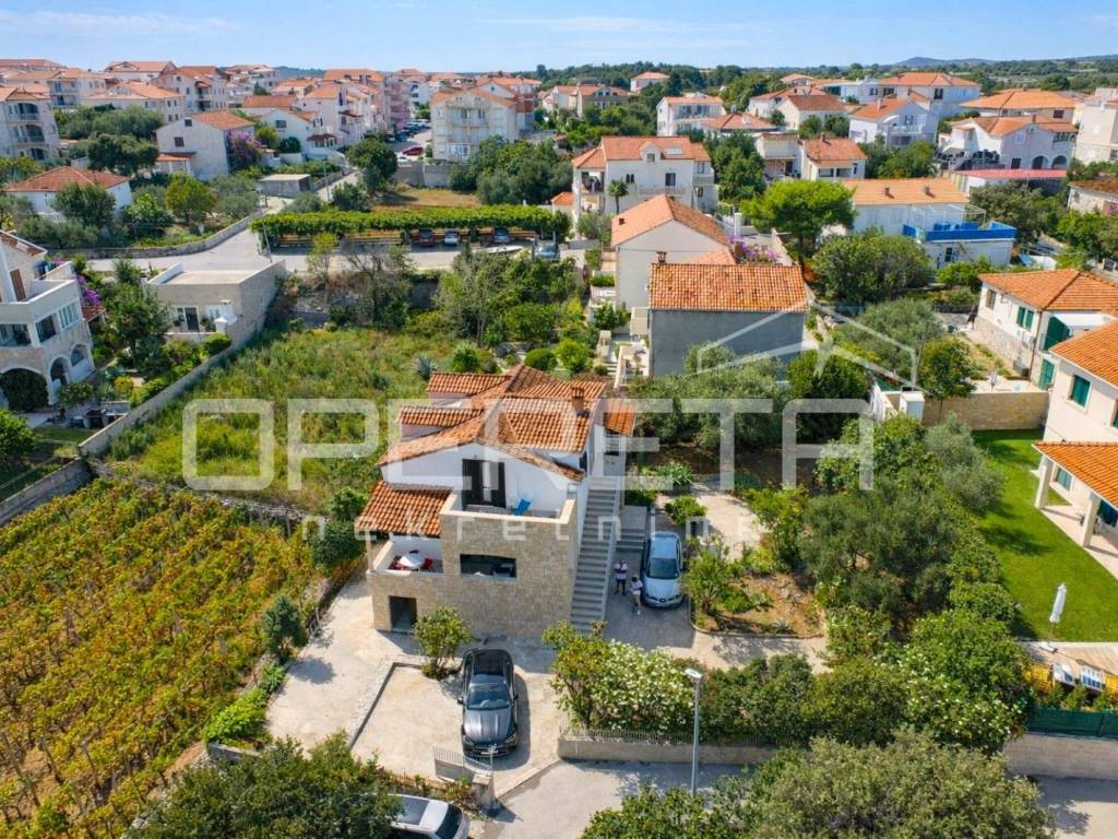 Oko kuće se prostire kultivirani vrt s maslinama, smokvama, oleandrima i mediteranskim raslinjem, dok se s jedne strane parcela graniči s poljoprivrednim zemljištem (vinograd), što dodatno jamči mir i pogled koji ostaje netaknut.