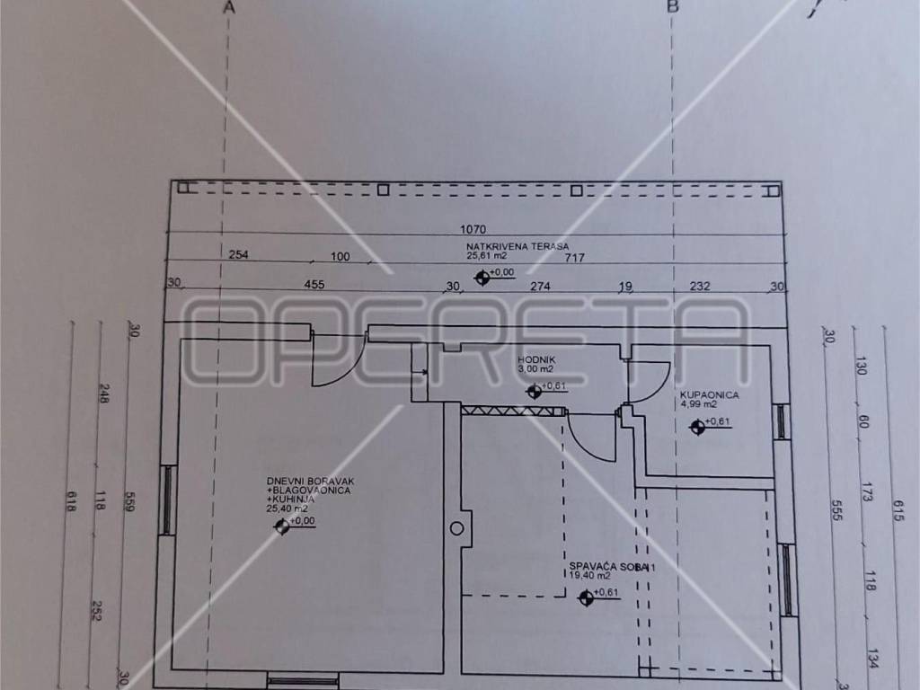 U prizemlju se nalazi ulazni hodnik, kuhinja sa blagovaonicom, kupaonica sa wc-om, spavaća soba te natkrivena terasa.