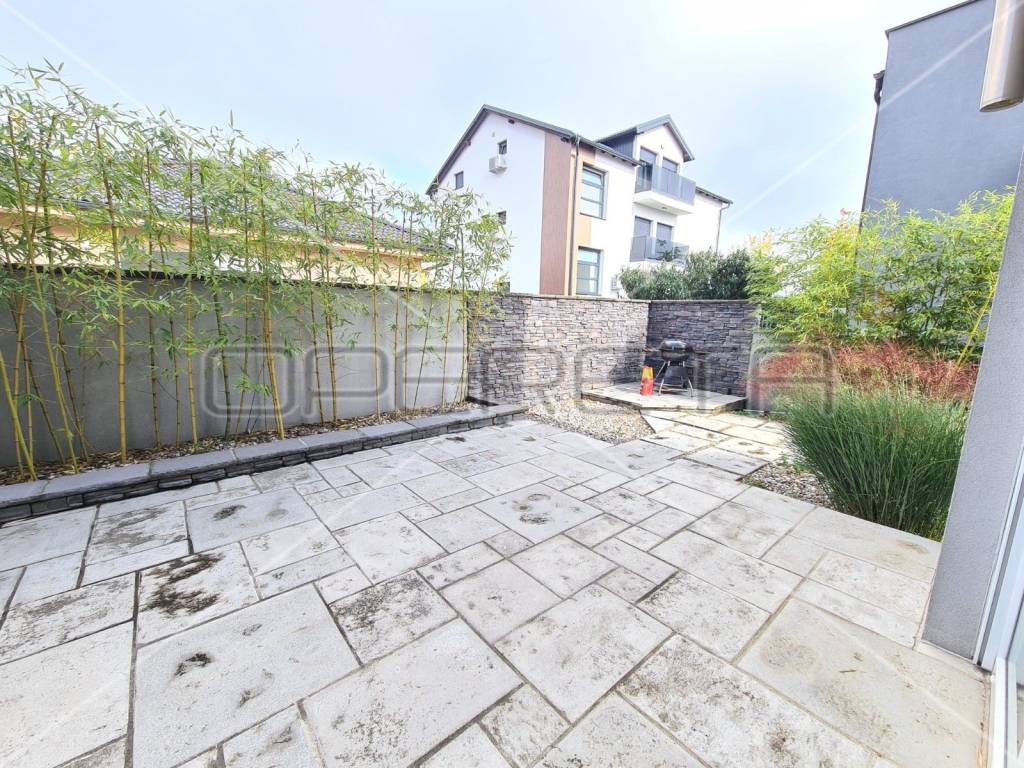 Dvorišni prostor je u potpunosti uređen zelenilom, te automatskim sustavom za navodnjavanje. Dva parkirna mjesta se nalaze u dvorištu kuće.