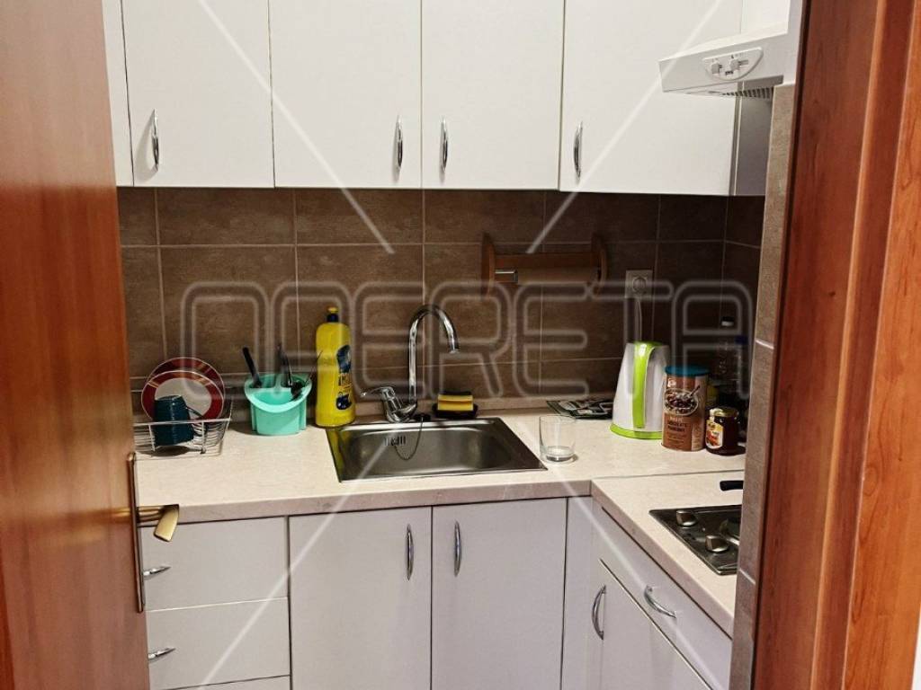 Kuhinja je manjih dimenzija, ali je opremljena svim potrebnim uređajima, uključujući sudoper, radnu ploču te ormariće za odlaganje, što je čini idealnom za svakodnevnu pripremu obroka. Kupaonica je opremljena toaletom i umivaonikom, a dobro je održavana i dovoljno prostrana za pohranu higijenskih potrepština.