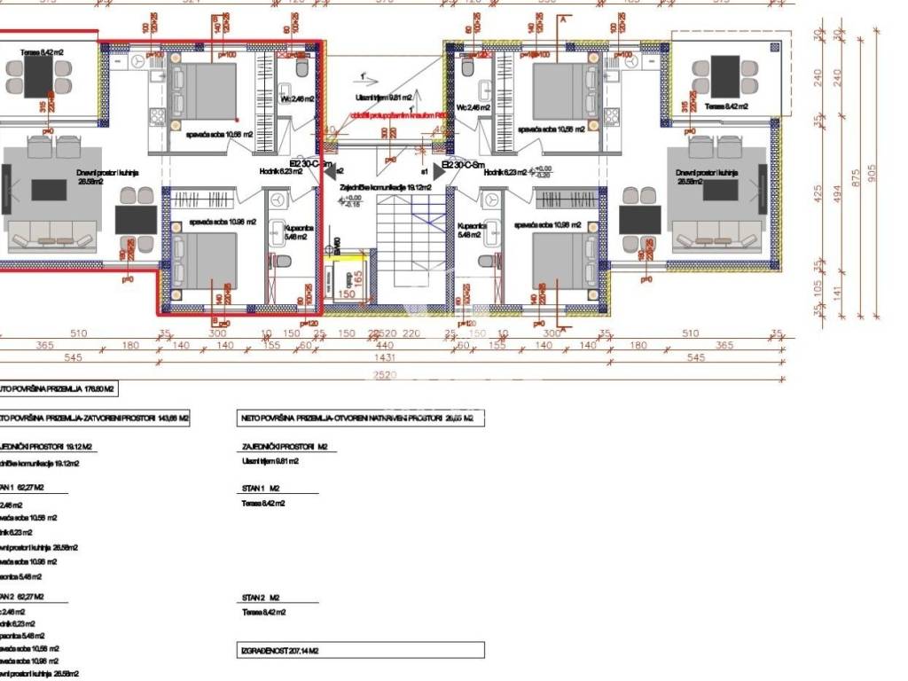 Stambena zgrada projektirana je od phoroterm cigle debljine 25 cm. Fasadna obloga je izvedena s termo izolacijom debljine 10 cm (kamena vuna). Vanjska stolarija je od visokokvalitetnog višekomornog PVC-a. Grijanje je podno (dnevni boravak, kuhinja i kupatilo) dok je hlađenje na klima jedinice. Stanu pripadaju 2 parkirna mjesta.
