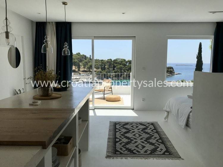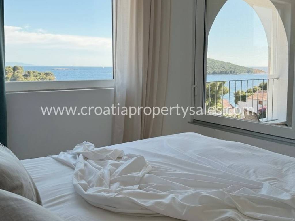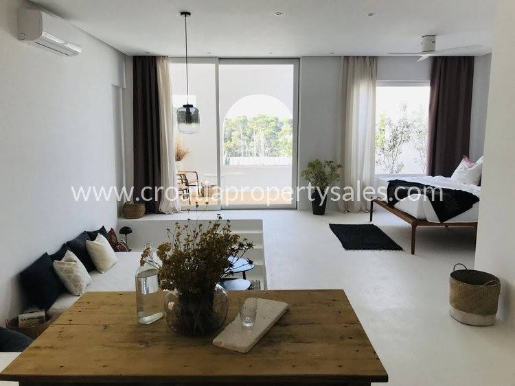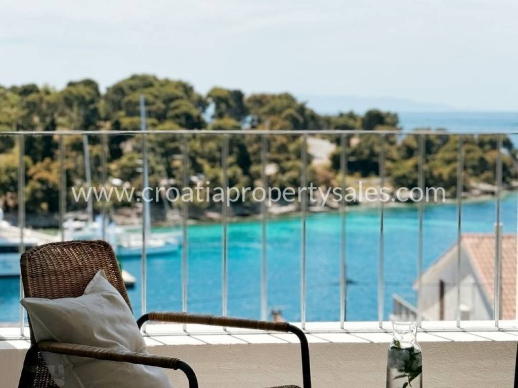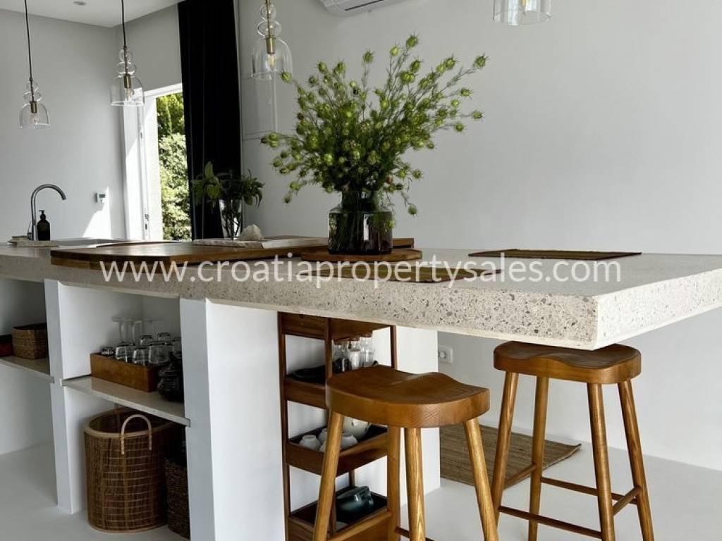 Prelijepa vila u mediteranskom stilu na jedinstvenoj lokaciji na otoku. Na 433 m2 na savršeno su raspoređene tri etaže sa ukupno 200 m2 stambenog prostora. Vila se sastoji od četiri luksuzna apartmana pa može biti odlična investicija u turizmu, ali može biti i predivna obiteljska vila za stanovanje. Na prizemlju se nalazi dodatni prostor za stanovanje sa prostranim mediteranskim dvorištem i velikom vanjskom ljetnom kuhinjom.Na prvom i drugom katu se nalaze po dva apartmana, svaki sa svojom kupaonicom i balkonom sa pogledom na bajkovitu uvalu i more. Vila je izgrađena 2024 g. u jedinstvenom i modernom stilu, obasjana sunčevom svjetlošću, prozračna i uređena sa velikom ljubavlju inspirirana predivnim idejama te kompletno uređena i opremljena stilskim namještajem. Dva parkirna mjesta se nalaze iznad kuće, dva dodatna mjesta na južnoj strani. Nalazi se na mirnoj lokaciji na južnom dijelu malog, ali posebnog mjesta. Šljunčana plaža nalazi se na samo 3 minute hoda, kao i centar mjesta u kojem se nalaze trgovine, restorani i šetnica.