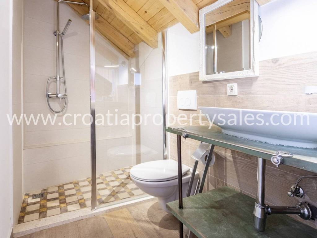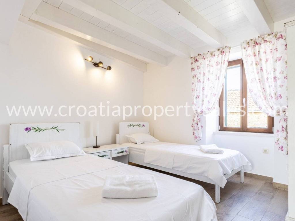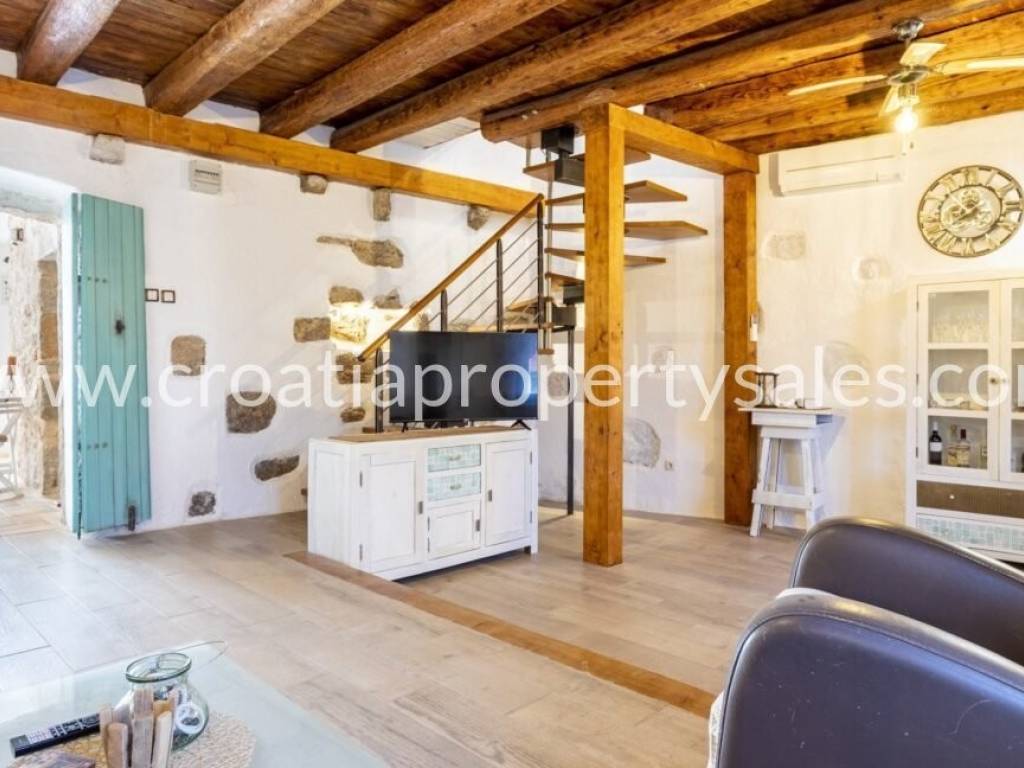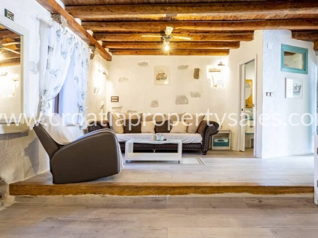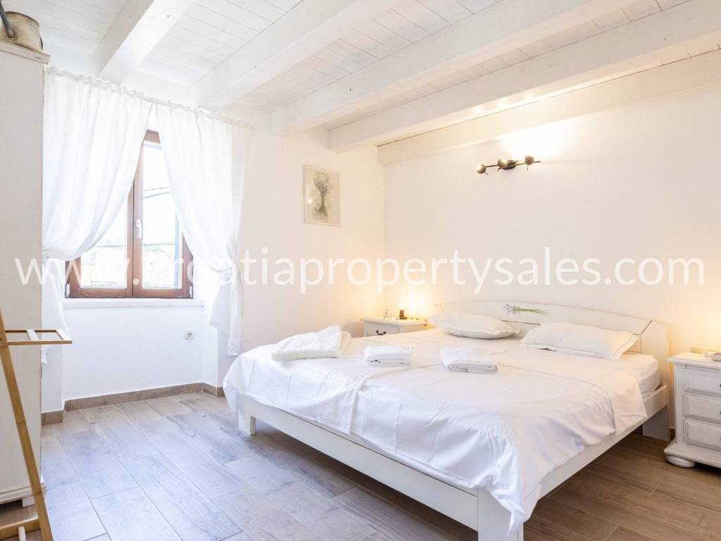 Unutarnje stubište vodi na gornji kat, gdje se nalaze dvije spavaće sobe i kupaonica, s pristupom prekrasnoj terasi s jacuzzijem.