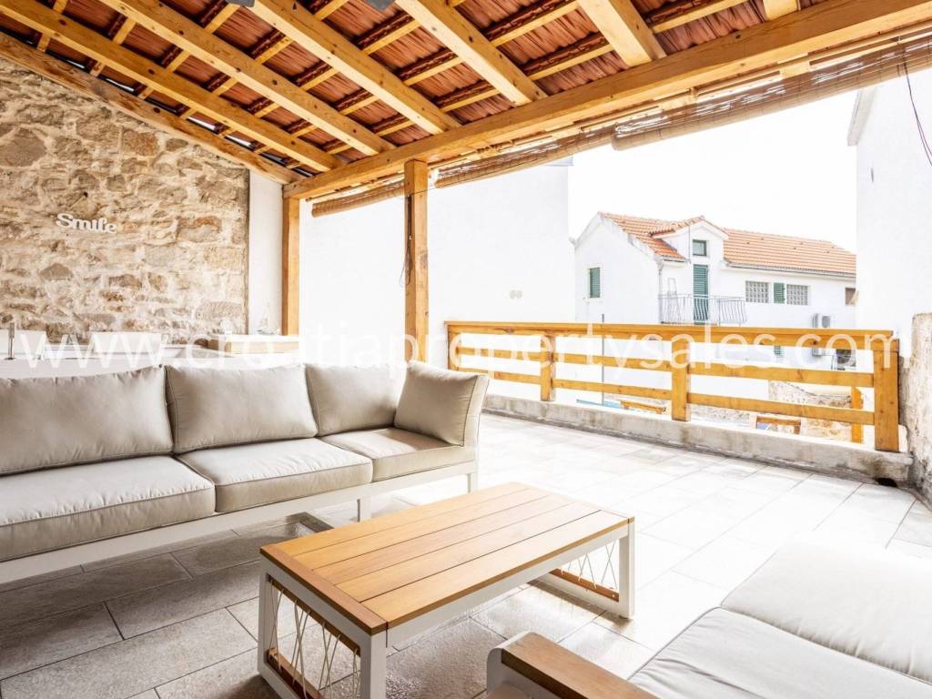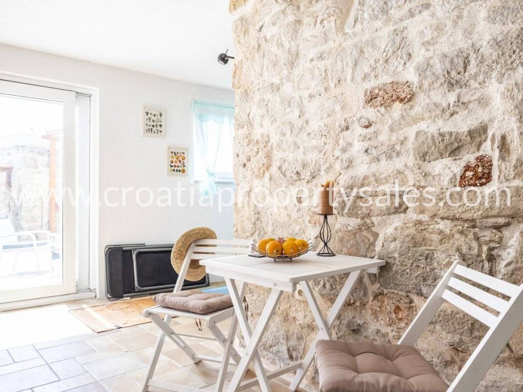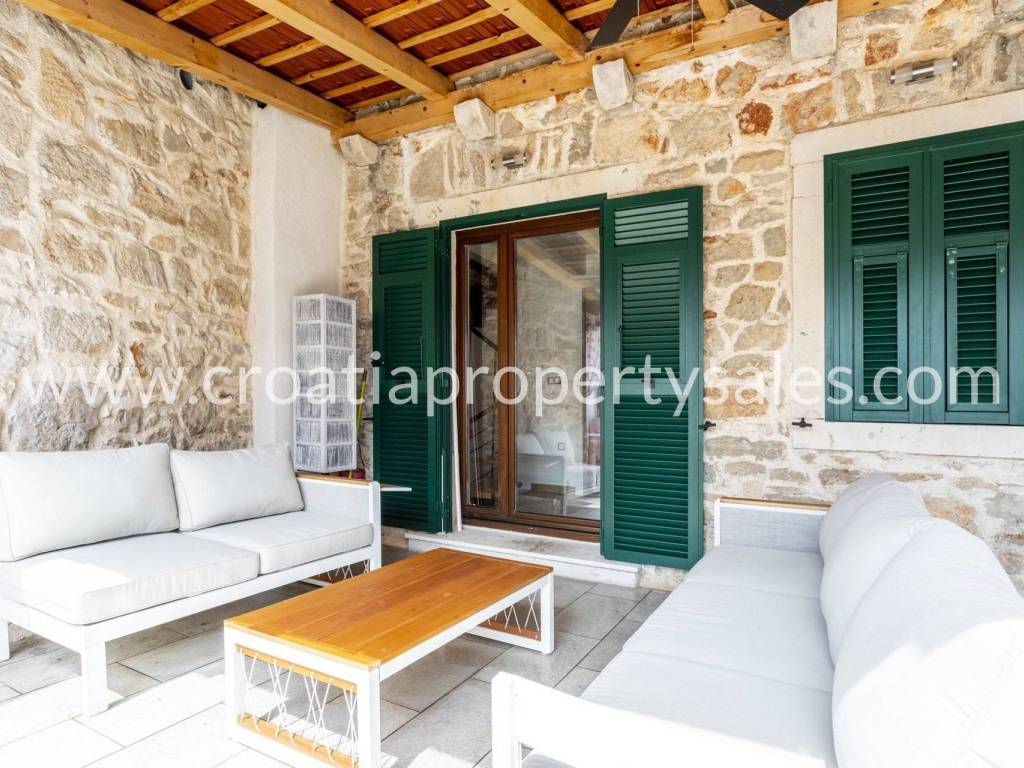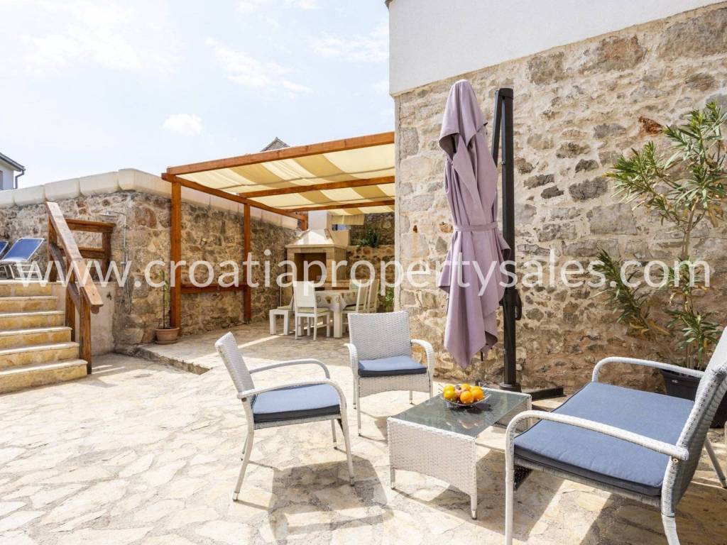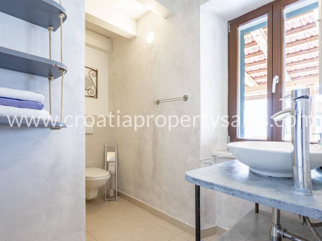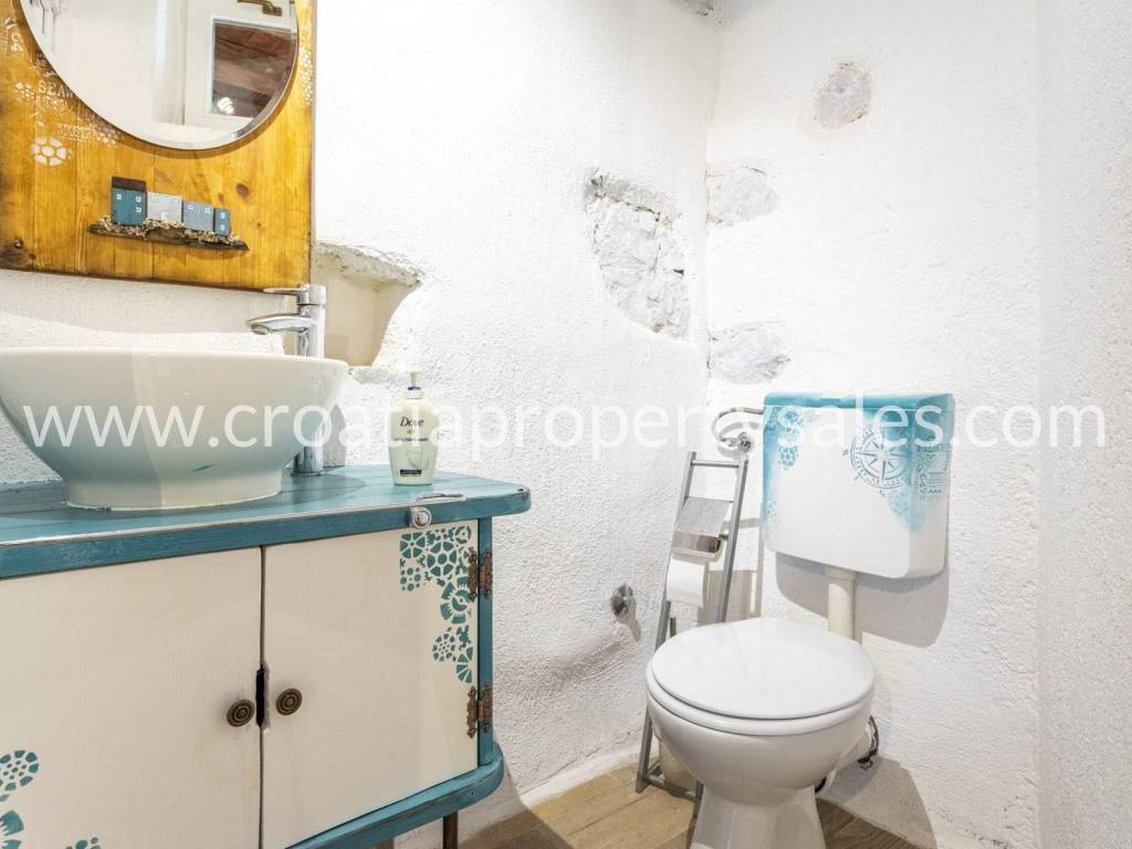 Unutarnje stubište vodi na gornji kat, gdje se nalaze dvije spavaće sobe i kupaonica, s pristupom prekrasnoj terasi s jacuzzijem.