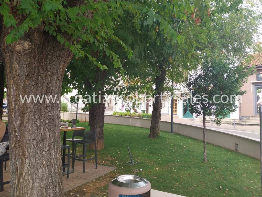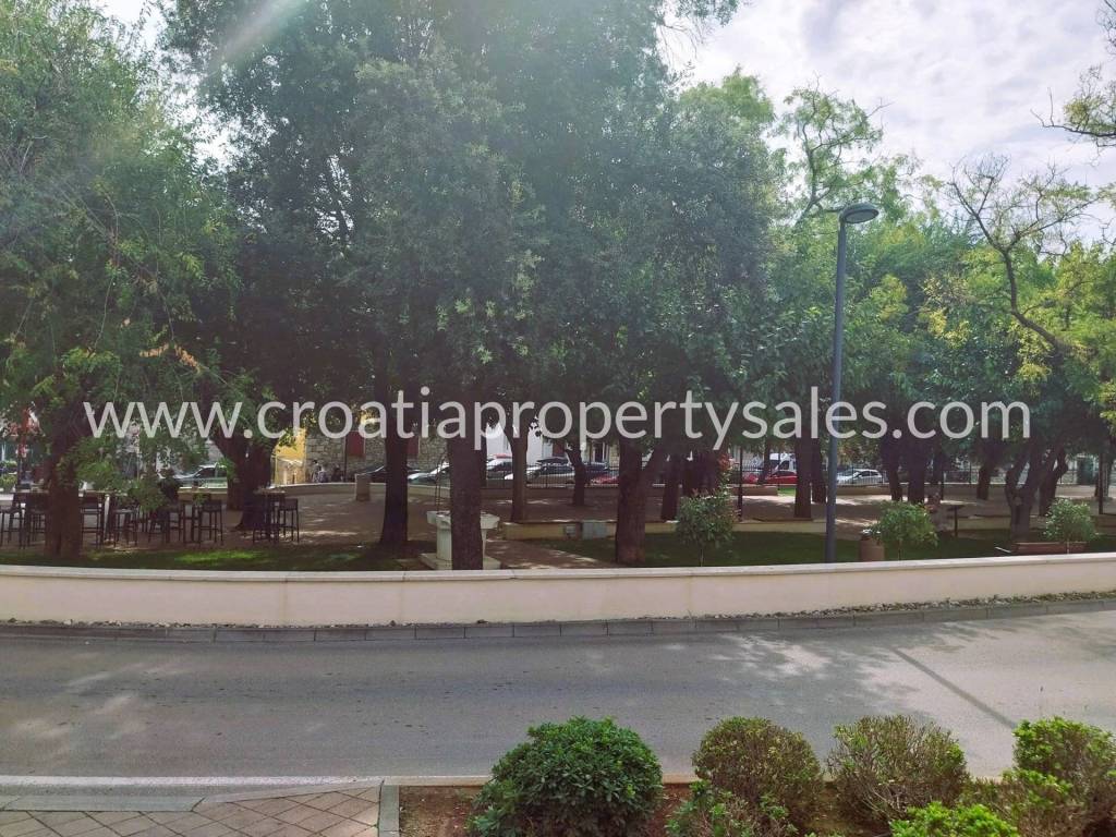 Pogled se pruža na prekrasan park s puno zelenila, a nekoliko metara udaljeni su kafić i frizerski salon.